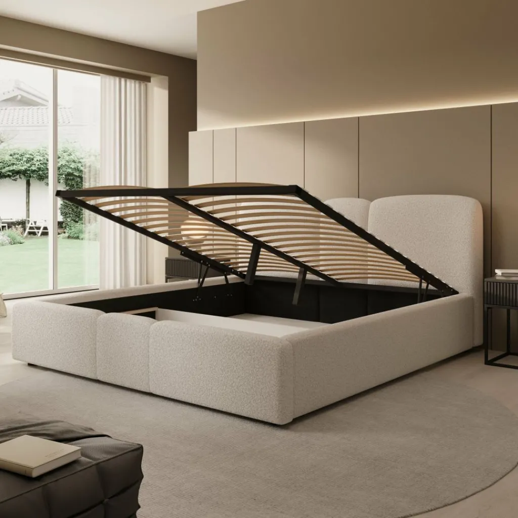 Onder de lattenbodem bevindt zich een ruime opbergbox die eenvoudig bereikbaar is dankzij het liftsysteem. De lattenbodem kan omhoog worden geklapt, waardoor er extra ruimte ontstaat voor het opbergen van bijvoorbeeld beddengoed, kussens of dekens. Het bed wordt geleverd inclusief lattenbodem en is geschikt voor een matras van 180×200 cm. Het matras wordt niet meegeleverd.