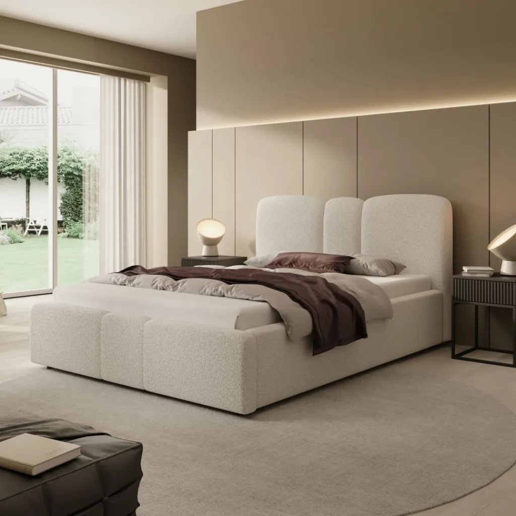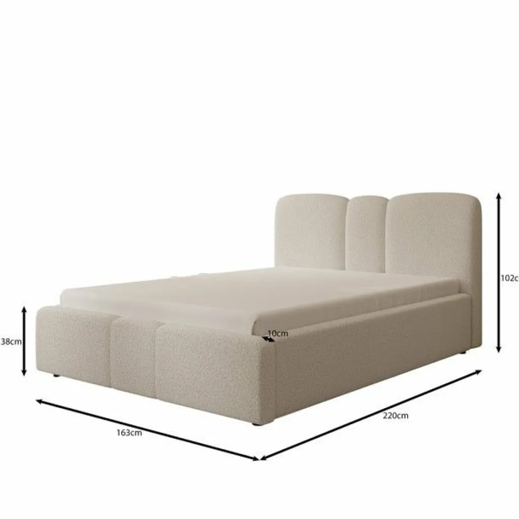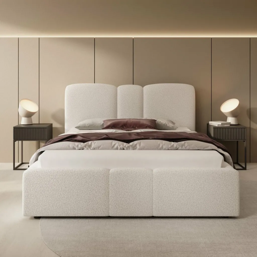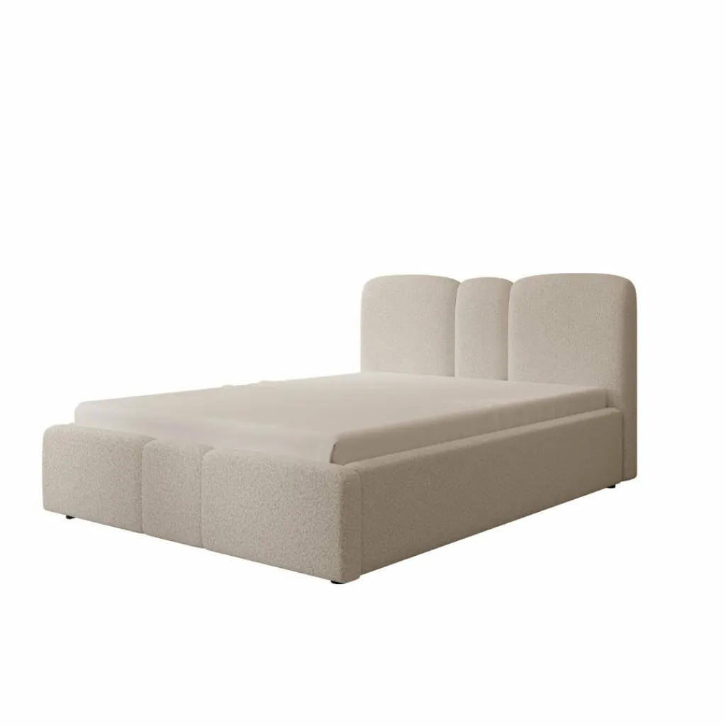 Het bed is bekleed met beige teddystof en heeft een hoofdbord met drie afgeronde, gestoffeerde panelen. Ook het voetbord heeft een afgeronde vormgeving, wat zorgt voor een samenhangend geheel. De combinatie van de zachte bekleding en de afgeronde vormen geeft het bed een moderne uitstraling.