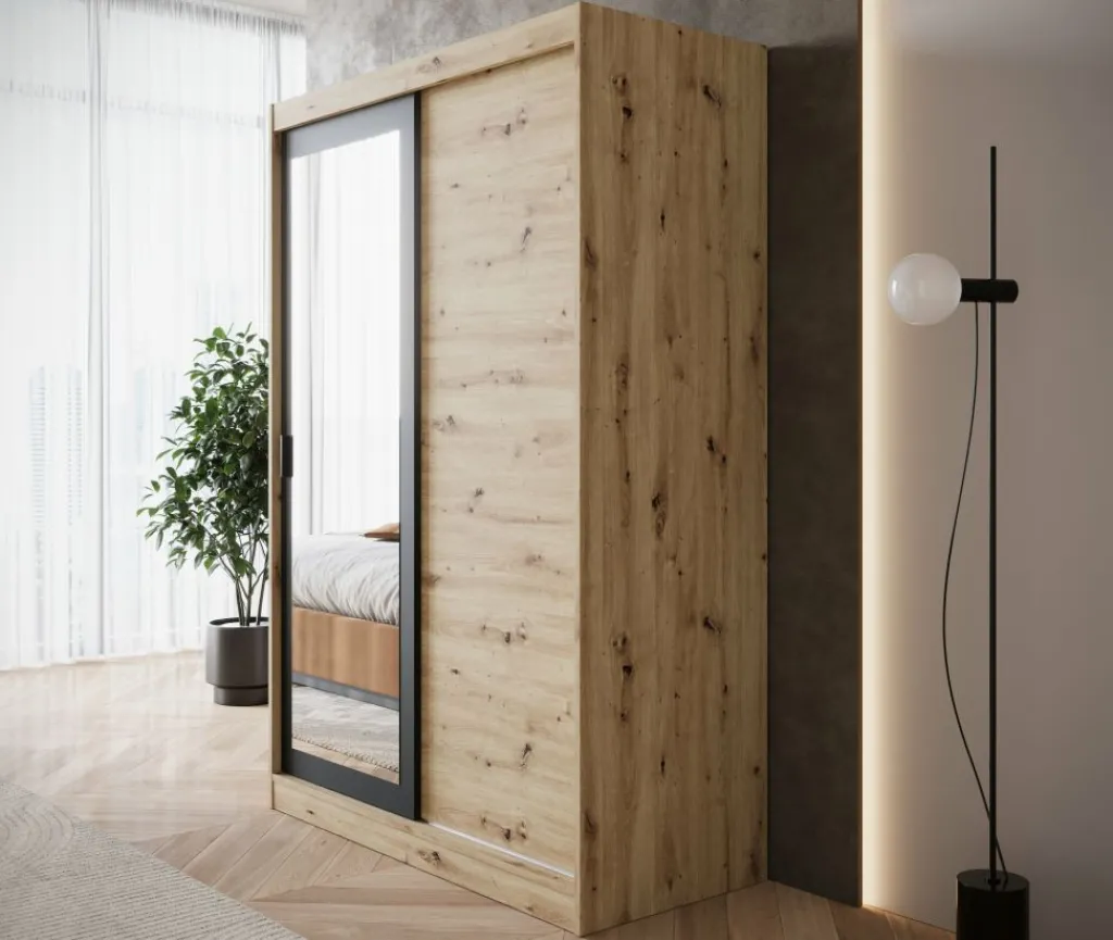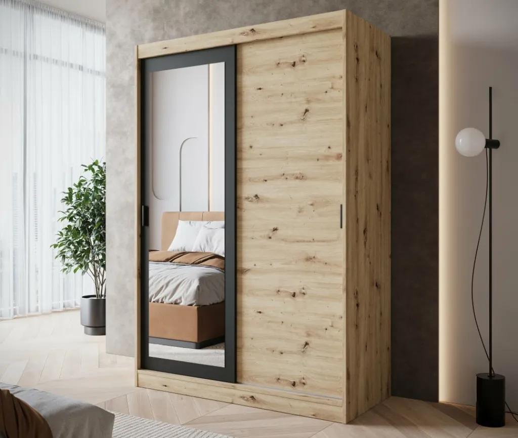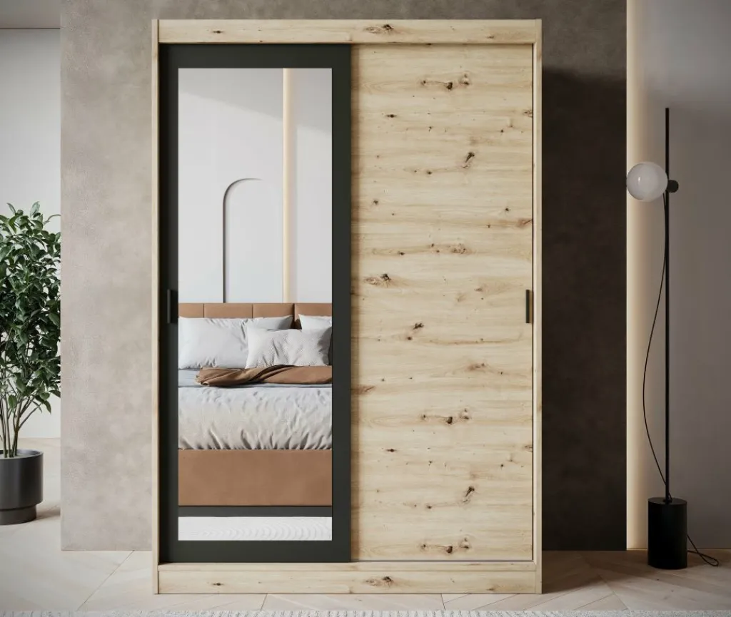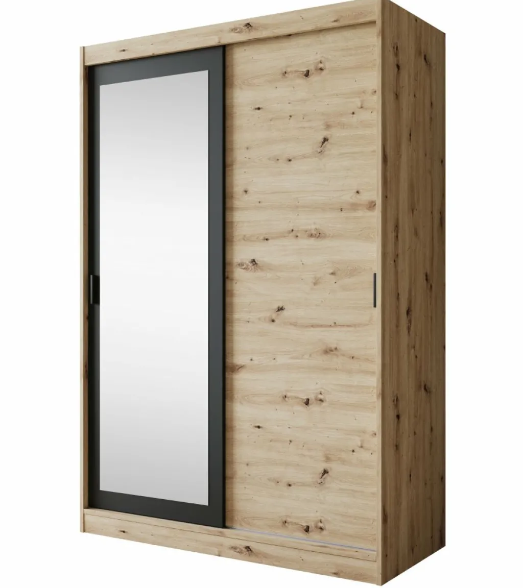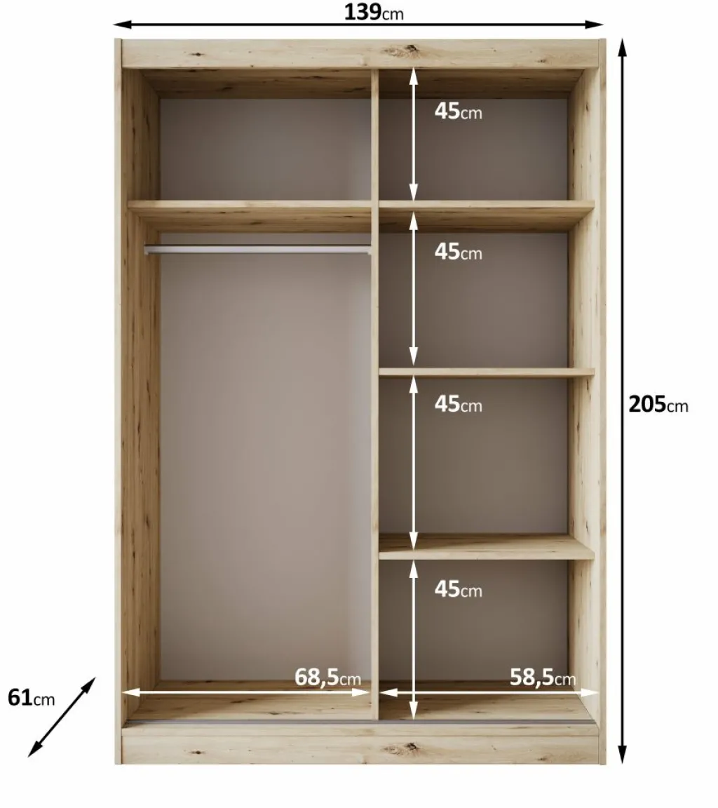 Kledingkast Olly is een garderobekast met ruime opbergmogelijkheden, uitgevoerd in een eiken kleur. De kast beschikt over 2 schuifdeuren die openen met zwarte handgrepen. De linkerdeur is voorzien van een handige spiegel. De binnenkant van de kast bestaat uit 5 opbergvakken en 1 kledingroede.