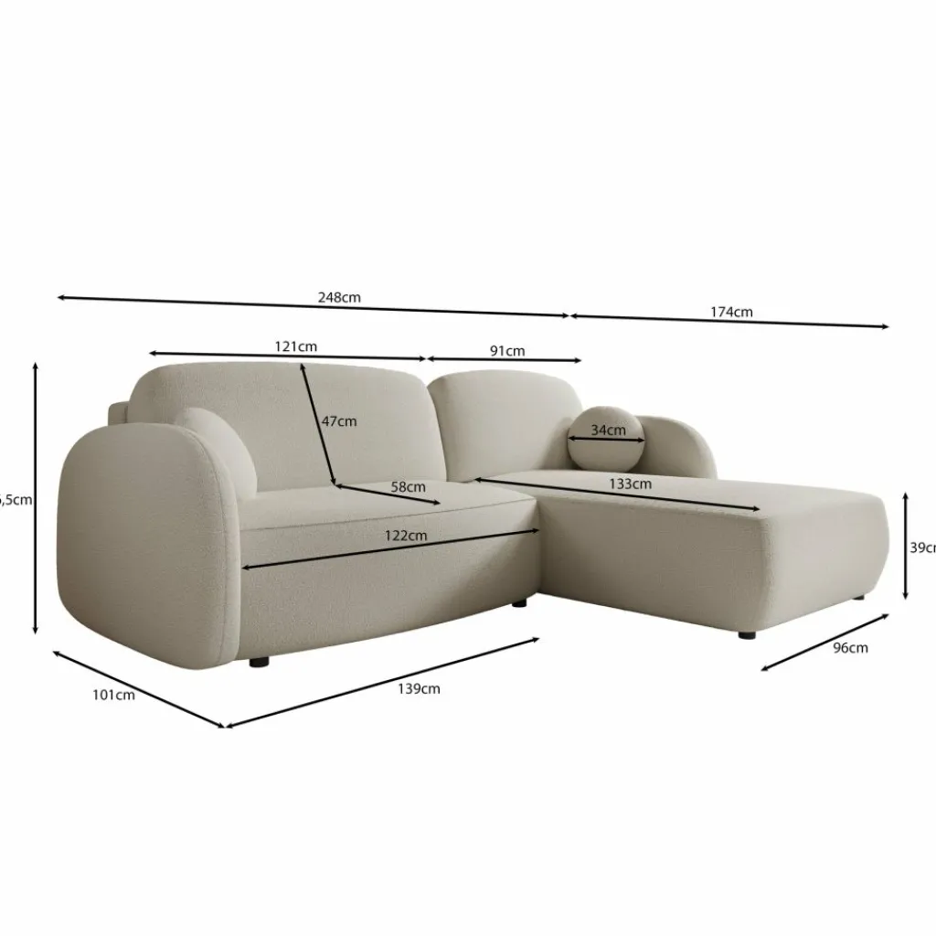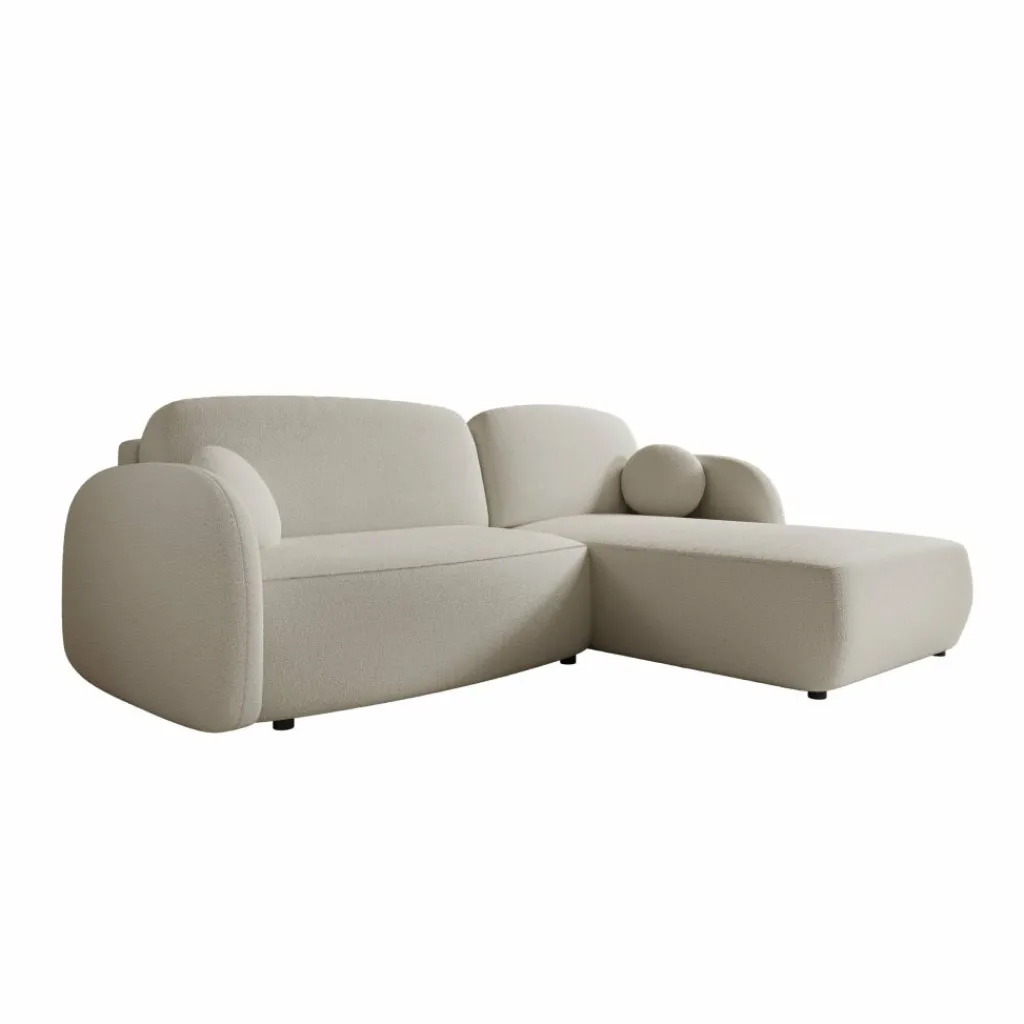 De Ometa hoekbank in witte teddystof heeft een hoekopstelling met een chaise longue aan de rechterzijde. De bank bestaat uit een zitgedeelte met losse rug- en zitkussens en een brede loungezone die extra zit- en ligruimte biedt.