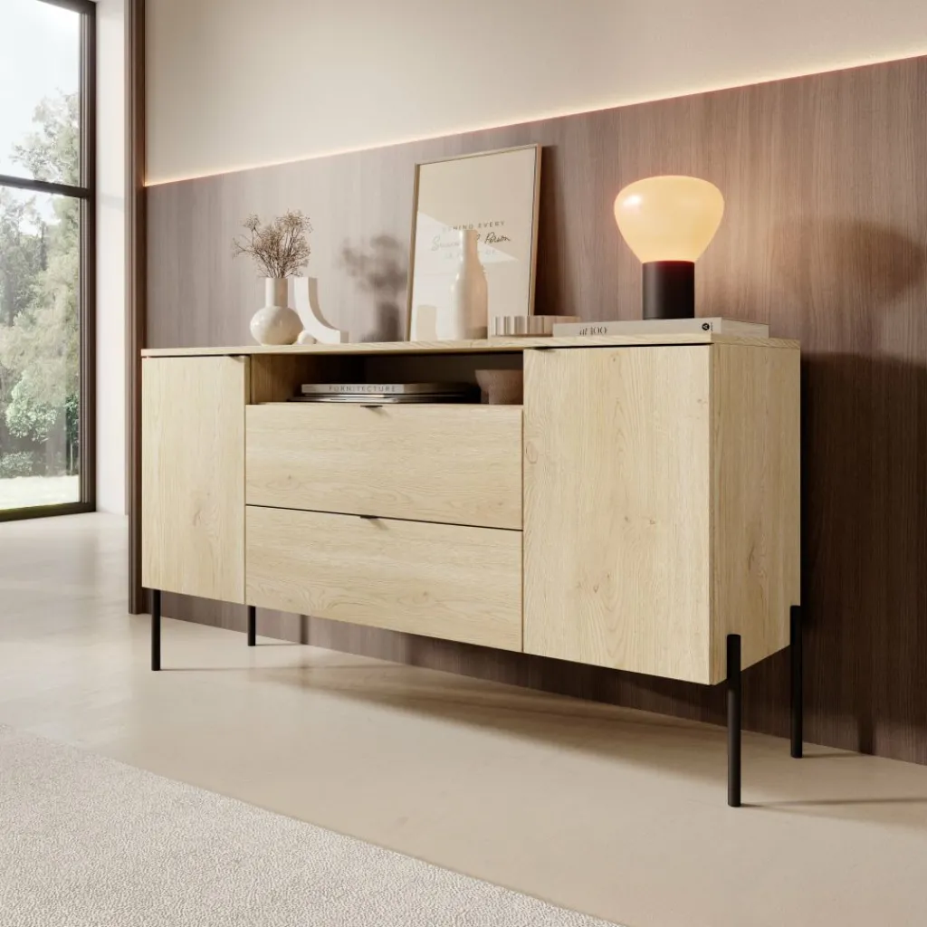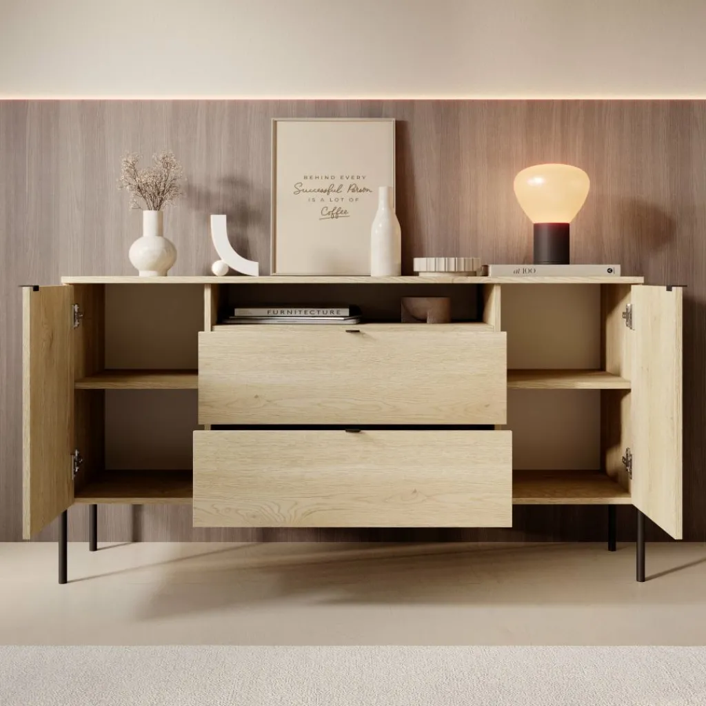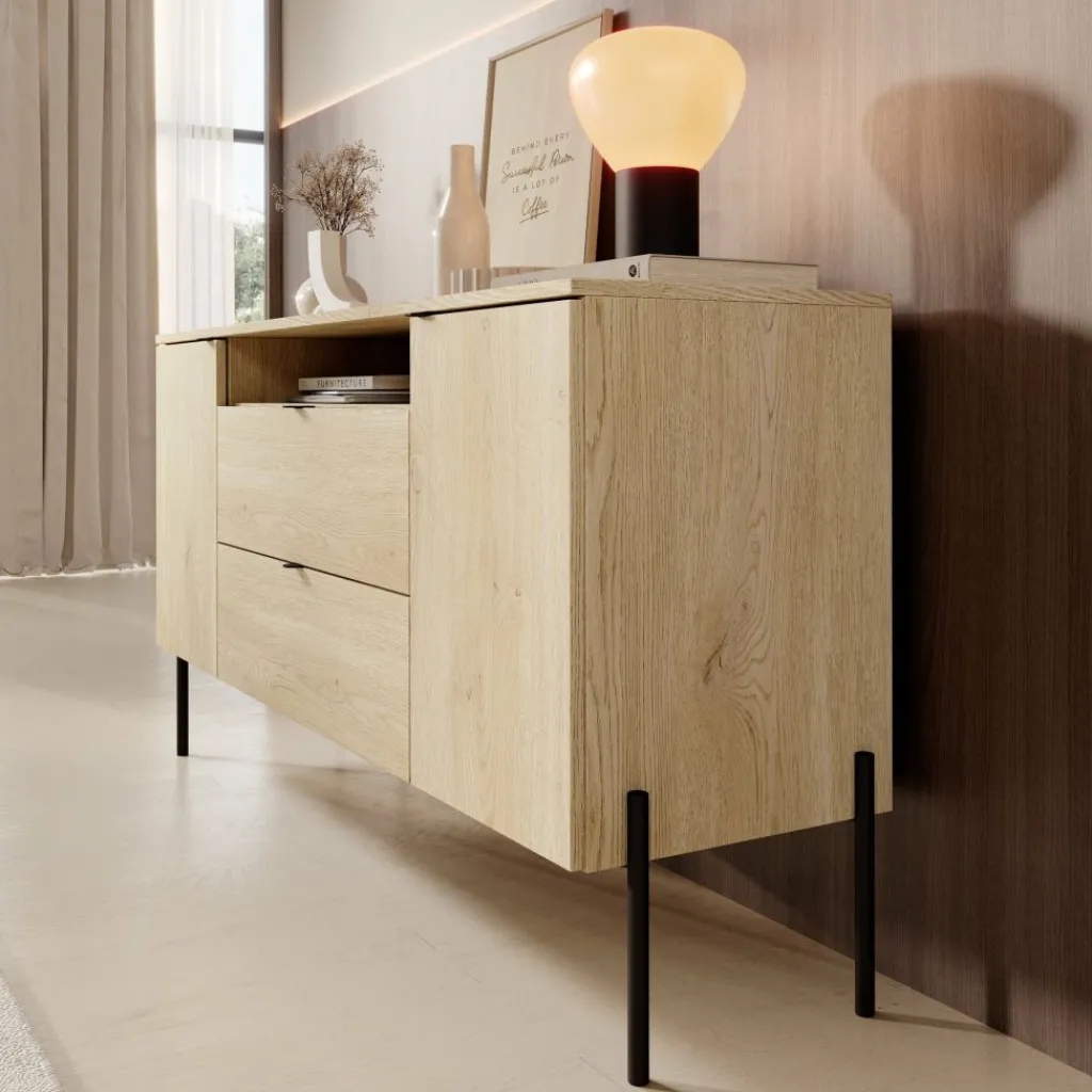Het strakke bovenblad biedt ruimte voor een lamp, vaas of andere decoratieve accessoires en heeft een maximaal draaggewicht van 25 kg. Het dressoir is afgewerkt met slanke zwarte metalen poten van 20 cm hoog, wat een stijlvol contrast vormt met de warme eikentint en het meubel een lichte, eigentijdse uitstraling geeft. Zoals al onze meubels wordt de Oriya dressoir geleverd als plat pakket en is hij eenvoudig zelf te monteren met de bijgeleverde montagehandleiding en benodigde onderdelen inbegrepen