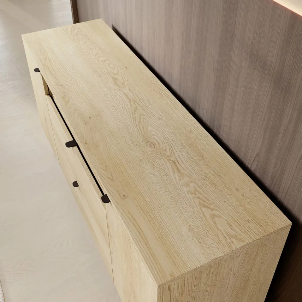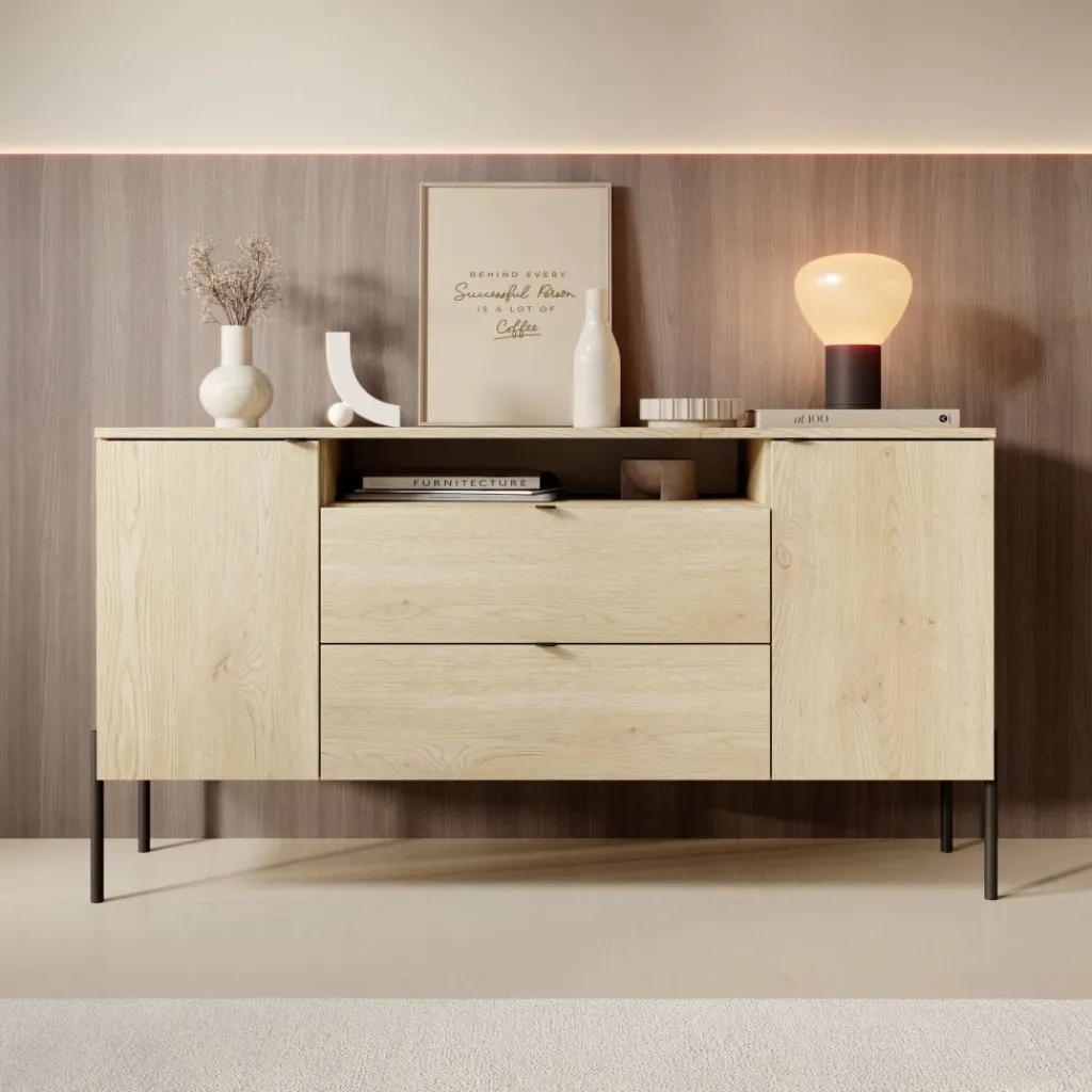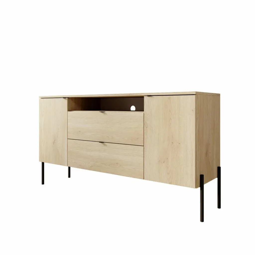 In het midden van het dressoir bevinden zich twee ruime lades met een strak eikenpatroon front, elk met een breedte van 32,5 cm en een maximaal draaggewicht van 7 kg per lade. Daarboven bevindt zich een open vak met een kabeluitsparing, handig voor het wegwerken van snoeren van een mediaspeler of ander apparaat. Aan weerszijden van de lades bevinden zich twee gesloten vakken achter deuren, elk met een binnenruimte verdeeld over twee niveaus van 24,2 cm en 26,2 cm hoog en een breedte van 32,5 cm. Het maximale draaggewicht per legger bedraagt 5 kg.