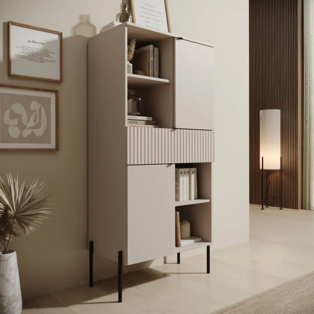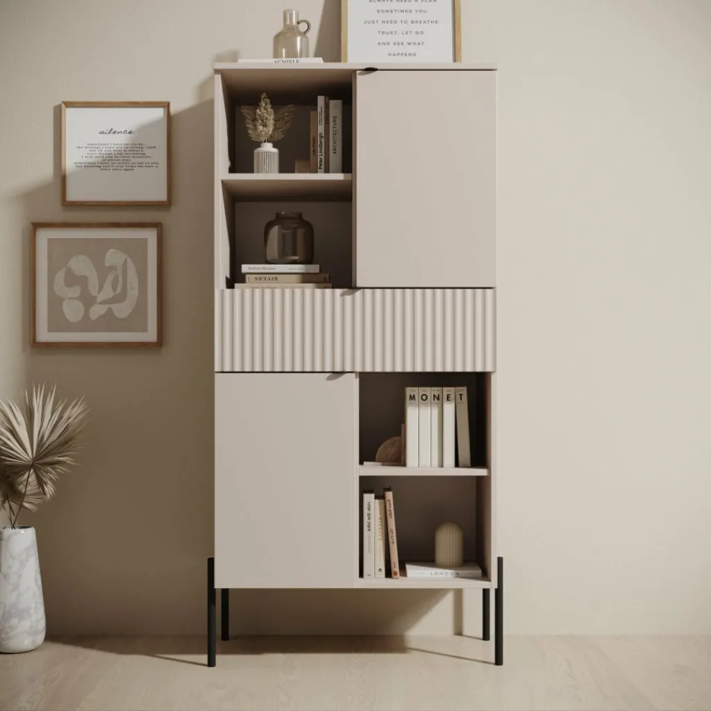 De Oriya boekenkast is uitgevoerd in een warme beige kleur en heeft een strak design met een decoratieve lade voorzien van verticale ribbels. De lichte, egale afwerking zorgt voor een rustige uitstraling die past bij verschillende interieurstijlen, van Scandinavisch tot Japandi. Het frame, de lades, leggers en fronten zijn gemaakt van 15 mm spaanplaat, de achterwanden zijn gemaakt van 3 mm HDF en de handgrepen zijn gemaakt van kunststof. Met een breedte van 70 cm en een hoogte van 150 cm is deze boekenkast geschikt voor kleinere en grotere woonruimtes en past hij goed naast een bank, bureau of in een gang.