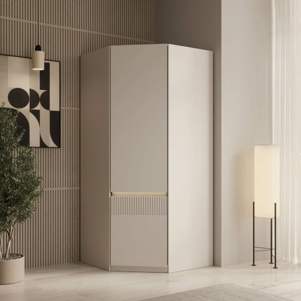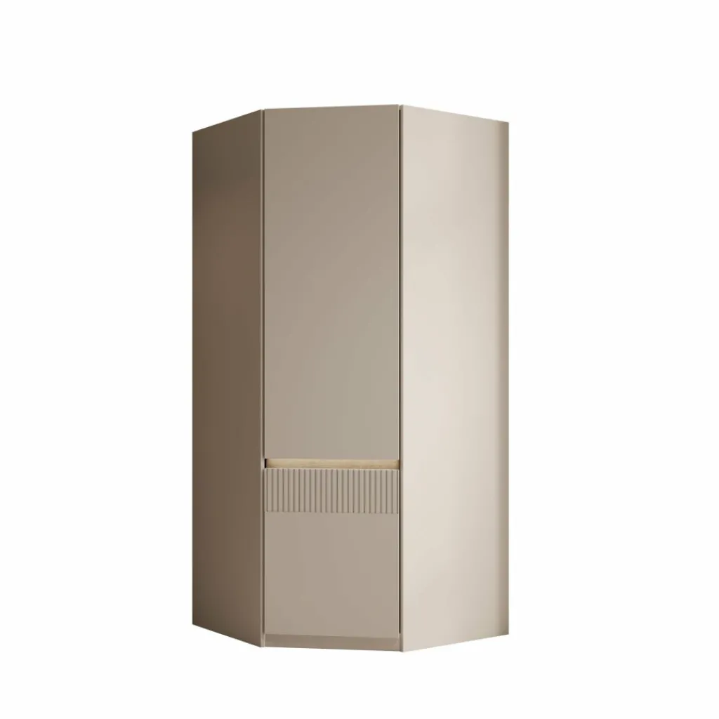 De Orlano hoekkledingkast is een praktische oplossing om een hoek van de kamer efficiënt te benutten. Door de speciale hoekopstelling biedt deze kast veel opbergruimte zonder extra vloeroppervlak in beslag te nemen. Het meubel is uitgevoerd in beige en heeft een rustige, strakke vormgeving die eenvoudig te combineren is met verschillende interieurstijlen. Het frame van het meubel is gemaakt van spaanplaat en de geribbelde inzetstukken zijn gemaakt van MDF.