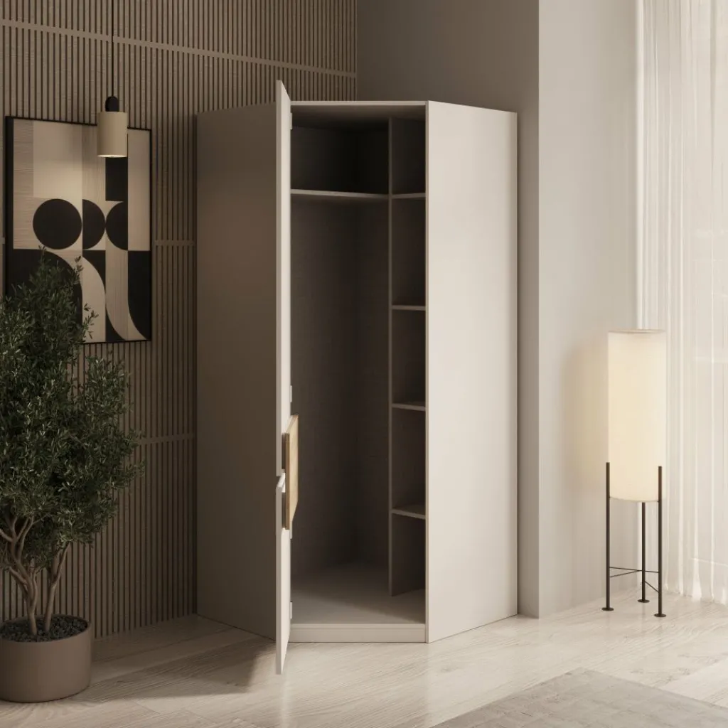 De kast heeft een afmeting van 89 x 89 x 197 cm en is ontworpen om netjes in een hoek te plaatsen. Achter de deuren bevindt zich een ruime indeling met een kledinggedeelte en meerdere legplanken. Hierdoor kun je zowel hangende kleding als gevouwen kleding, dozen of accessoires overzichtelijk opbergen.