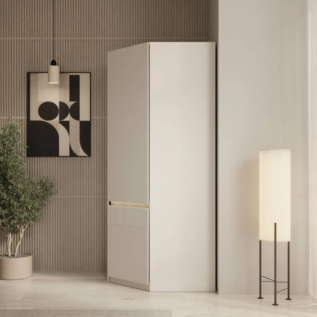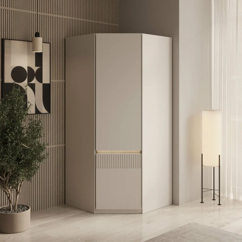 Door de gesloten deuren blijft de inhoud netjes uit het zicht en oogt de ruimte rustig en opgeruimd. De neutrale beige kleur en de strakke lijnen maken deze hoekkast geschikt voor verschillende ruimtes zoals de slaapkamer, kleedkamer of logeerkamer. Dankzij de hoekvorm is dit meubel ideaal voor het optimaal benutten van beschikbare ruimte.