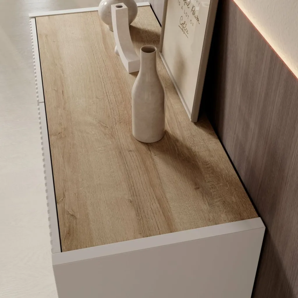 In het midden van het dressoir bevindt zich geïntegreerde LED-verlichting die zorgt voor een subtiel lichteffect. De verlichting is eenvoudig te bedienen met een voetschakelaar.