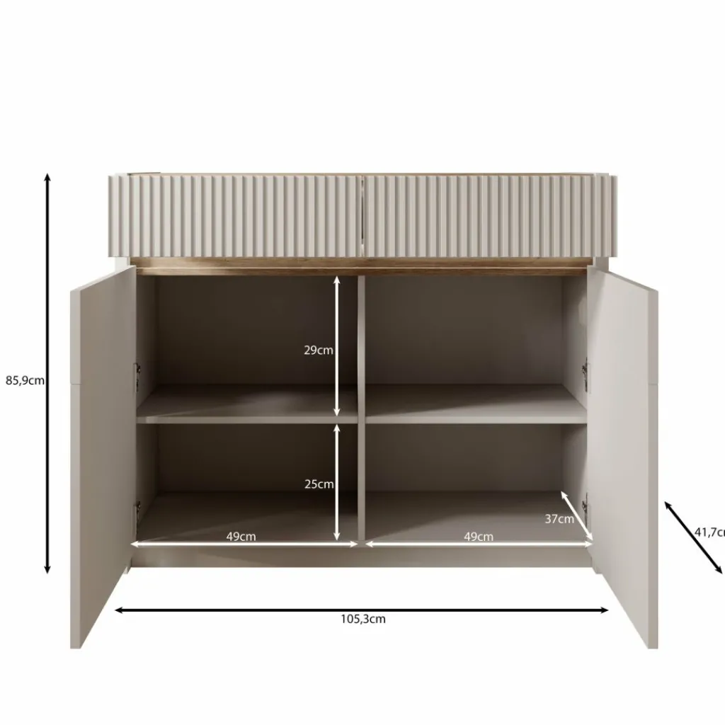 Het Orlano dressoir is uitgevoerd in een beige kleur en heeft een strak vormgegeven front met verticale reliëfdetails. Het bovenblad heeft een houtlook afwerking die een duidelijk contrast vormt met de lichte kast. Het frame van het meubel is gemaakt van spaanplaat en de geribbelde inzetstukken zijn gemaakt van MDF. Dankzij het formaat van 105 x 42 x 86 cm is dit dressoir geschikt voor verschillende ruimtes zoals de woonkamer, eetkamer of hal.