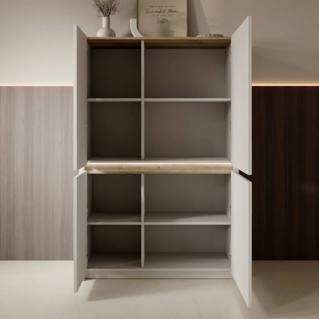 Het dressoir beschikt over vier deuren. Achter de deuren bevinden zich meerdere opbergvakken verdeeld over verschillende niveaus, waardoor je servies, accessoires of andere spullen overzichtelijk kunt opbergen.