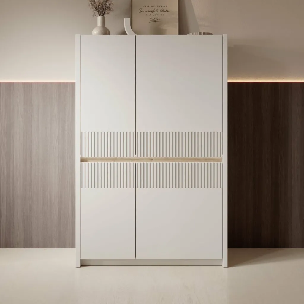 Het Orlano dressoir is uitgevoerd in een beige kleur en heeft een strak front met verticale reliëfdetails. De houtlook accentstrook in het midden vormt een subtiel contrast met de lichte kast. Het frame van het meubel is gemaakt van spaanplaat en de geribbelde inzetstukken zijn gemaakt van MDF. Met een afmeting van 95 x 42 x 147 cm biedt dit meubel praktische opbergruimte en kan het goed worden geplaatst in bijvoorbeeld de woonkamer, eetkamer of hal.