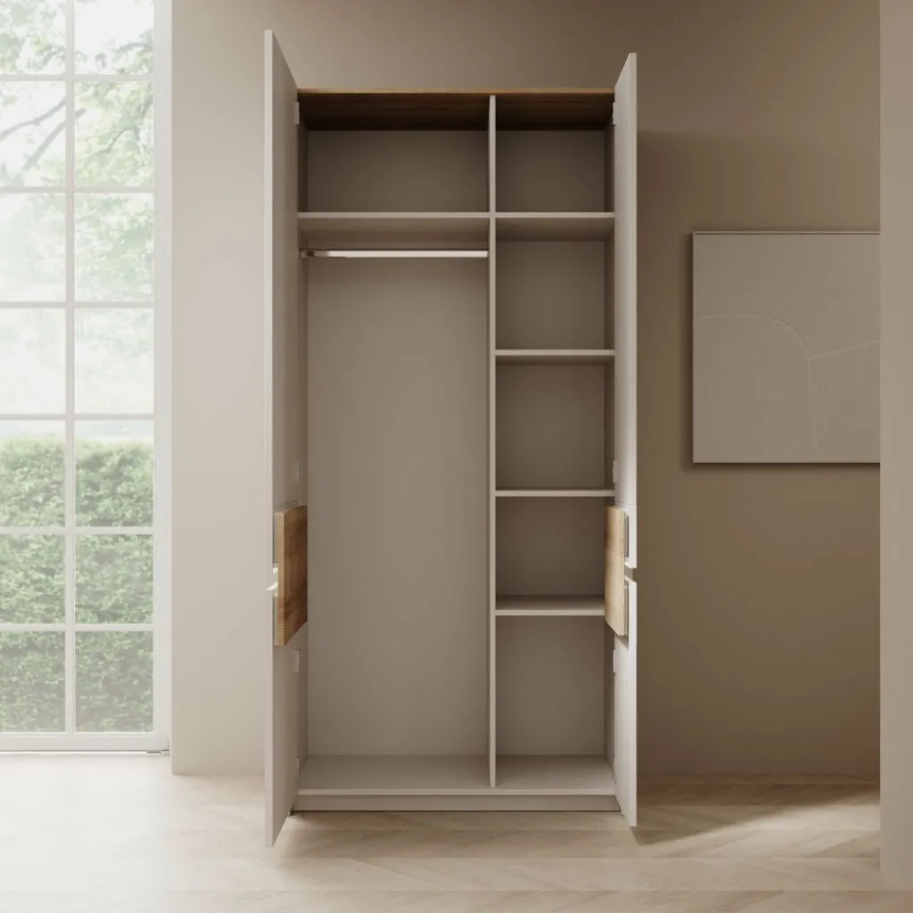 Door de gesloten deuren blijft de inhoud netjes uit het zicht en oogt de slaapkamer opgeruimd. De combinatie van praktische indeling, hangruimte en legplanken zorgt ervoor dat verschillende soorten kleding overzichtelijk kunnen worden opgeborgen. Hierdoor is deze kledingkast geschikt voor dagelijks gebruik in de slaapkamer of kleedruimte.
