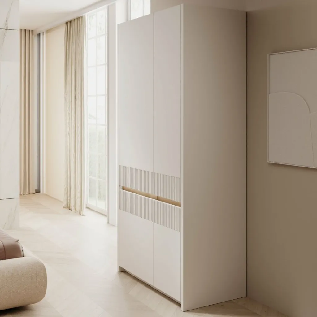 De Orlano kledingkast is een praktische kast met een overzichtelijke indeling voor het opbergen van kleding en accessoires. De kast is uitgevoerd in beige en heeft een strak front met subtiele verticale ribbels en een horizontaal accent in houtkleur. Het frame van het meubel is gemaakt van spaanplaat en de geribbelde inzetstukken zijn gemaakt van MDF. Hierdoor krijgt het meubel een rustige en moderne uitstraling die goed past in verschillende slaapkamers.