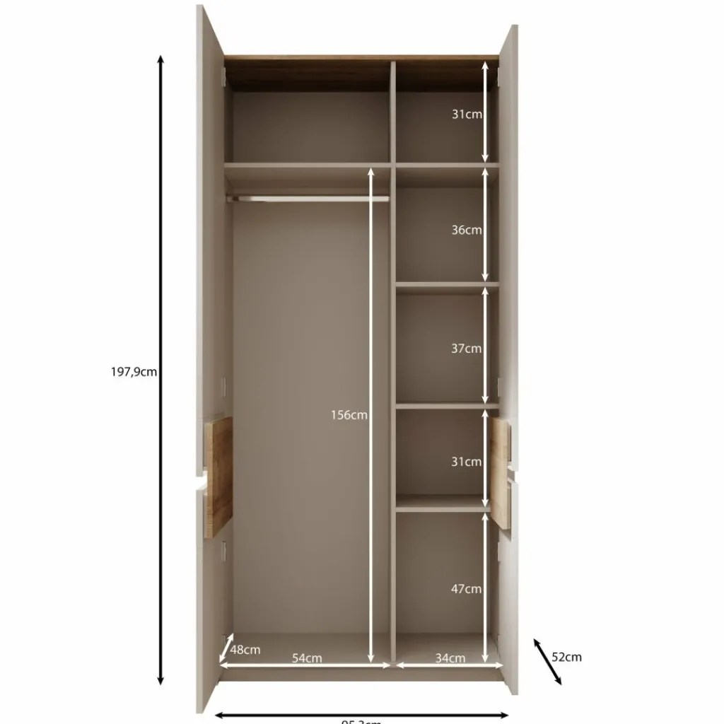 Met een afmeting van 95 x 52 x 198 cm biedt de kast een combinatie van hangruimte en legplanken. Aan de linkerzijde bevindt zich een kledingroede met een hoogte van circa 156 cm, geschikt voor het ophangen van jassen, jurken, blouses of overhemden. De kledingroede heeft een maximaal draagvermogen van 25 kg.