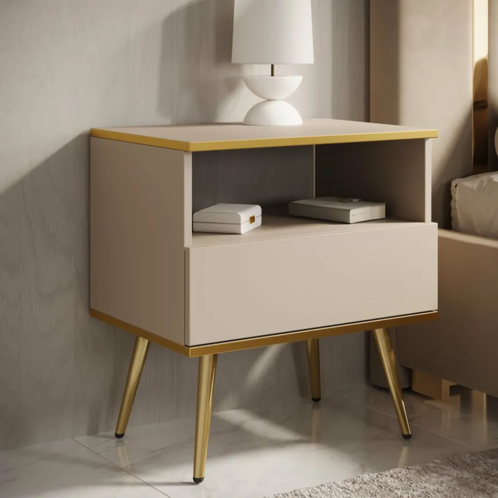 Nachtkastje Orleans combineert luxe uitstraling met praktische opbergruimte. De beige-gouden afwerking en het moderne design maken dit nachtkastje een elegante toevoeging aan elke slaapkamer. Dankzij het compacte formaat van 54 cm breed past het moeiteloos naast elk bed.