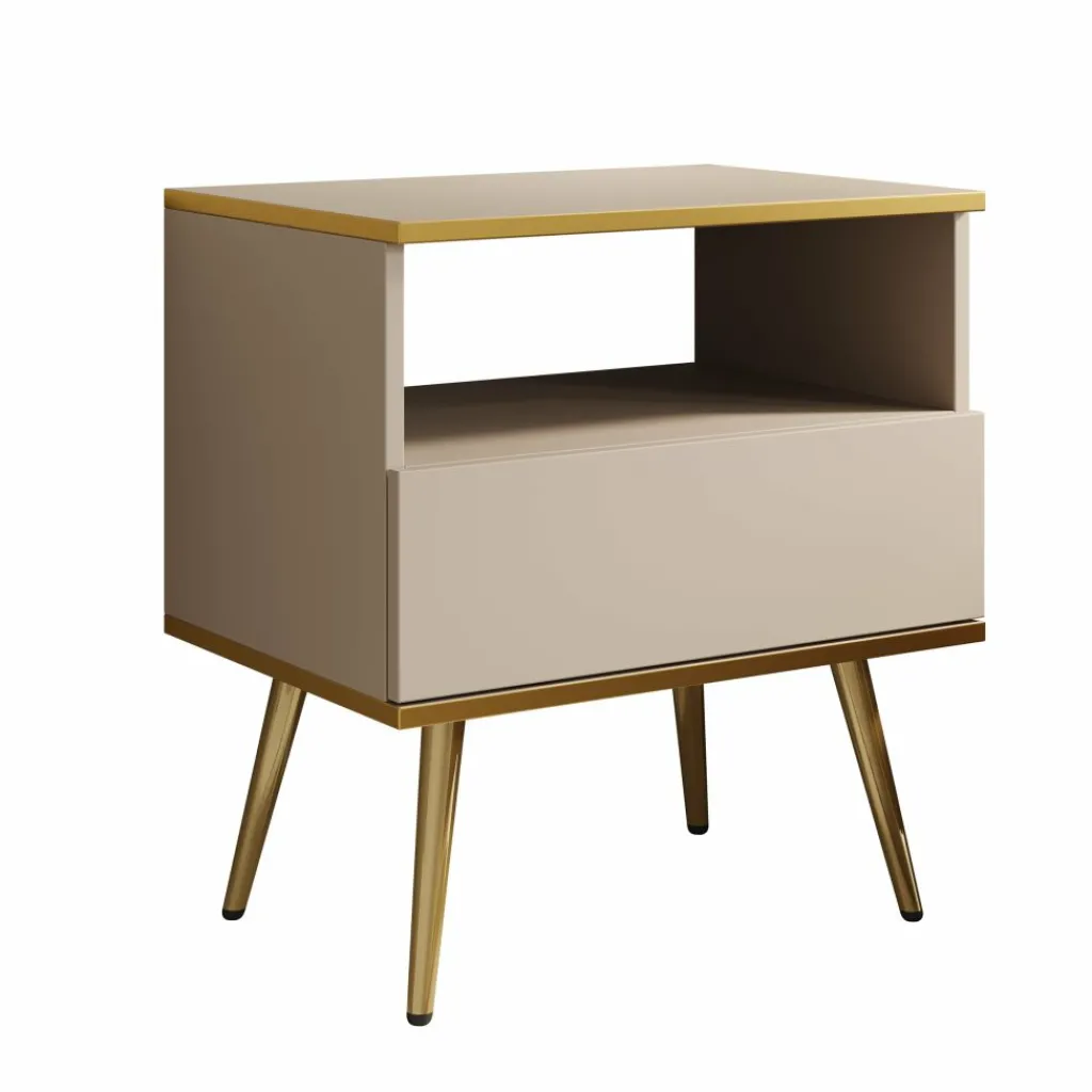 Het open vak biedt ruimte voor een boek, telefoon of decoratief item, terwijl de lade ideaal is voor het opbergen van kleinere spullen zoals opladers of verzorgingsproducten. De slanke, goudkleurige poten geven het geheel een luchtige en verfijnde uitstraling.