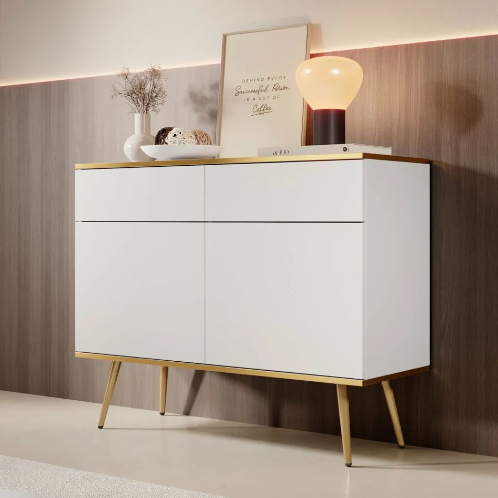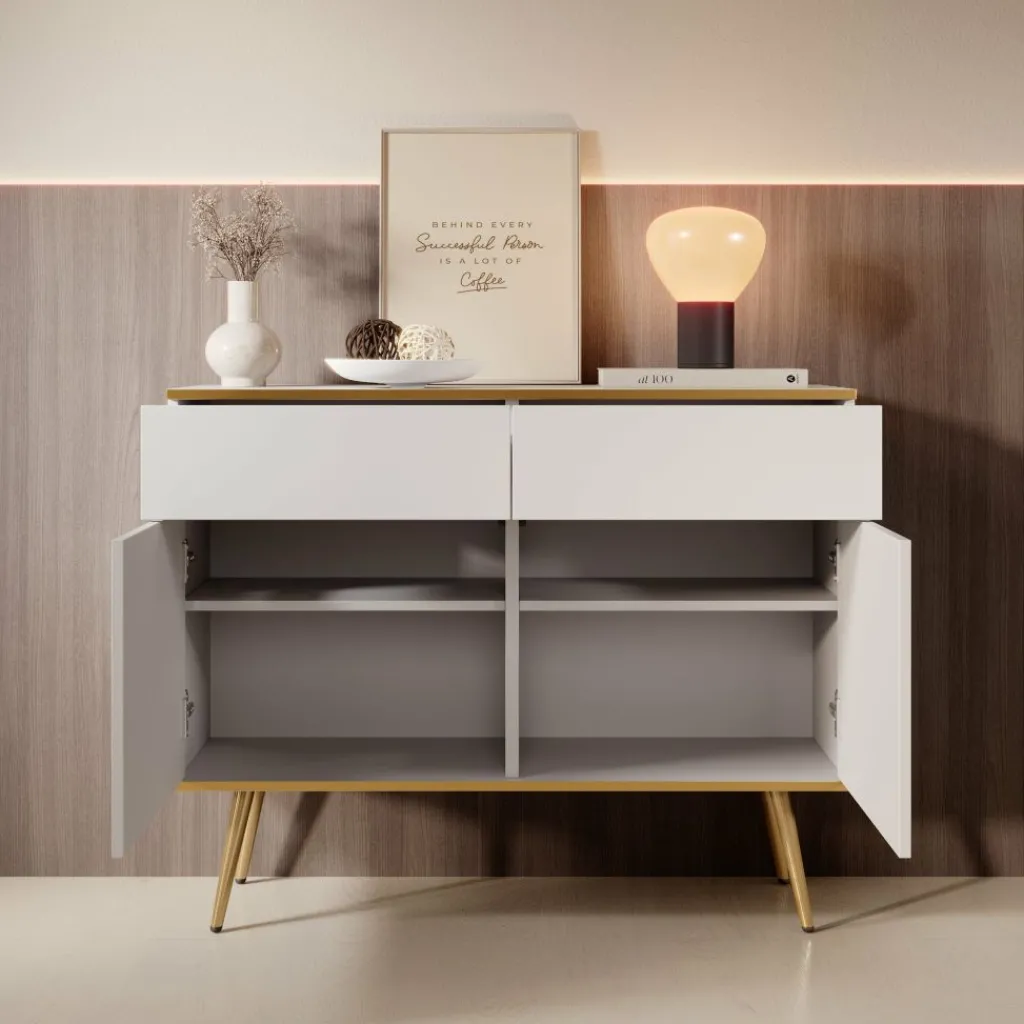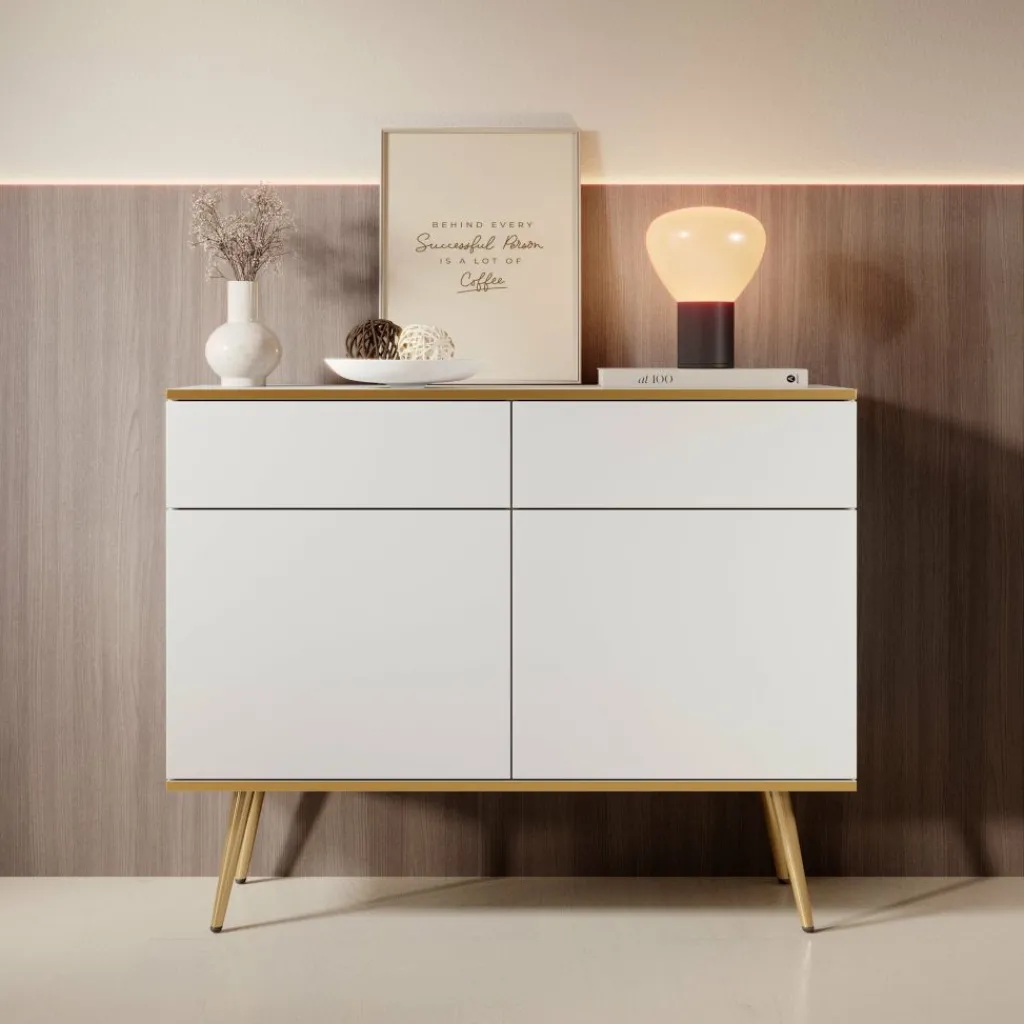 Dressoir Orleans is een stijlvolle opbergkast met een moderne uitstraling. De kast is uitgevoerd in wit met gouden accenten en staat op slanke, metalen pootjes.
