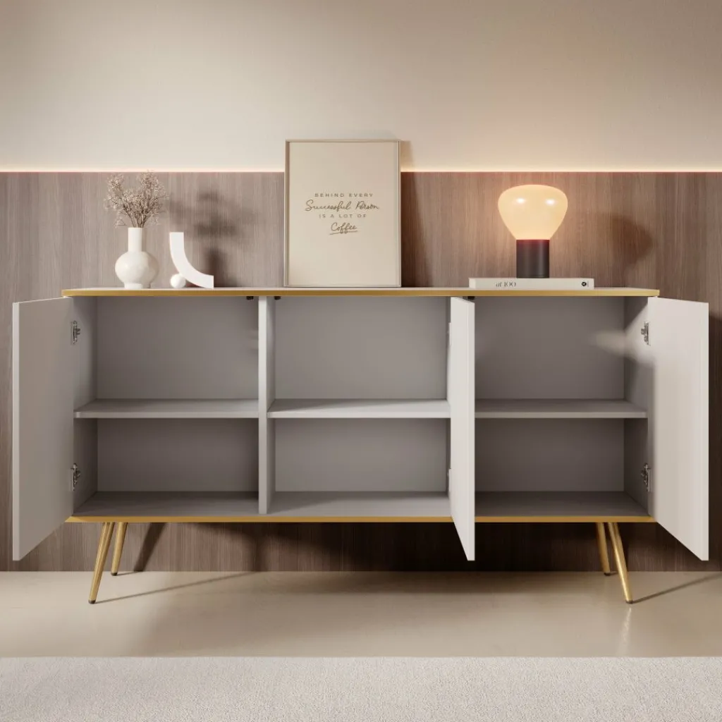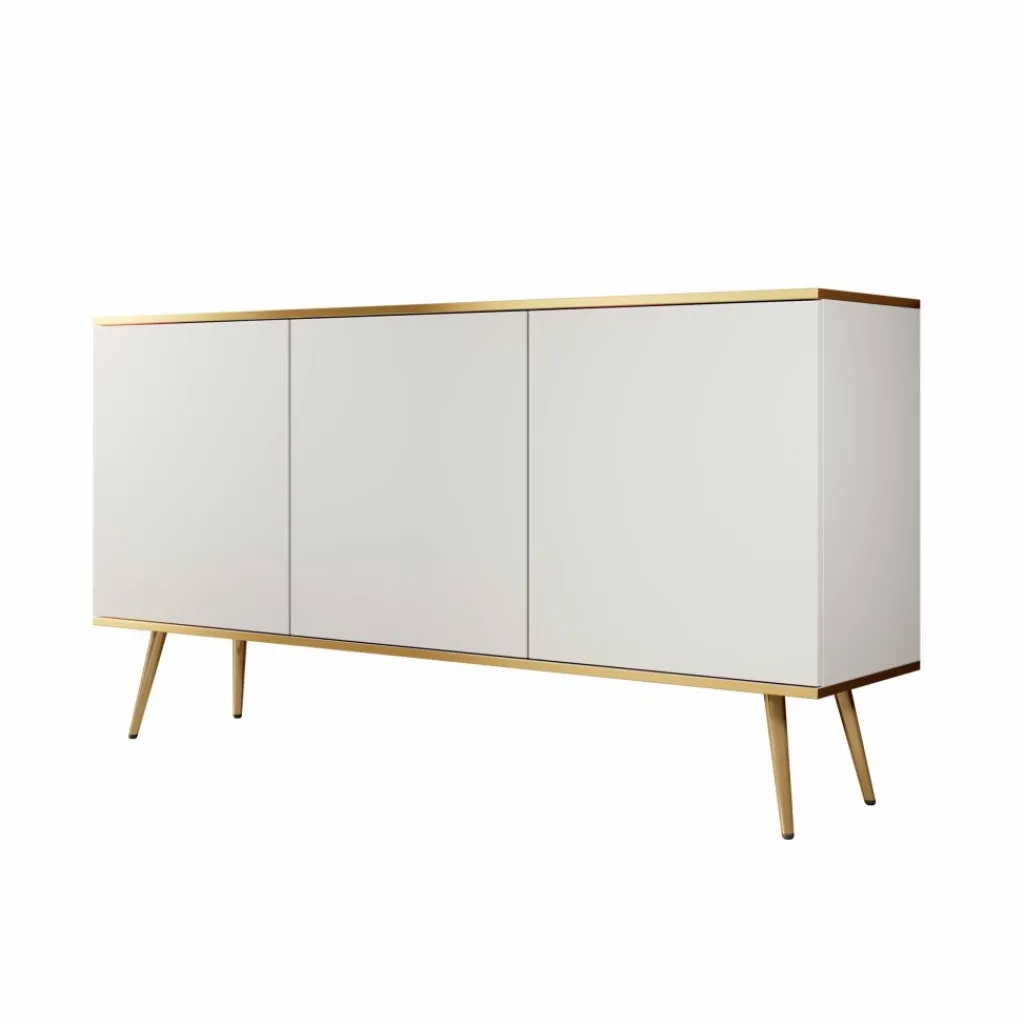 Dressoir Orleans is een modern vormgegeven kast in een frisse witte kleur met goudkleurige accenten.