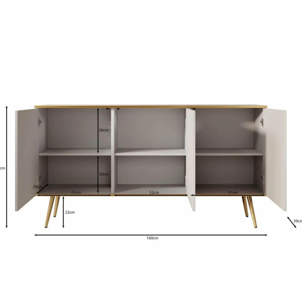 Achter de drie greeploze deuren bevindt zich een ruime opbergruimte, verdeeld over zes vakken. Ideaal voor het overzichtelijk opbergen van servies, boeken of woonaccessoires. De hoogte van het dressoir is 85 cm, de diepte 39 cm. De stevige poten zorgen niet alleen voor stabiliteit, maar geven het meubel ook een luchtige uitstraling.