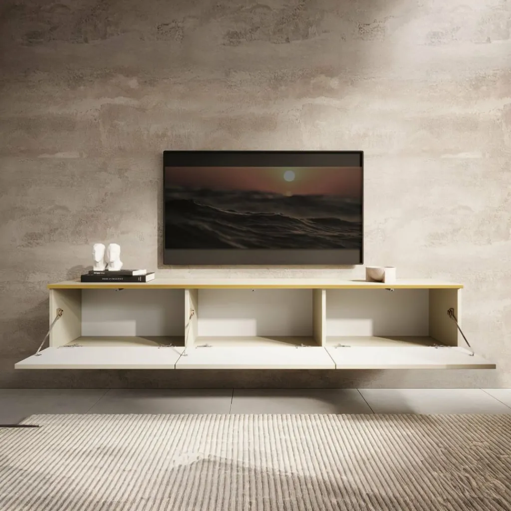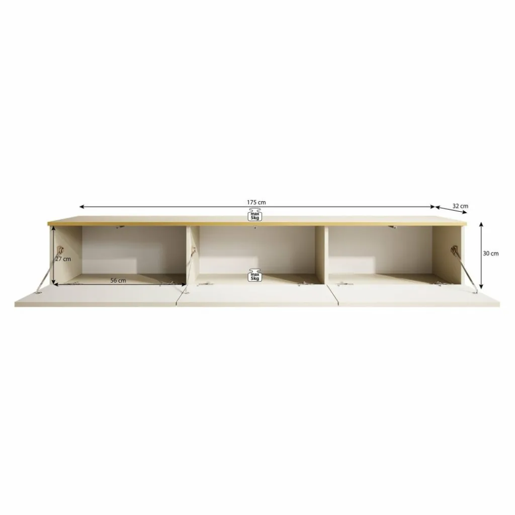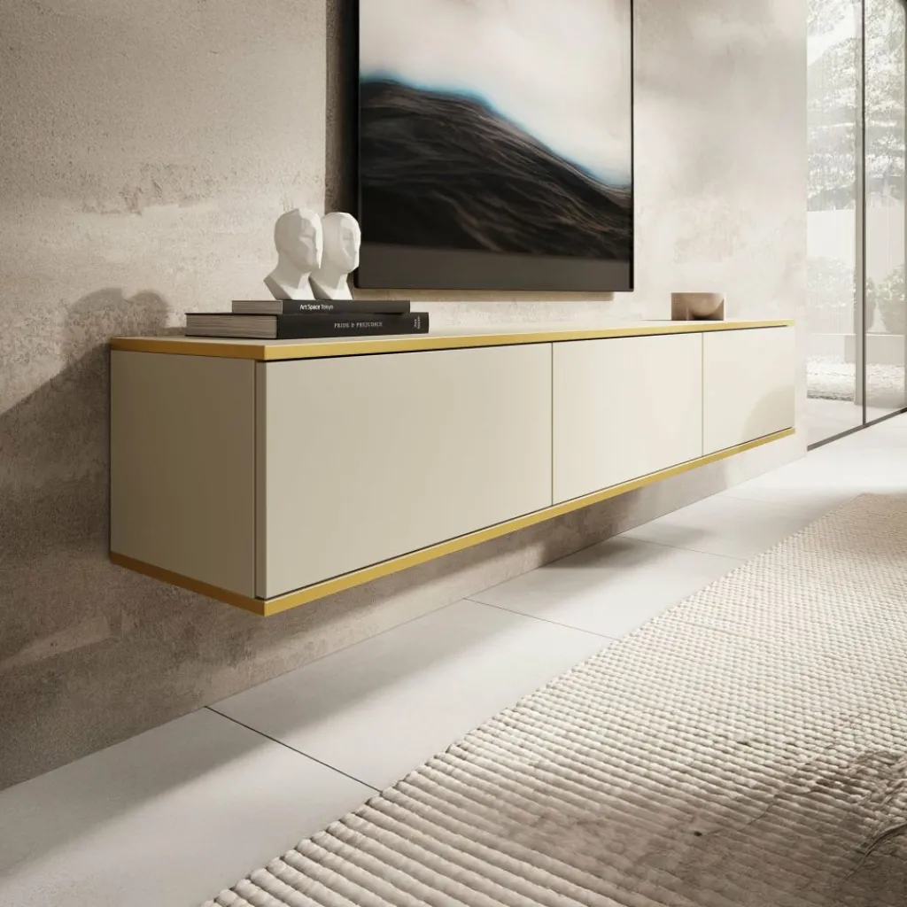 TV-Meubel Orleans in beige is met zijn afmeting van 175 cm ideaal voor zowel kleine als grote woonkamers. De beige kleur zorgt voor een moderne en strakke uitstraling, terwijl de goudkleurige strips een hotel-chique gevoel toevoegen.