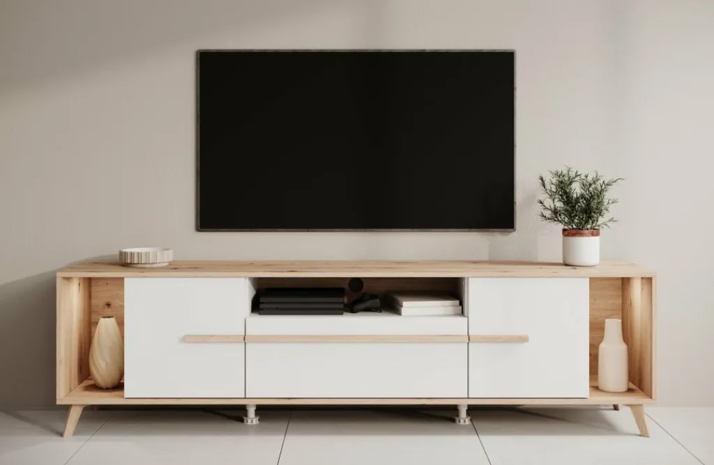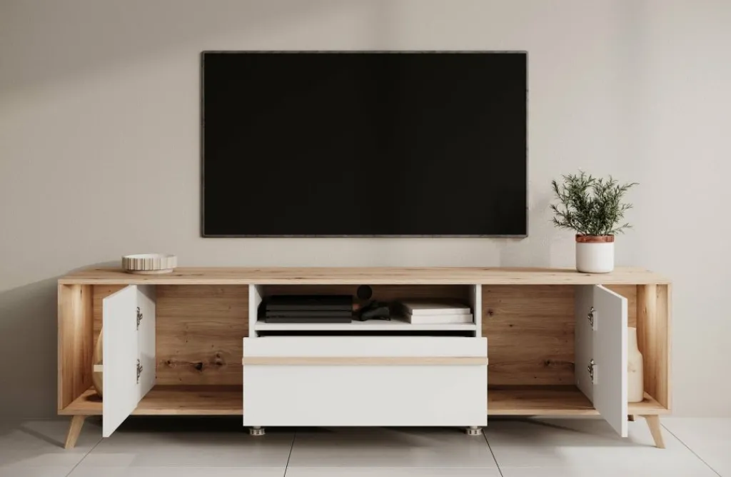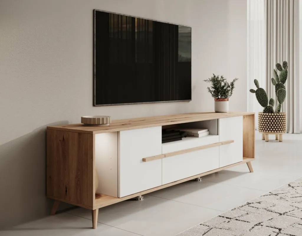 TV-Meubel Oswald is een opbergkast voor onder de tv in een moderne stijl. De TV-kast beschikt over 2 deuren en 1 lade. Deze lade en deuren openen met eiken kleurige handgrepen. Ook heeft dit model nog 3 open vakken waarvan het linkse en rechtse open vak worden verlicht met LED-verlichting. Achter het middelste open vak zit een uitsparing om eventuele bedrading weg te werken. Het meubel is uitgevoerd in de kleuren eiken met wit.