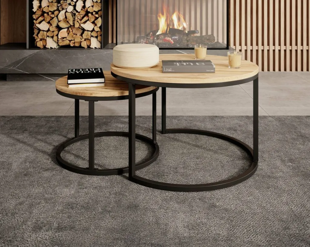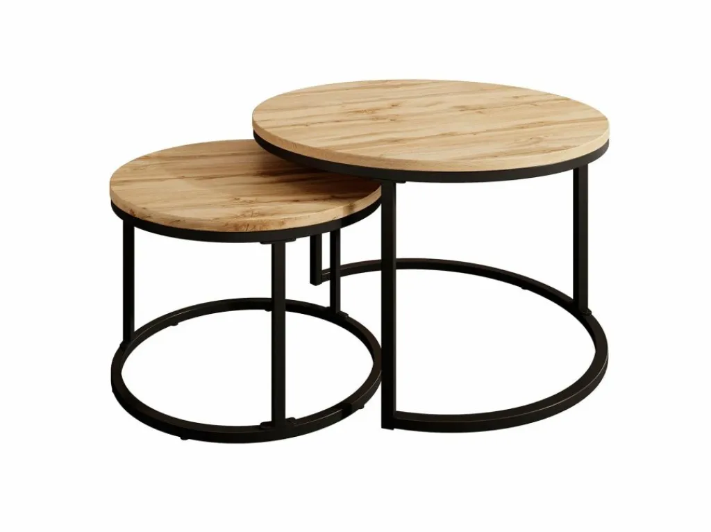 Salontafel Ovalo is een set van 2 salontafels met een industriele uitstraling. De set bestaat uit 2 ronde salontafels in verschillende afmetingen. De bovenkant van het blad heeft een eiken kleur.