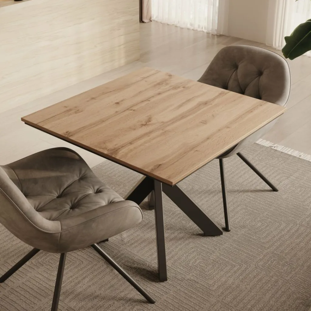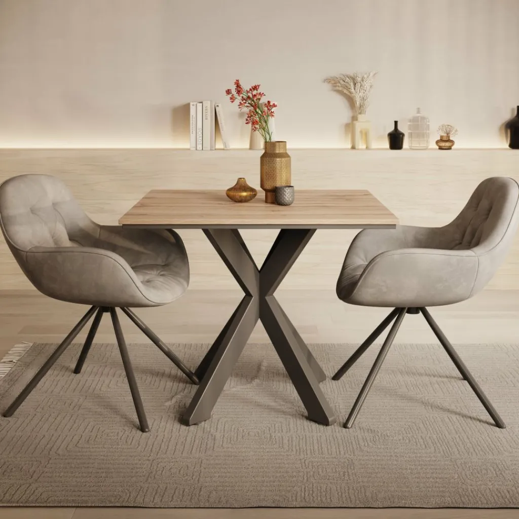 Eetkamertafel Pacey is een compacte en stijlvolle tafel die perfect past in kleinere eetkamers of keukens. Met zijn afmetingen van 90x90x74 cm biedt de tafel genoeg ruimte voor 2 tot 4 personen. Het tafelblad is uitgevoerd in een warme eiken kleur en rust op een modern zwart metalen kruisframe, wat zorgt voor stabiliteit en een stoere uitstraling.