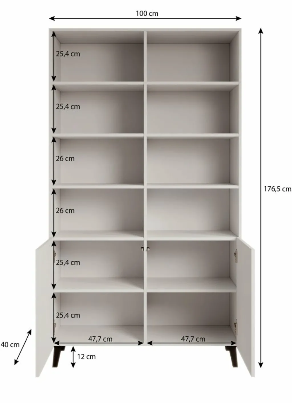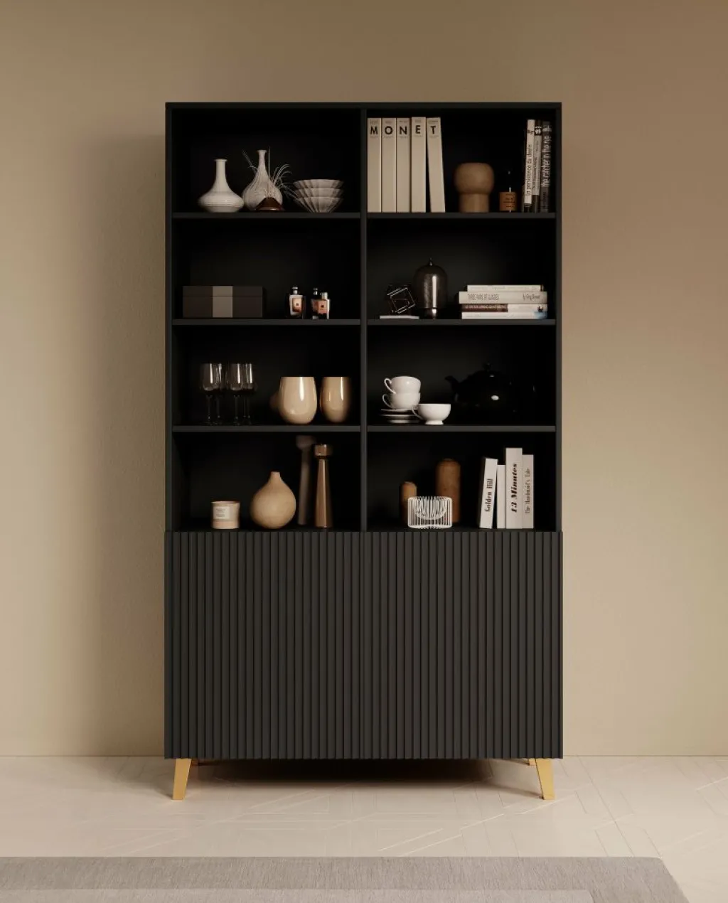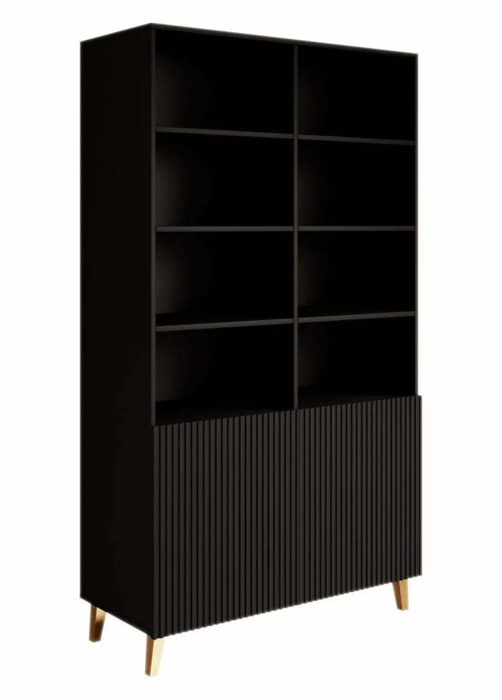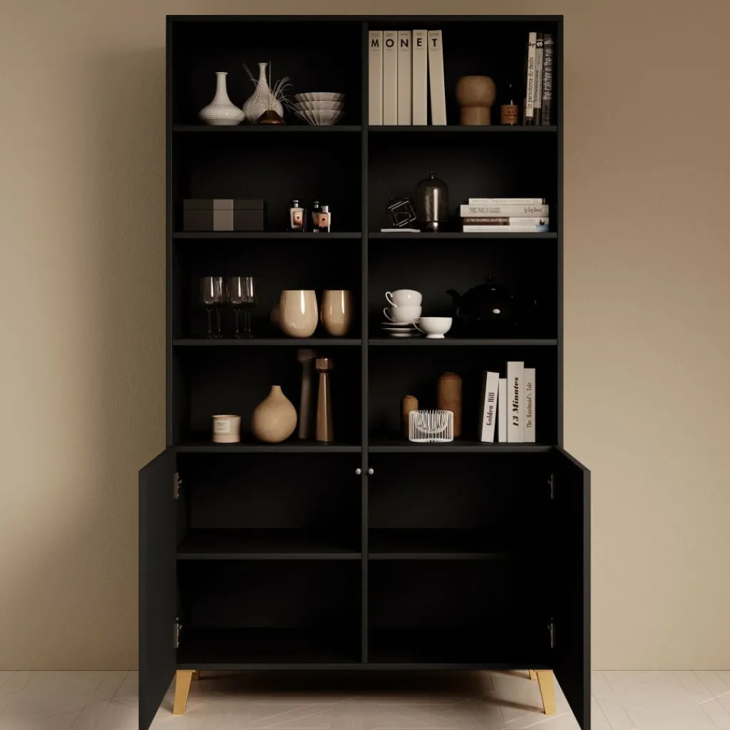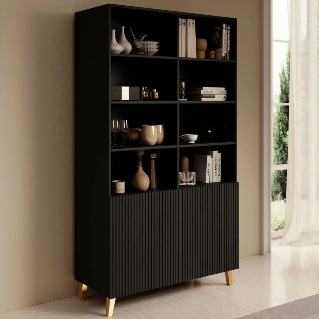 De kast beschikt over 8 open vakken met daaronder 2 deuren waar ook nog eens 4 opbergvakken zitten. De deurtjes hebben een latten patroon aan de voorkant en zijn greeploos. De Palamos staat op goudkleurige pootjes.