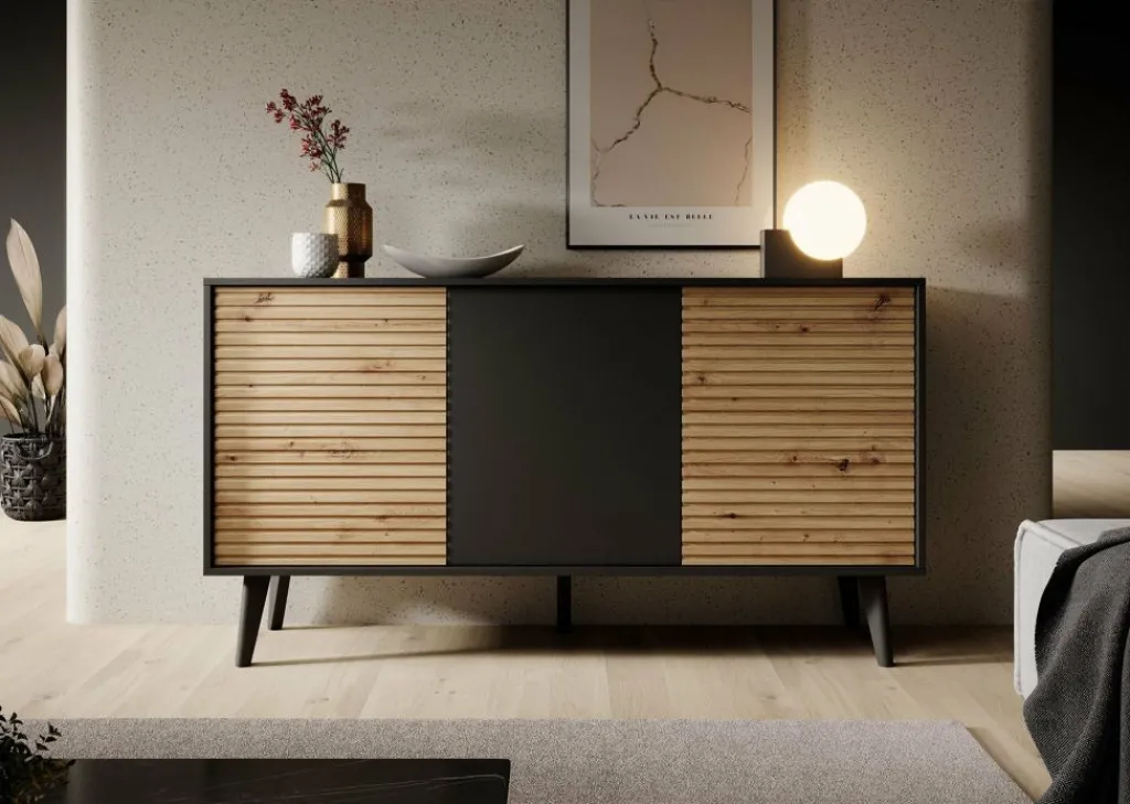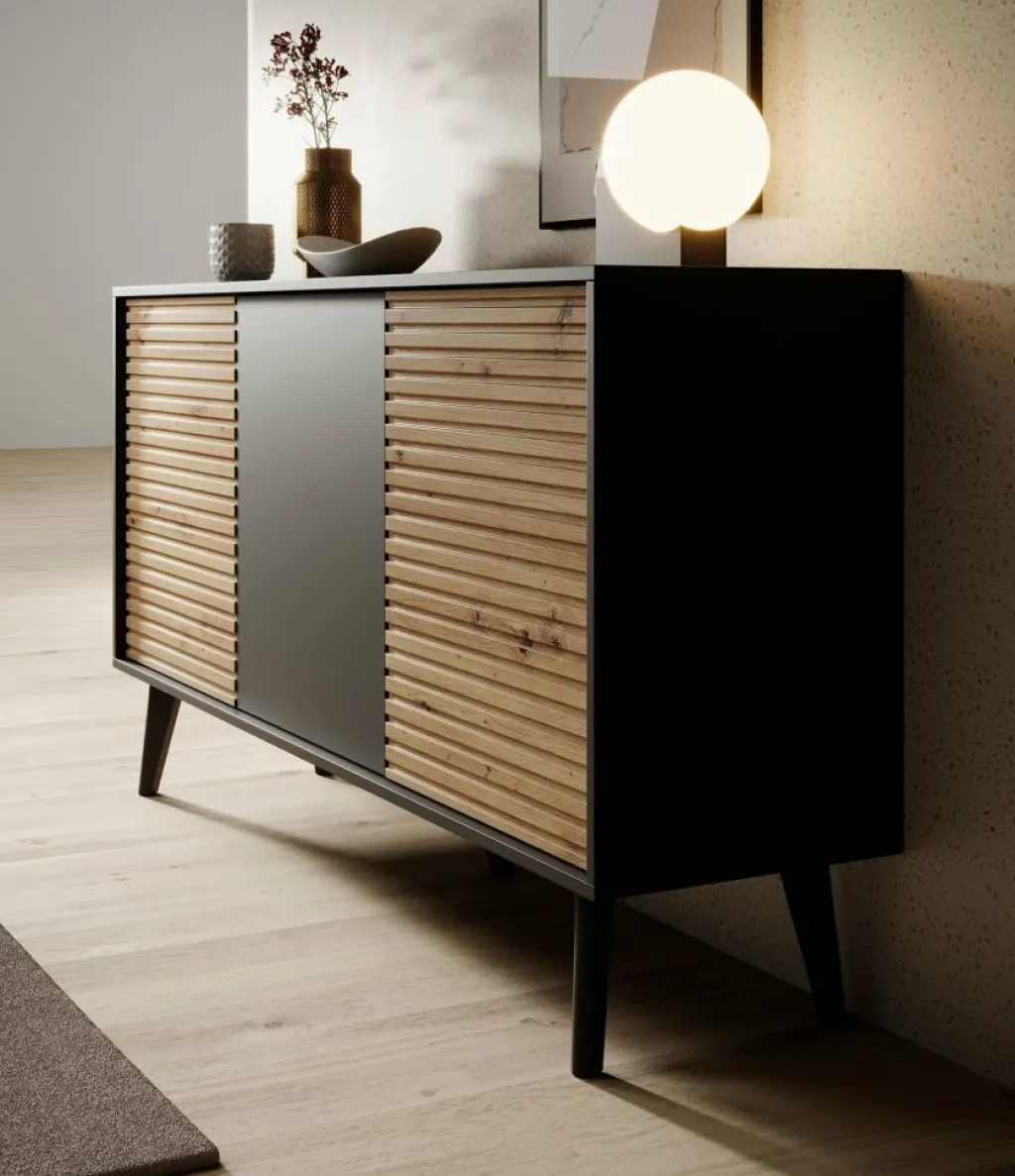 Het Dressoir Palladium is afgewerkt in mat zwart en zwarte pootjes. Deze details geven het dressoir een industriële uitstraling. De deuren openen door middel van een tip-on systeem.