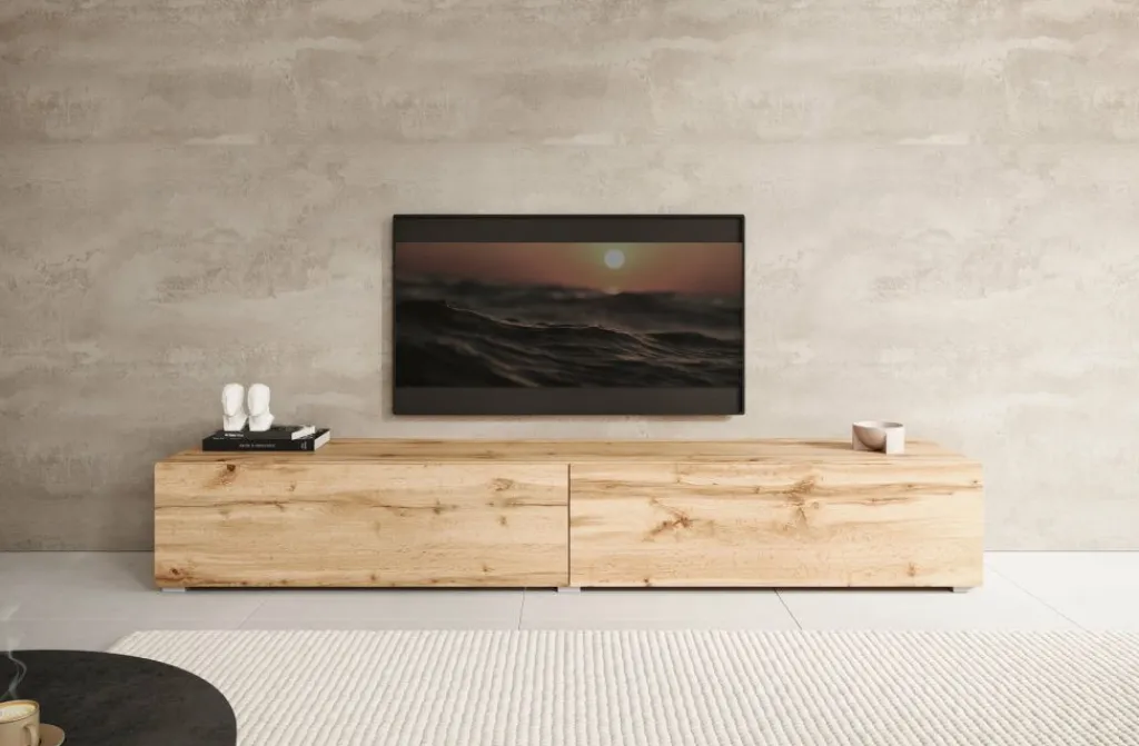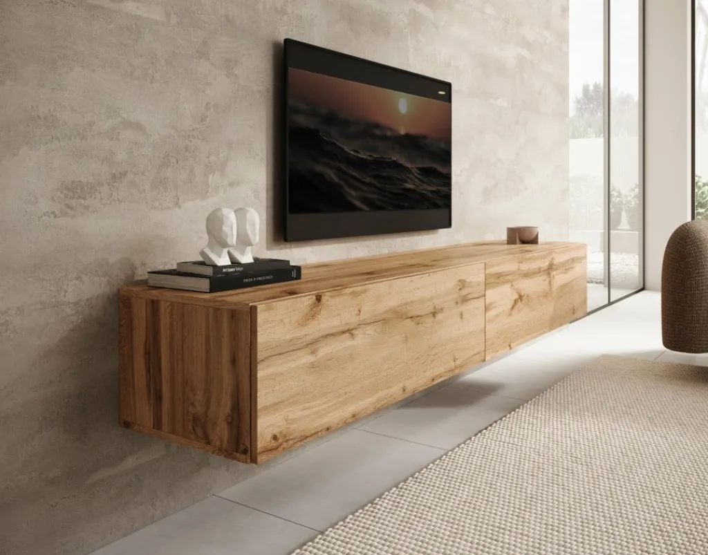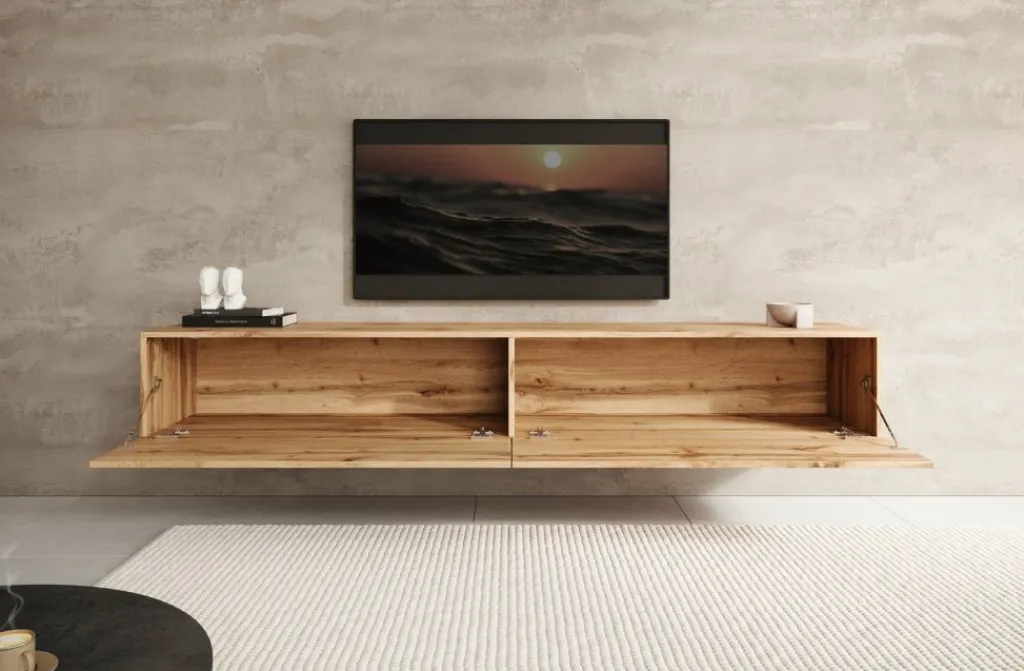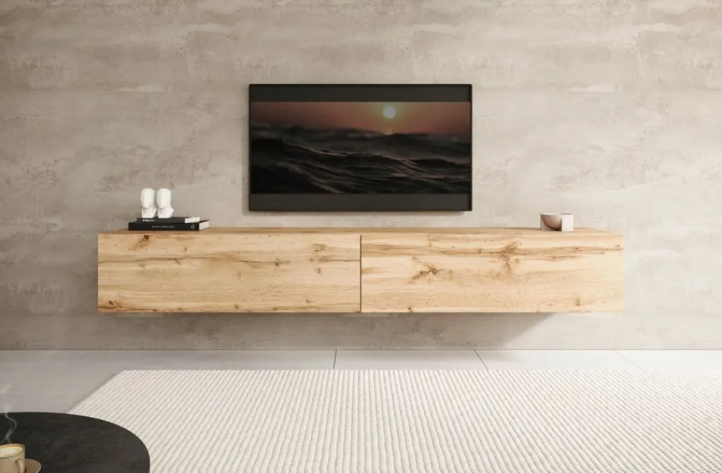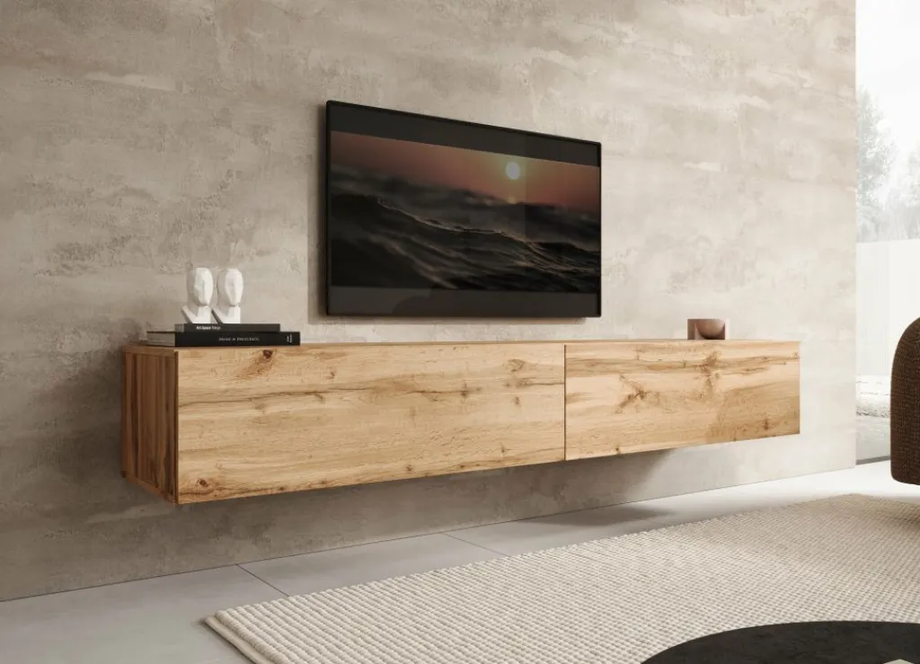 Het TV-Meubel is aan de muur op te hangen. Toch liever een staand model? Dat kan ook, door eenvoudig de bijgeleverde pootjes te monteren onder het meubel. De pootjes zijn zilverkleurig, gemaakt van kunststof en hebben een hoogte van 2 cm.
