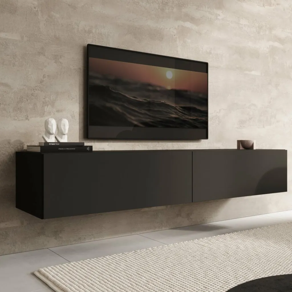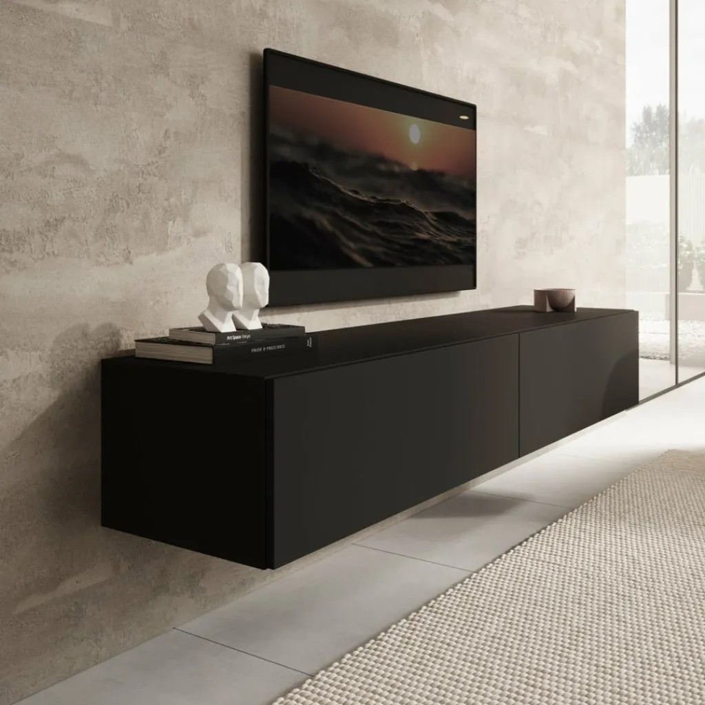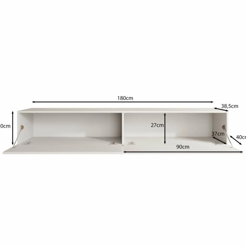 Het TV-Meubel is aan de muur op te hangen. Toch liever een staand model? Dat kan ook, door eenvoudig de bijgeleverde pootjes te monteren onder het meubel. De pootjes zijn zilverkleurig, gemaakt van kunststof en hebben een hoogte van 2 cm.
