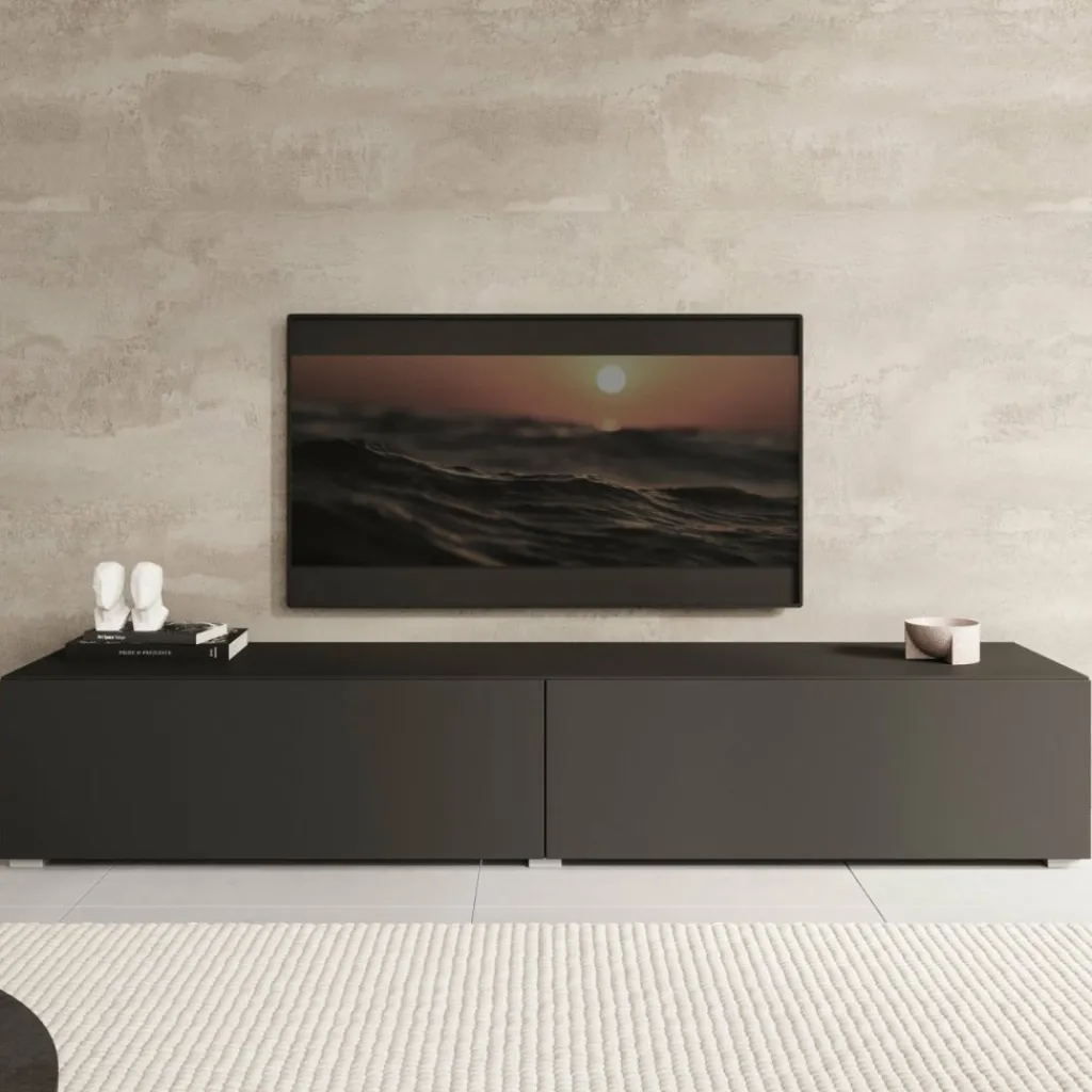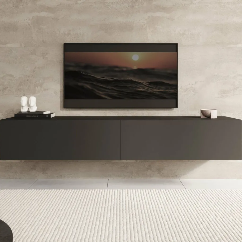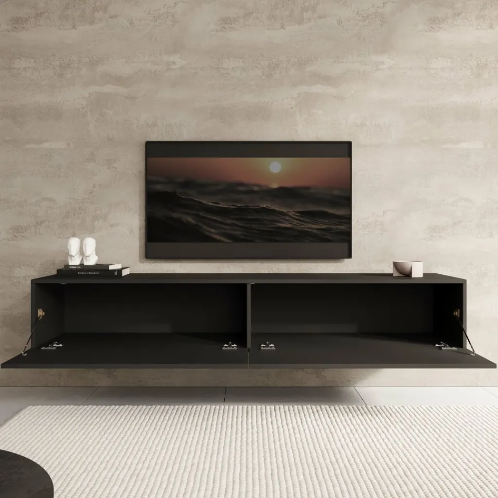 Het TV-Meubel is aan de muur op te hangen. Toch liever een staand model? Dat kan ook, door eenvoudig de bijgeleverde pootjes te monteren onder het meubel. De pootjes zijn zilverkleurig, gemaakt van kunststof en hebben een hoogte van 2 cm.