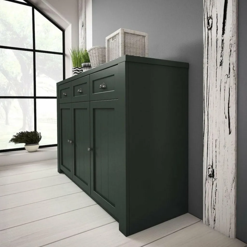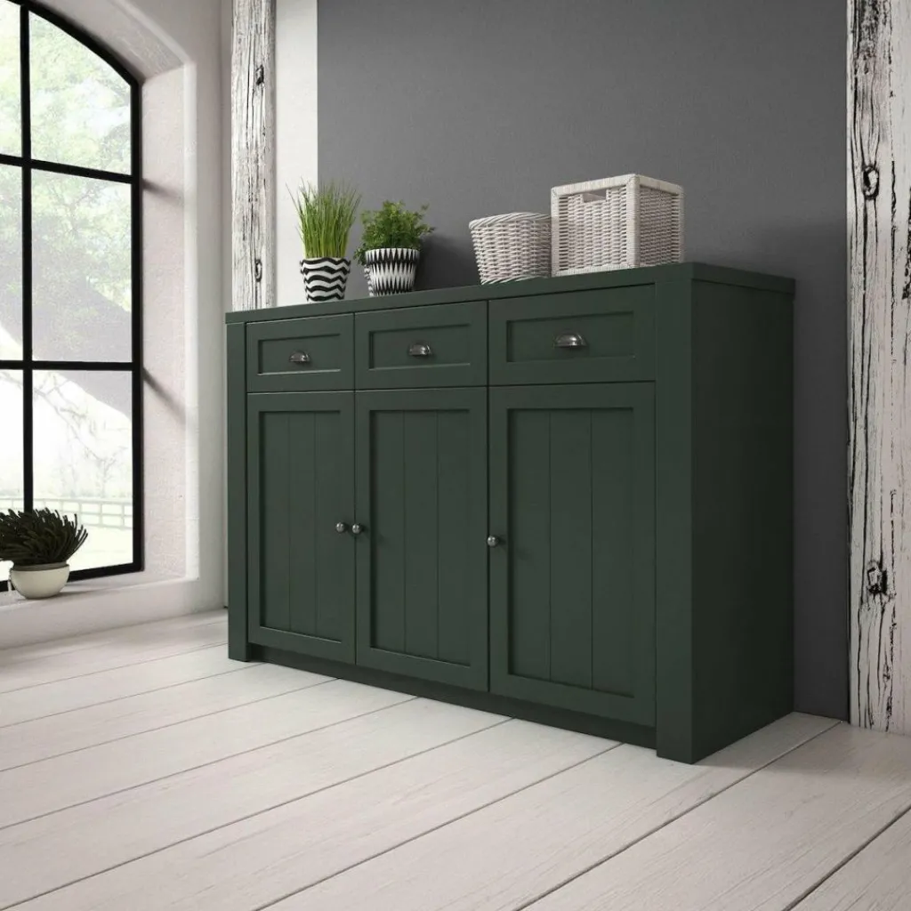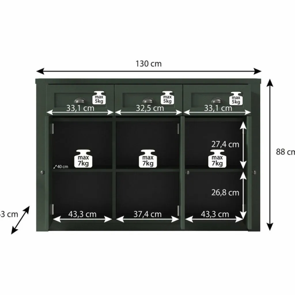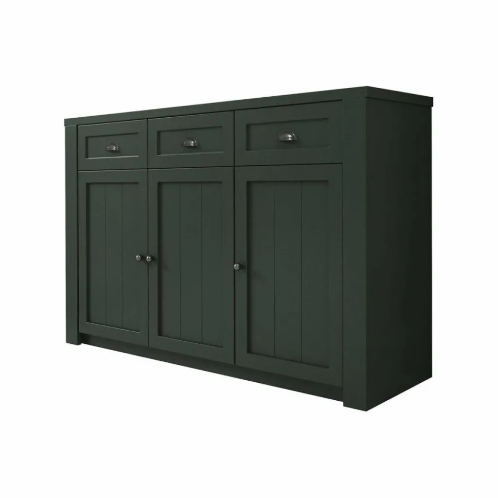 Het Parello 3 dressoir in donkergroen heeft een tijdloze uitstraling met panelendeuren en metalen handgrepen. De kast is 130 cm breed en biedt opbergruimte in drie afzonderlijke compartimenten met legplanken. Boven de deuren bevinden zich drie lades die extra ruimte bieden voor kleinere items. De stevige constructie zorgt ervoor dat het dressoir geschikt is voor dagelijks gebruik in de woon- of eetkamer.