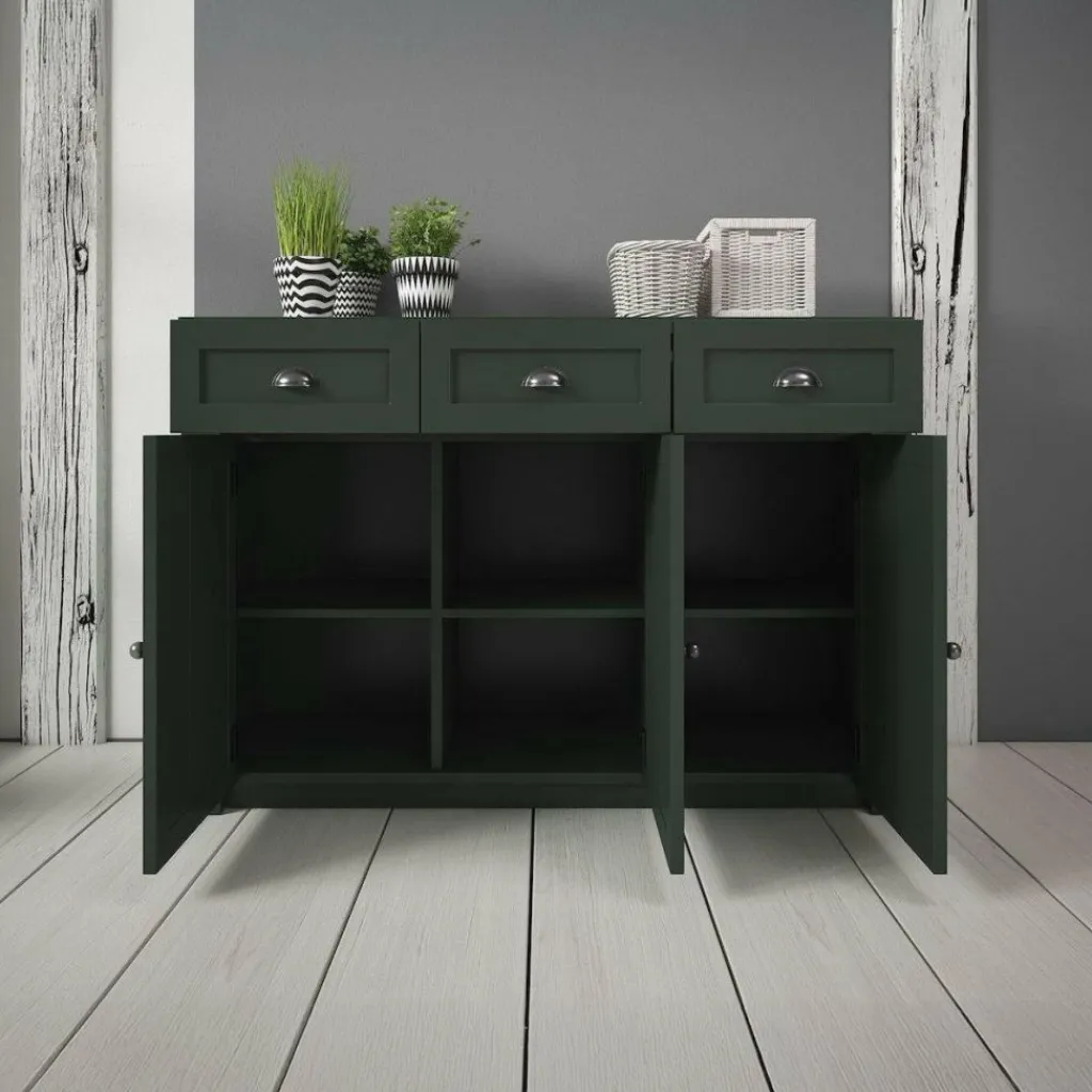 De groene afwerking geeft het meubel een rustige en solide uitstraling die goed past bij zowel moderne als landelijke interieurs. De opbergvakken achter de deuren zijn verdeeld in vakken, waardoor alles overzichtelijk opgeborgen kan worden. Het blad bovenop biedt ruimte voor decoratie of praktische items zoals manden of planten.