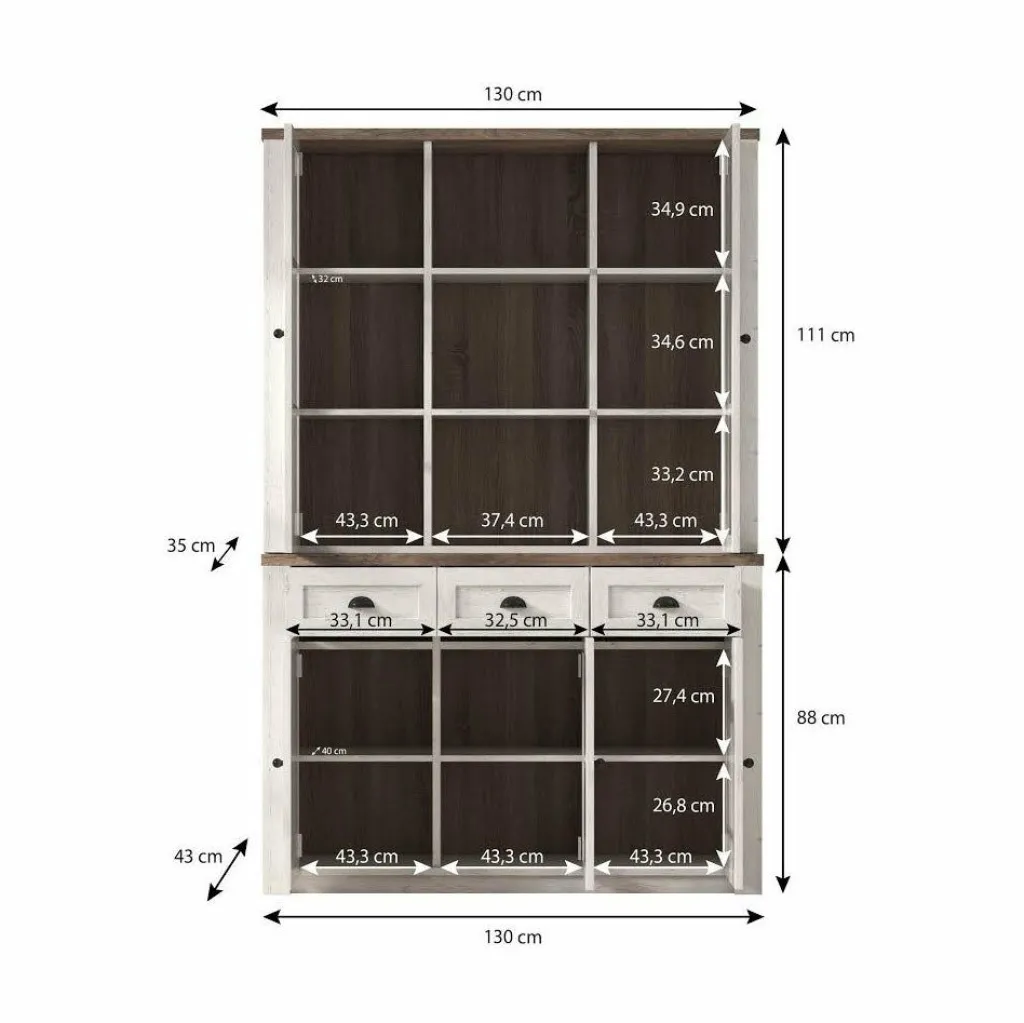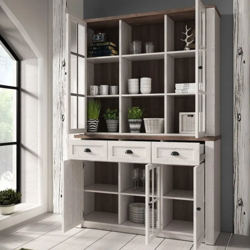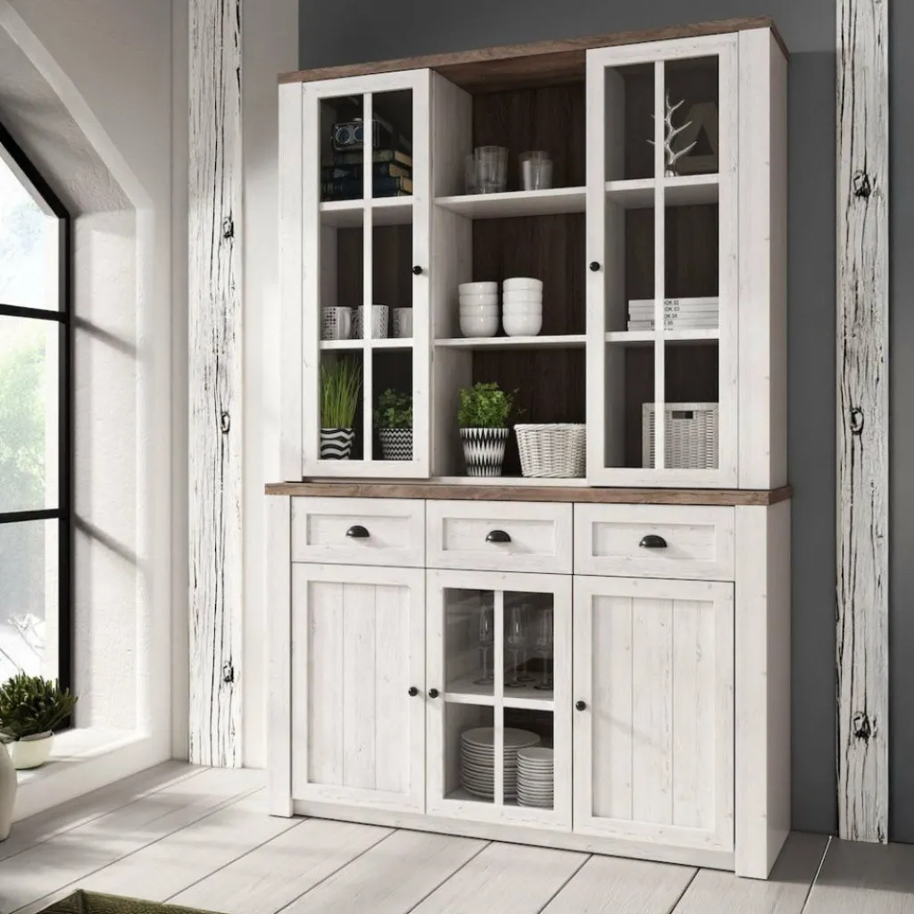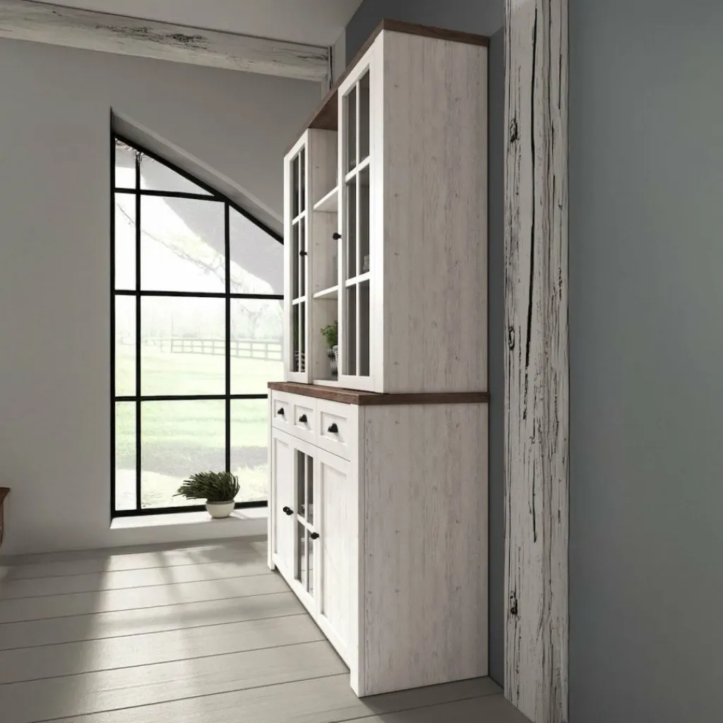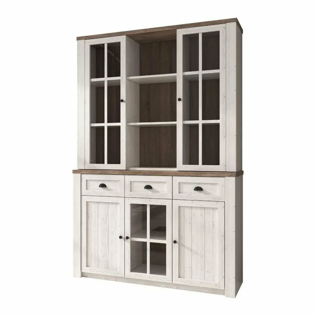 Buffetkast Parello is een staande buffetkast met ruime opbergmogelijkheden. Vanwege zijn landelijke uitstraling is de Parello passend in een landelijke, maar ook industriële of strakke living. De onderkant van de buffetkast beschikt over 3 lades en 3 deuren waarvan er een is voorzien van glas. De handgrepen zijn gemaakt van geborsteld staal en geven de kast een stoere look. Aan de bovenkant zijn 9 schappen geplaatst waarvan de buitenste voorzien zijn van deuren met glas. De buffetkast Parello is 130 cm breed.