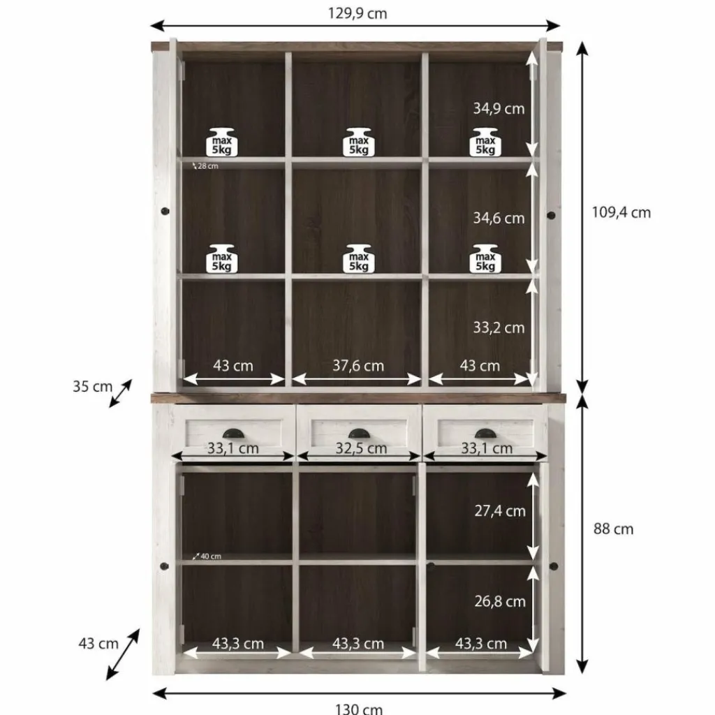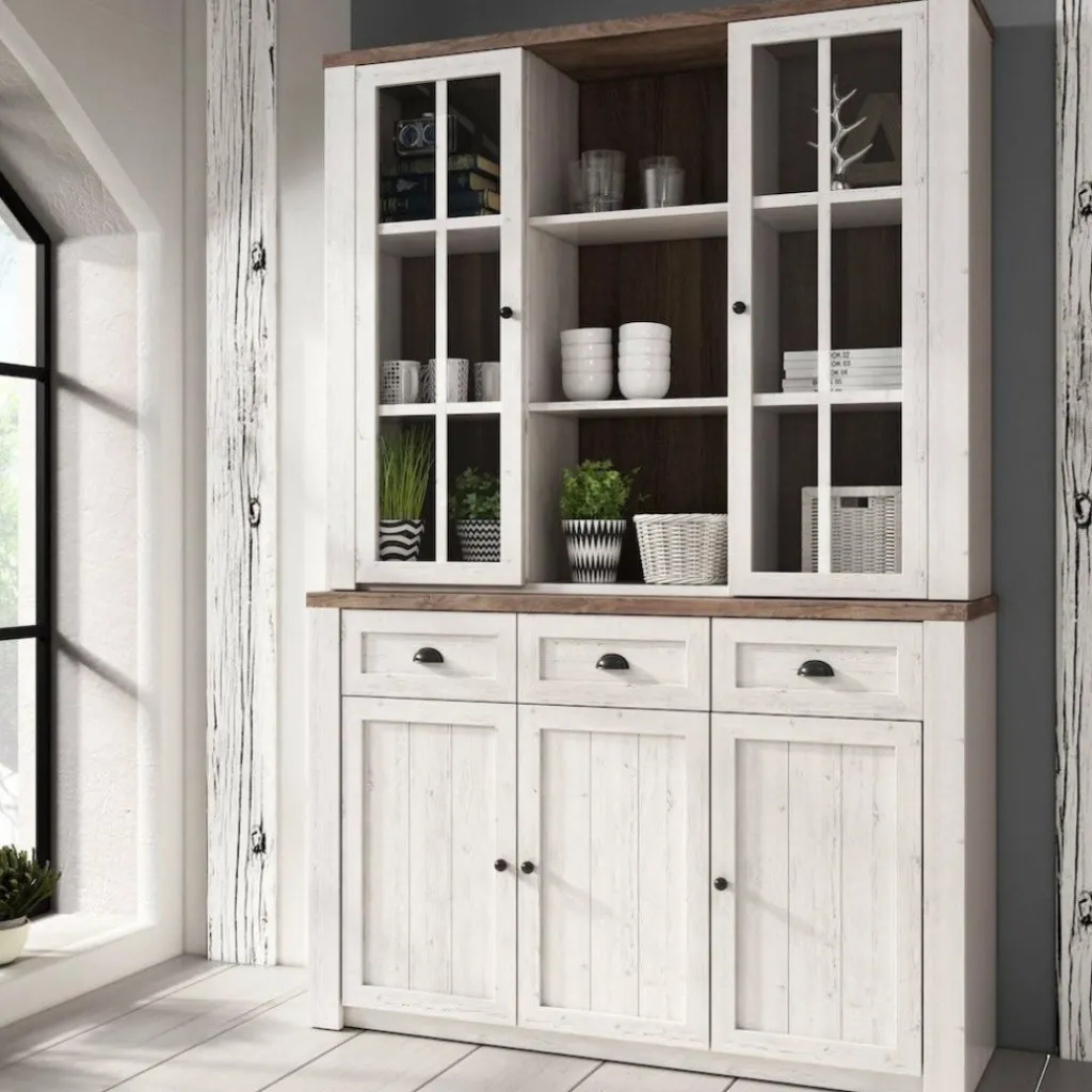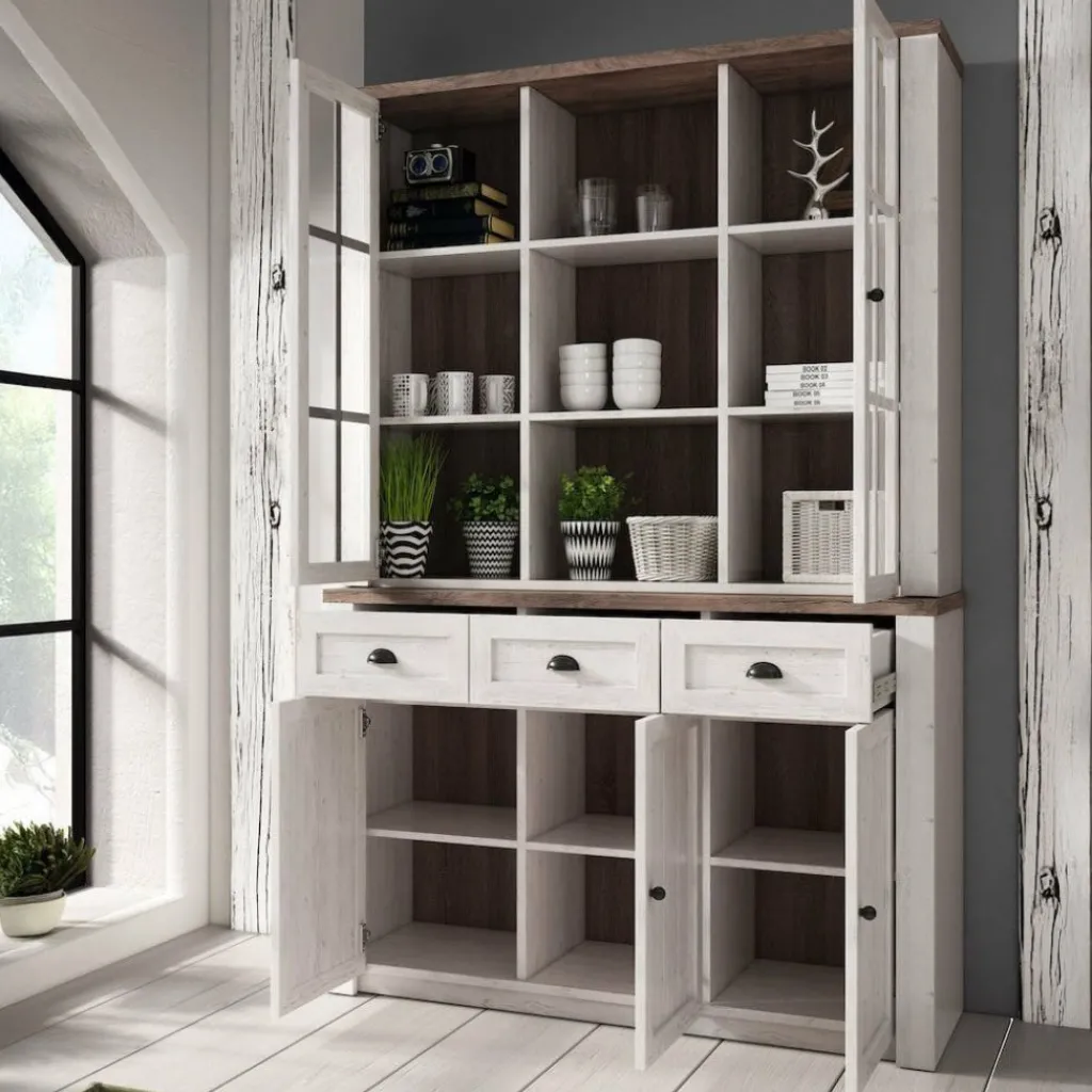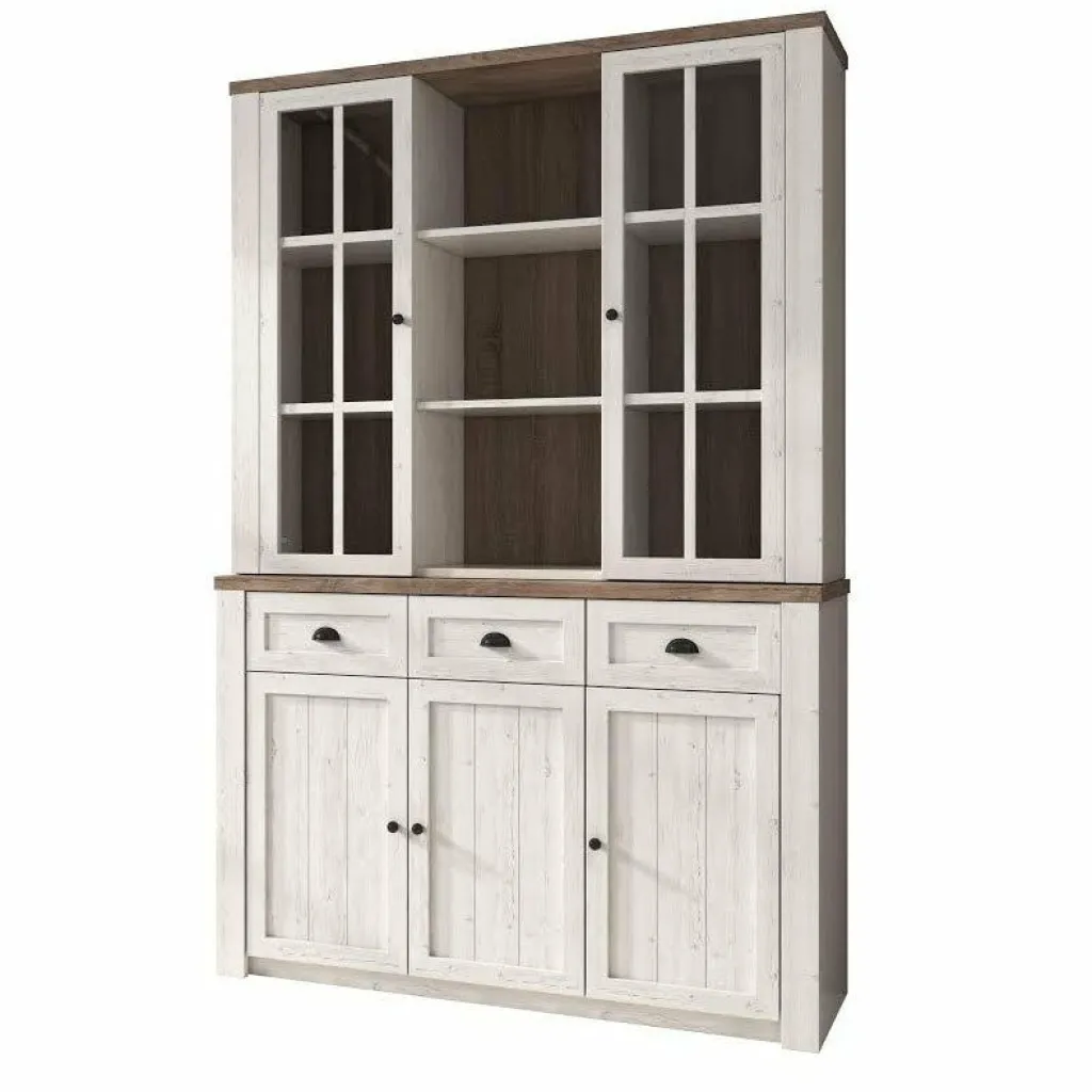 Buffetkast Parello is een staande buffetkast met ruime opbergmogelijkheden. Vanwege zijn landelijke uitstraling is de Parello passend in een landelijke, maar ook industriële of strakke living. De onderkant van de buffetkast beschikt over 3 deuren en 3 lades. De handgrepen zijn gemaakt van geborsteld staal en geven de kast een stoere look. Aan de bovenkant zijn 9 schappen geplaatst waarvan de buitenste voorzien zijn van deuren met glas. De buffetkast Parello is 130 cm breed.
