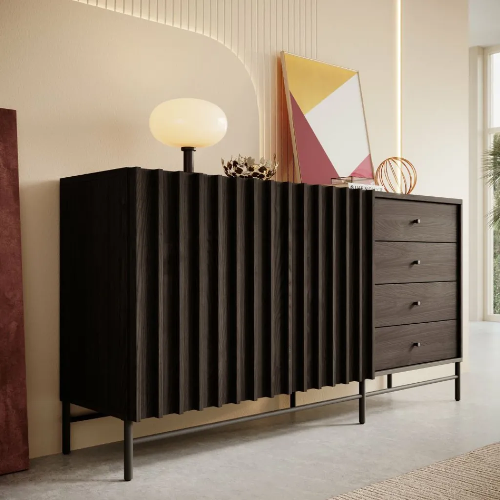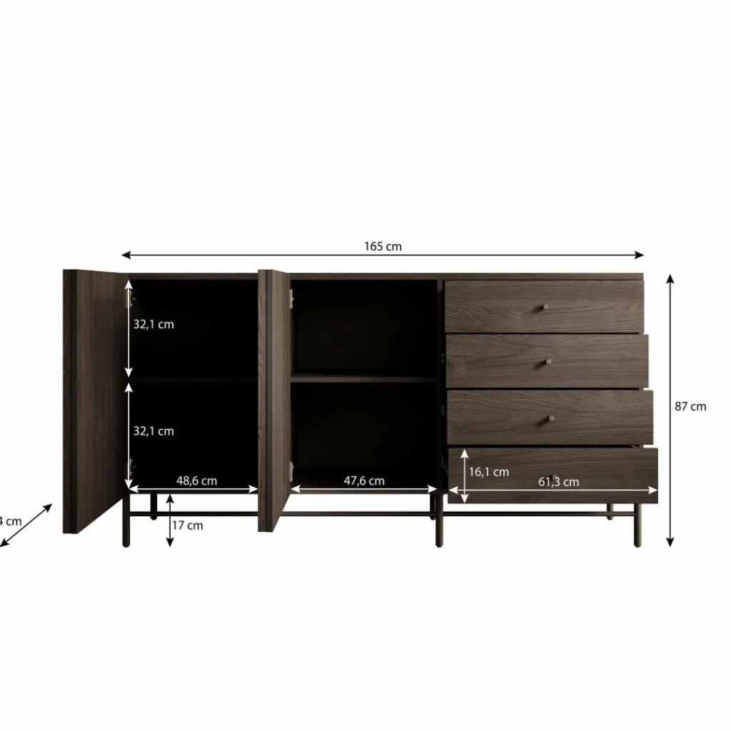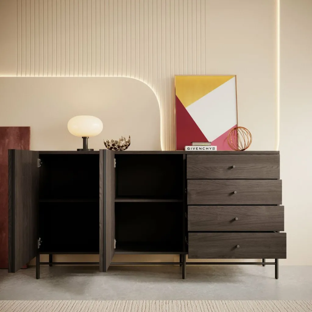 De kast heeft 2 deuren en 4 lades. De deuren openen via verticale grepen en de lades met knoppen. Achter de deuren zitten 4 opbergvakken. Op de voorkant van de deuren zitten latten.