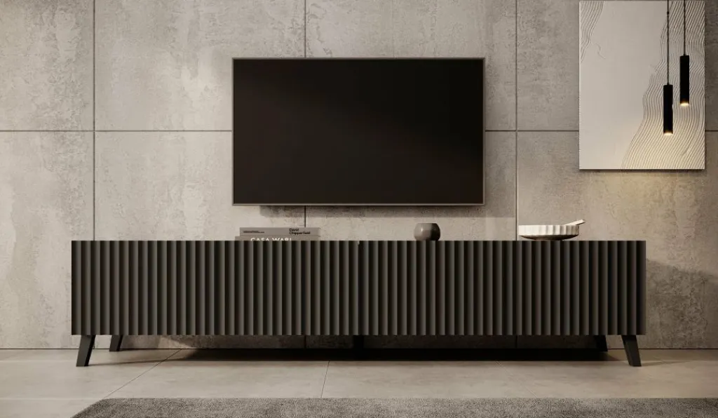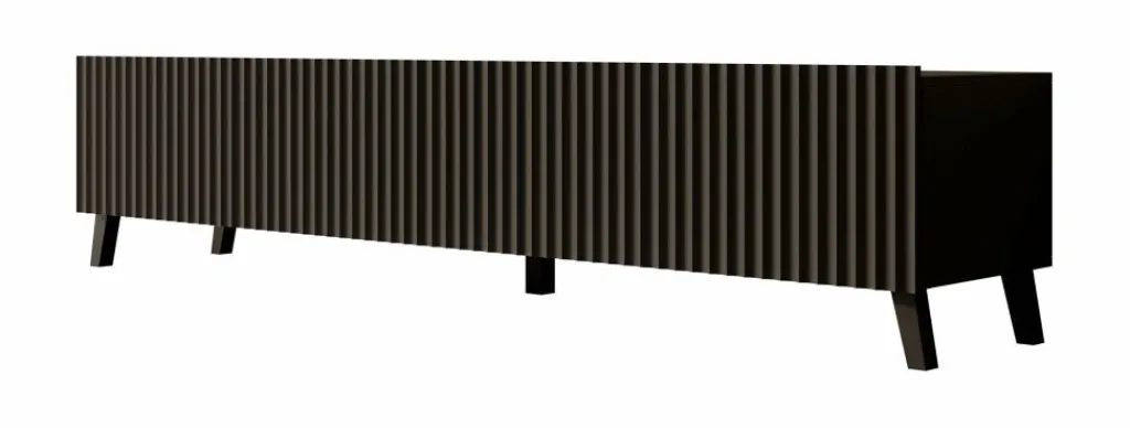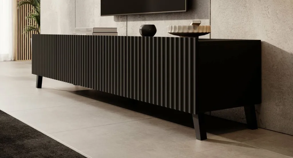TV-meubel Pepinos 2 is een strak vormgegeven meubel in mat zwarte kleur. De kast is voorzien van vier kleppen die aan de bovenzijde openen. Achter de kleppen bevinden zich twee ruime opbergvakken waarin je apparatuur en accessoires netjes kunt opbergen. De voorzijde heeft een verticale lamelstructuur en het meubel staat op zwarte pootjes voor een stabiele plaatsing.