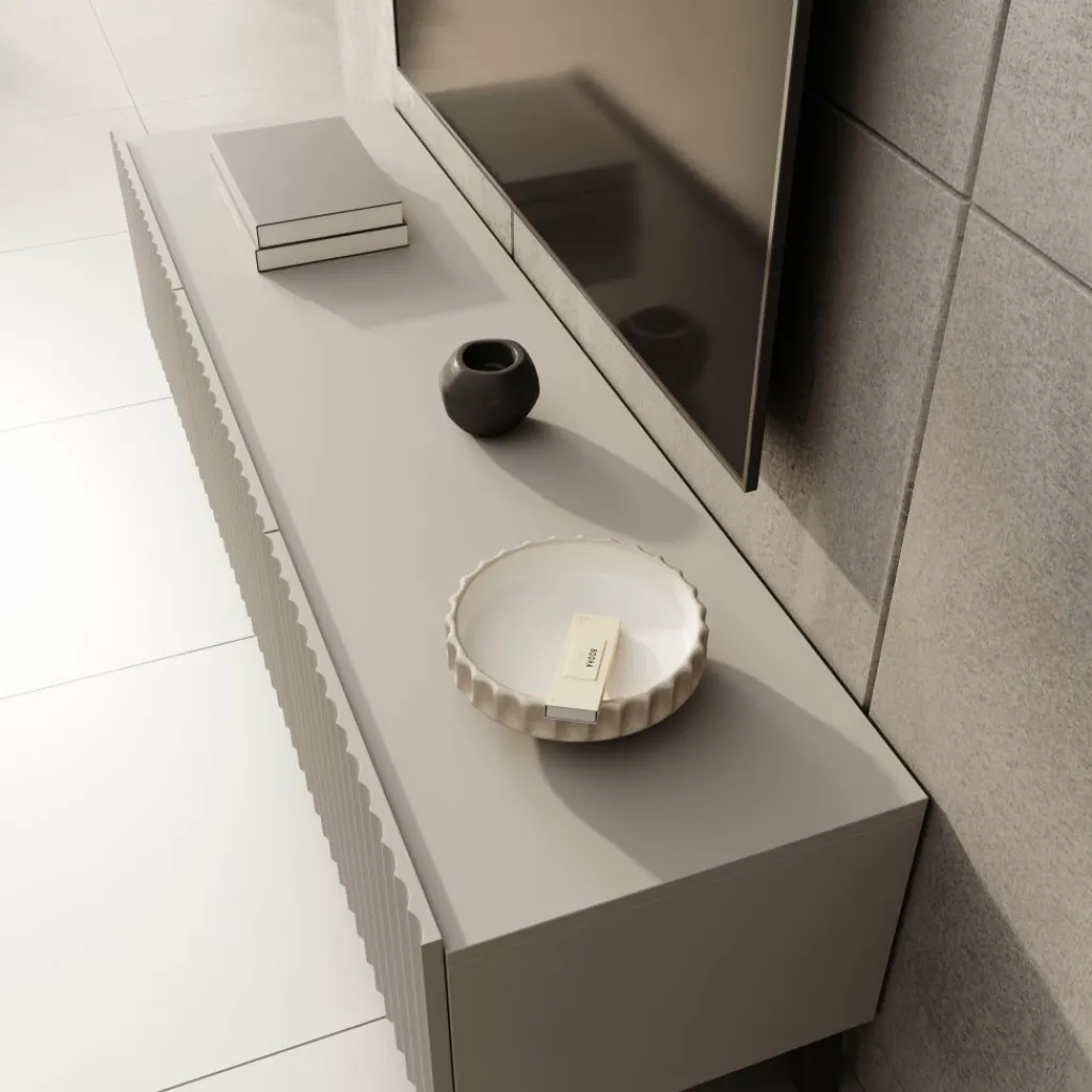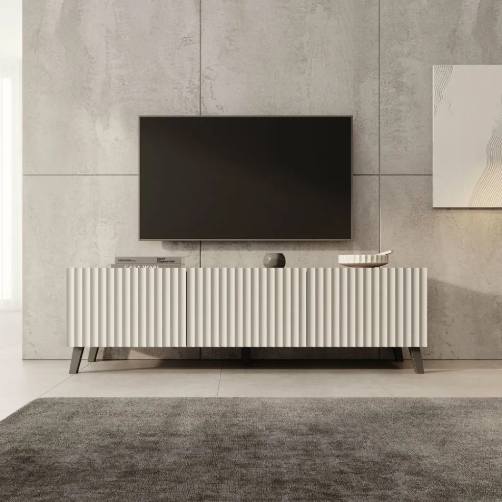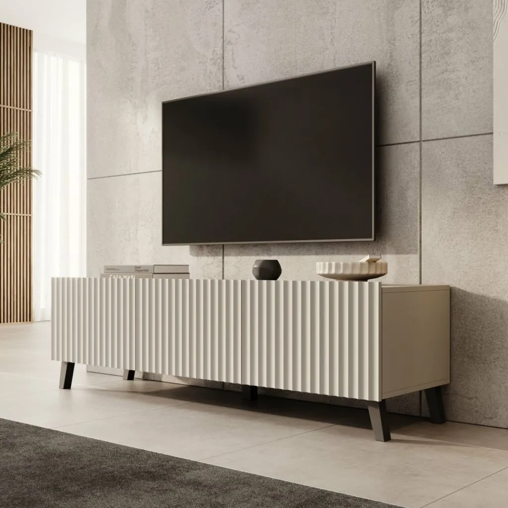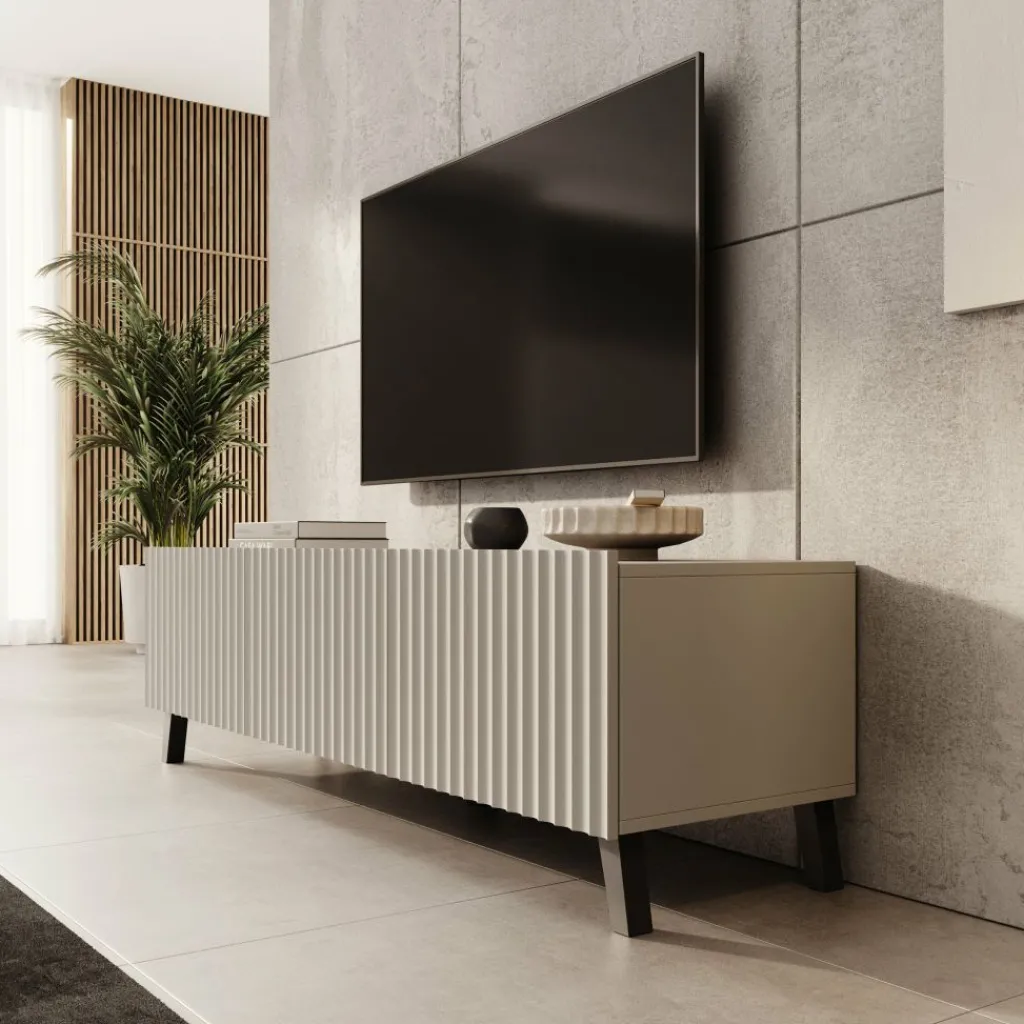 Het TV-meubel Pepinos 2 valt op door de verticale frontpanelen en de rustige beige kleur. De combinatie van strakke lijnen en het ribbelpatroon aan de voorkant zorgt voor een moderne en duidelijke uitstraling die goed aansluit bij uiteenlopende interieurs.