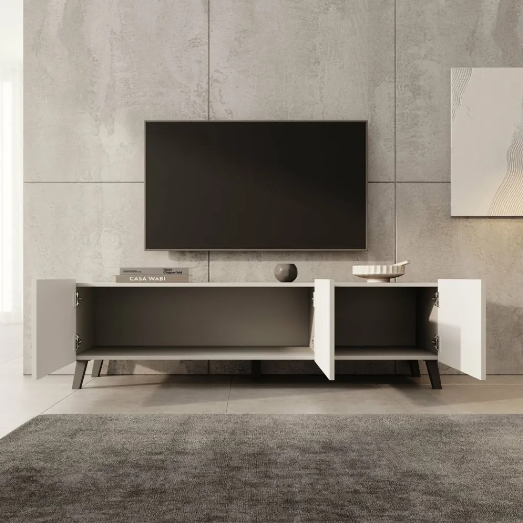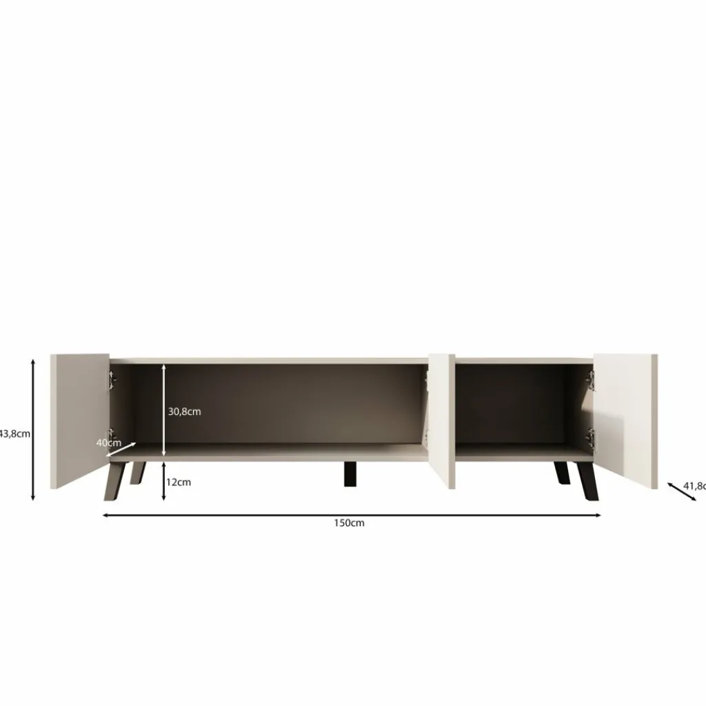 Het meubel heeft drie deuren die toegang geven tot één brede opbergruimte. Hierdoor kun je apparatuur, kabels en accessoires netjes uit het zicht opbergen. De zwarte poten zorgen voor stabiliteit en voegen een subtiel contrast toe aan het ontwerp.