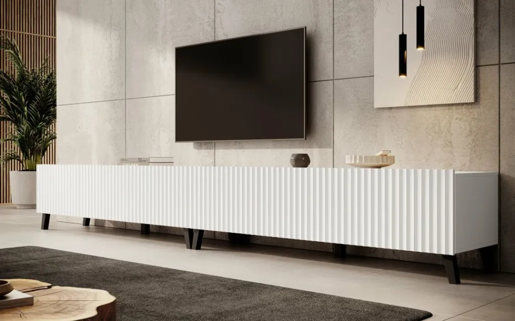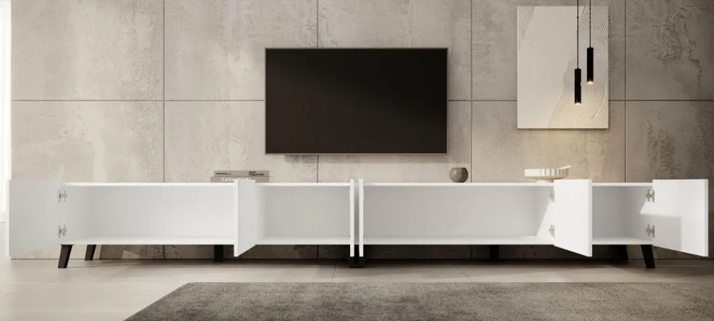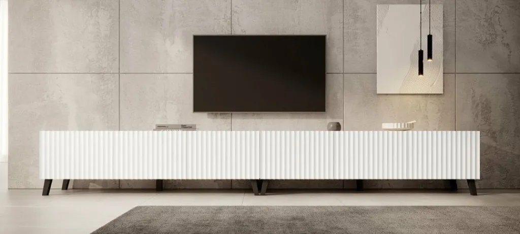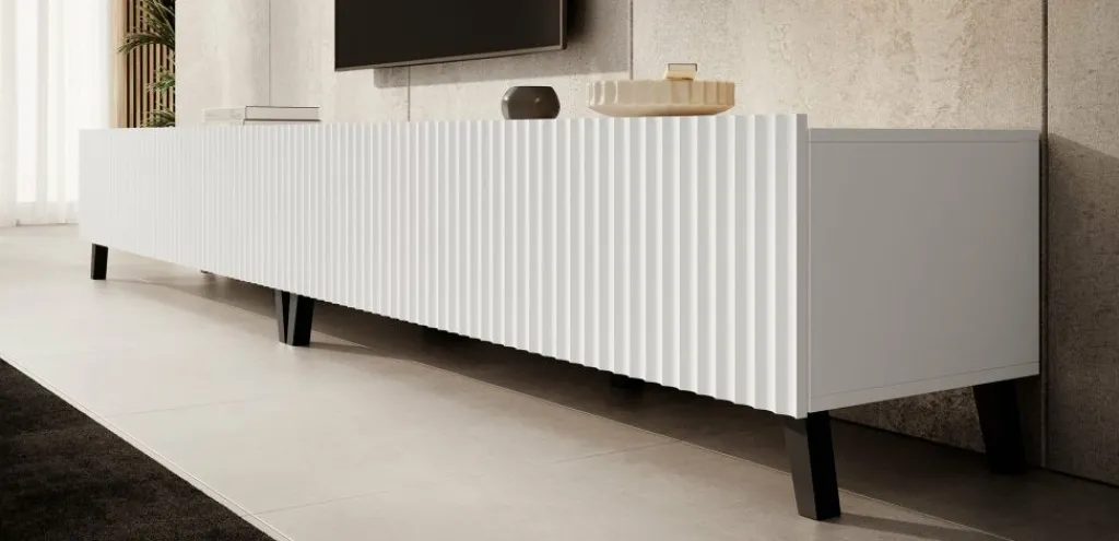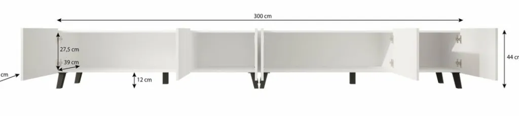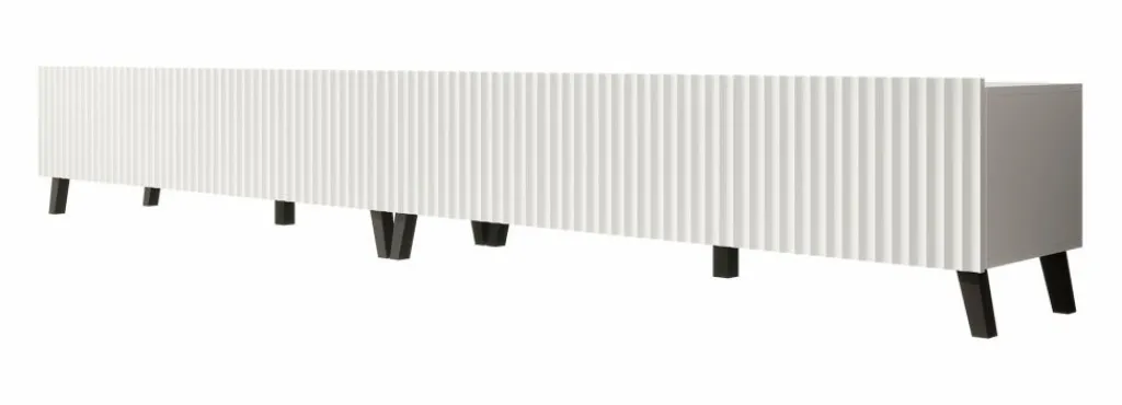 TV-meubel Pepinos 2 is een strak vormgegeven meubel in witte kleur en bestaat uit twee losse kasten van elk 150 cm breed. Iedere kast heeft drie kleppen die aan de bovenzijde openen. Achter de kleppen bevinden zich per kast twee ruime opbergvakken, waardoor je in totaal vier opbergvakken hebt. De voorzijde is uitgevoerd met een verticale lamelstructuur en het meubel staat op zwarte pootjes voor een stabiele plaatsing.