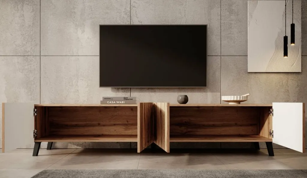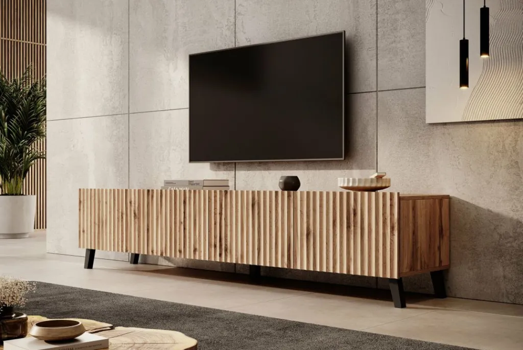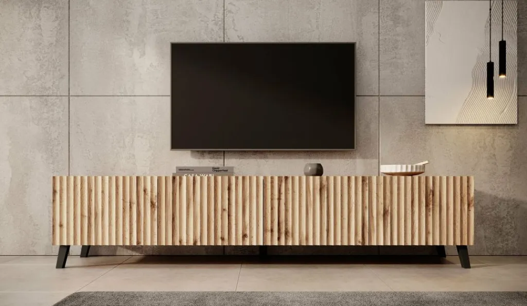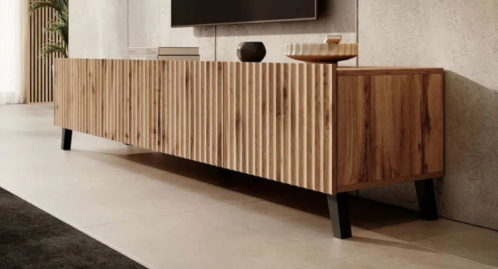 TV-meubel Pepinos 2 is een strak vormgegeven meubel in eiken kleur. De kast is voorzien van vier kleppen die aan de bovenzijde openen. Achter de kleppen bevinden zich twee ruime opbergvakken waarin je apparatuur en accessoires netjes kunt opbergen. De voorzijde heeft een verticale lamelstructuur en het meubel staat op zwarte pootjes, waardoor het geheel stabiel en overzichtelijk blijft.