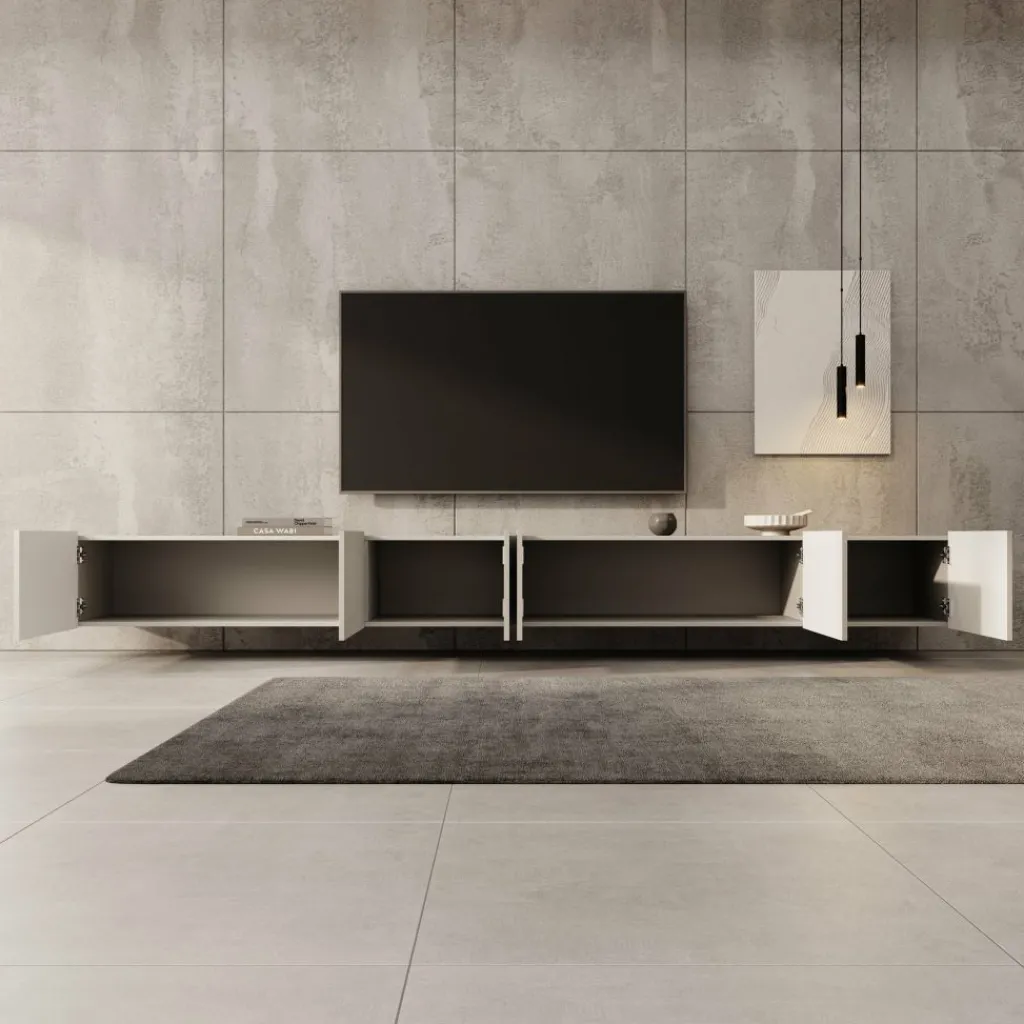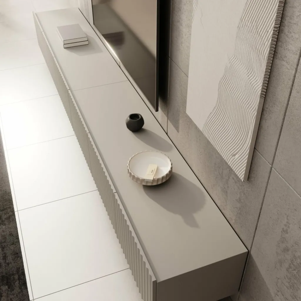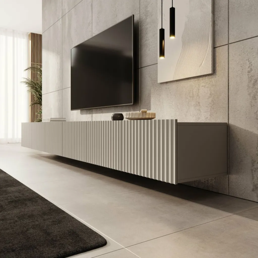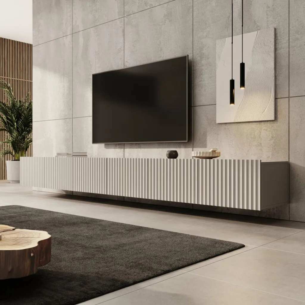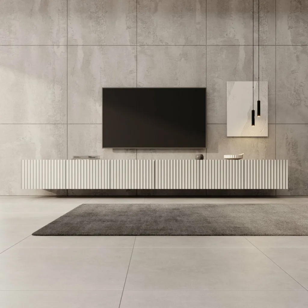 Het front met verticale lijnen sluit goed aan bij moderne interieurs en zorgt voor een strakke, rustige uitstraling. Door de royale breedte kun je naast je televisie ook decoratie of apparatuur een vaste plek geven. De binnenvakken zijn ruim opgezet, zodat je alles praktisch kunt opbergen. Dit model is een logische keuze wanneer je een brede wand wilt voorzien van één strak en consistent meubel.