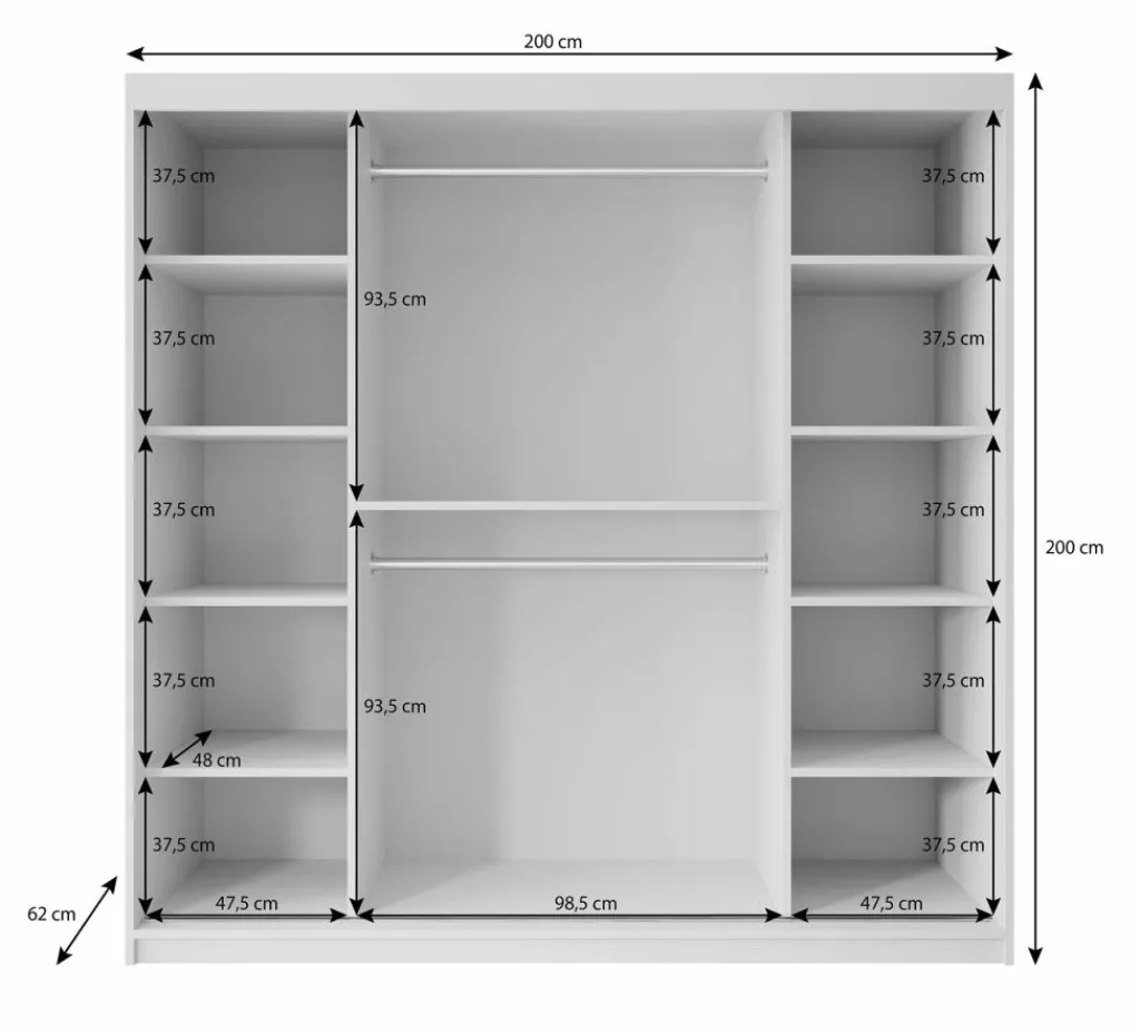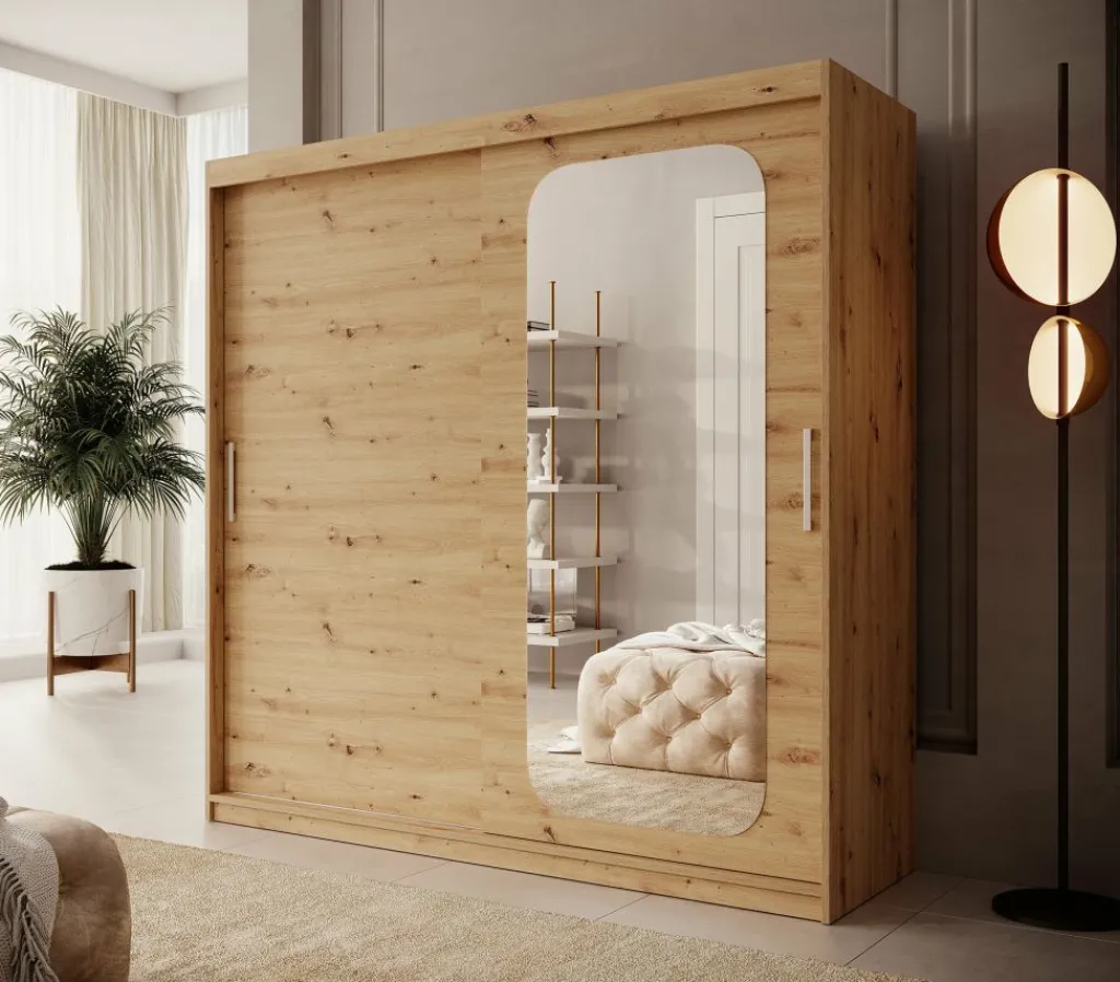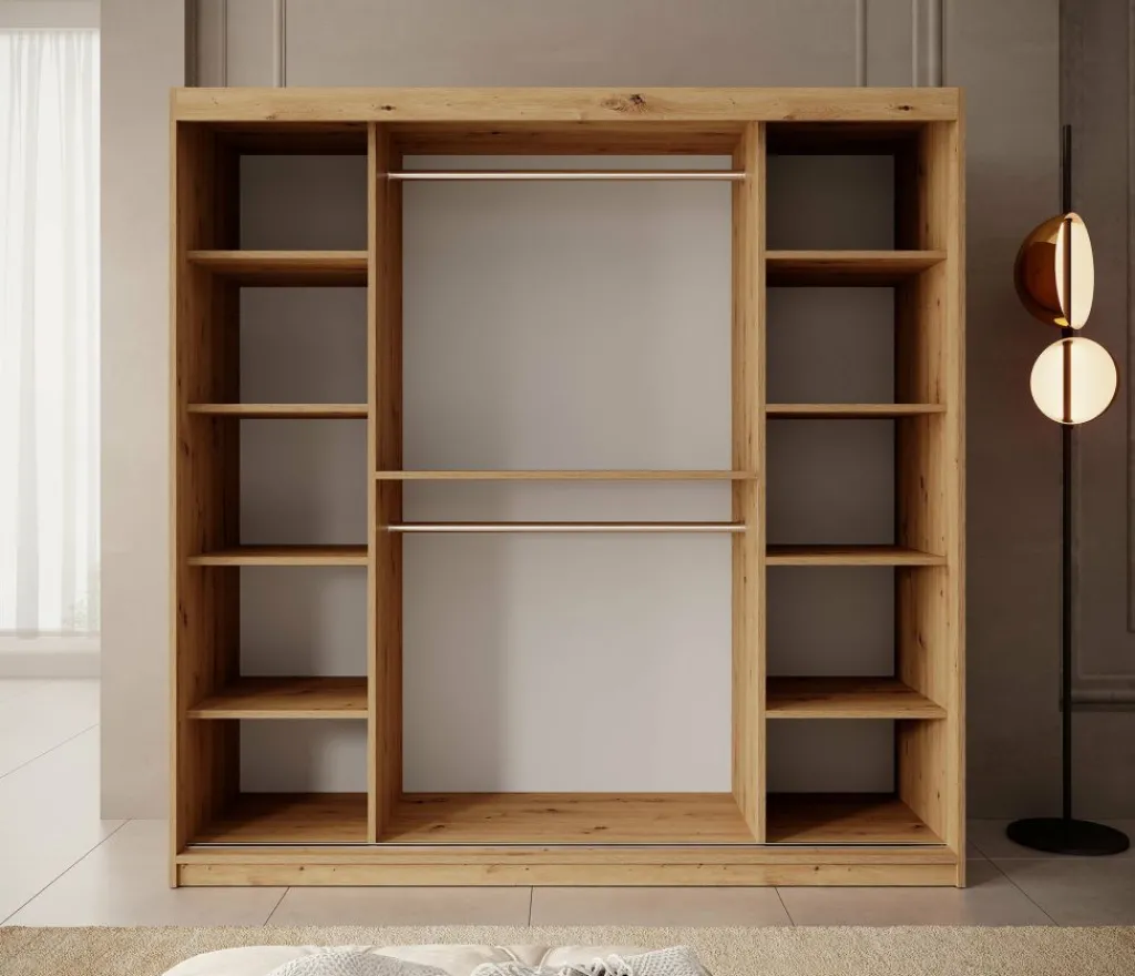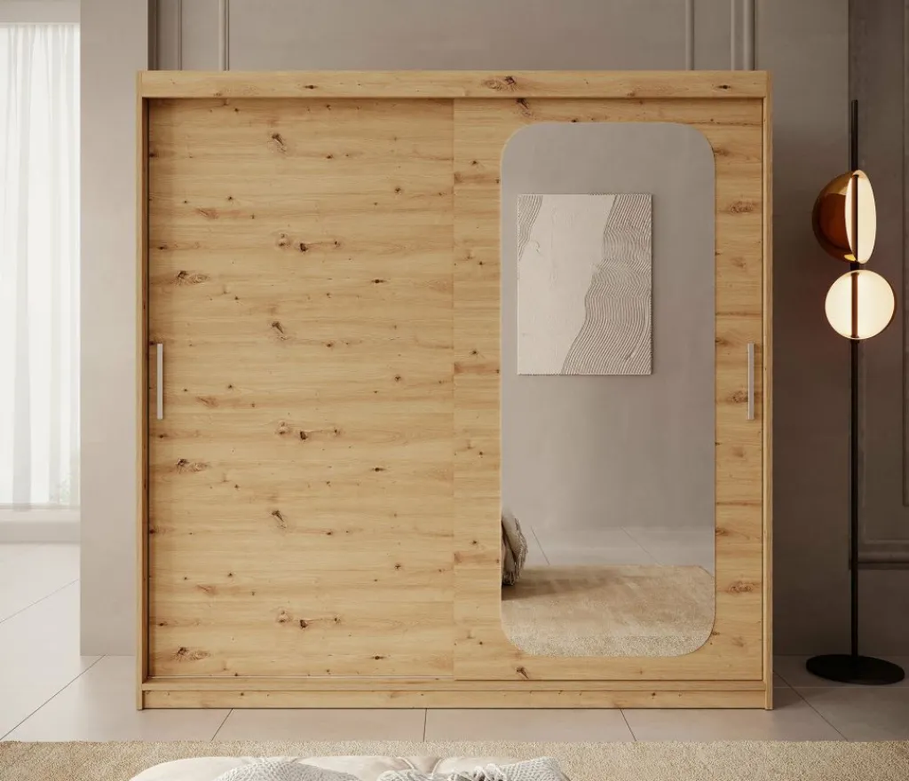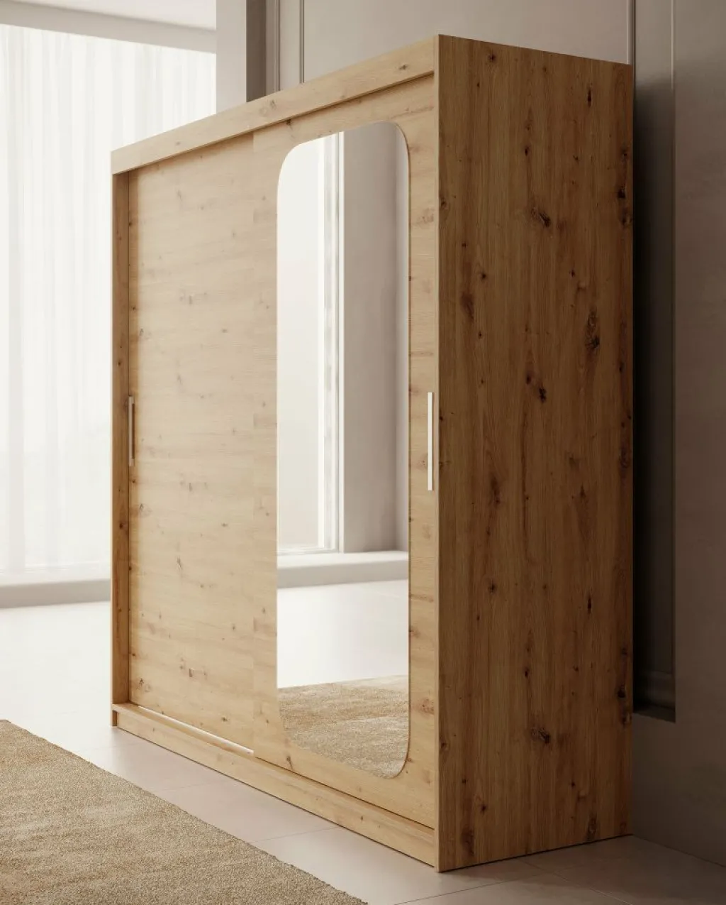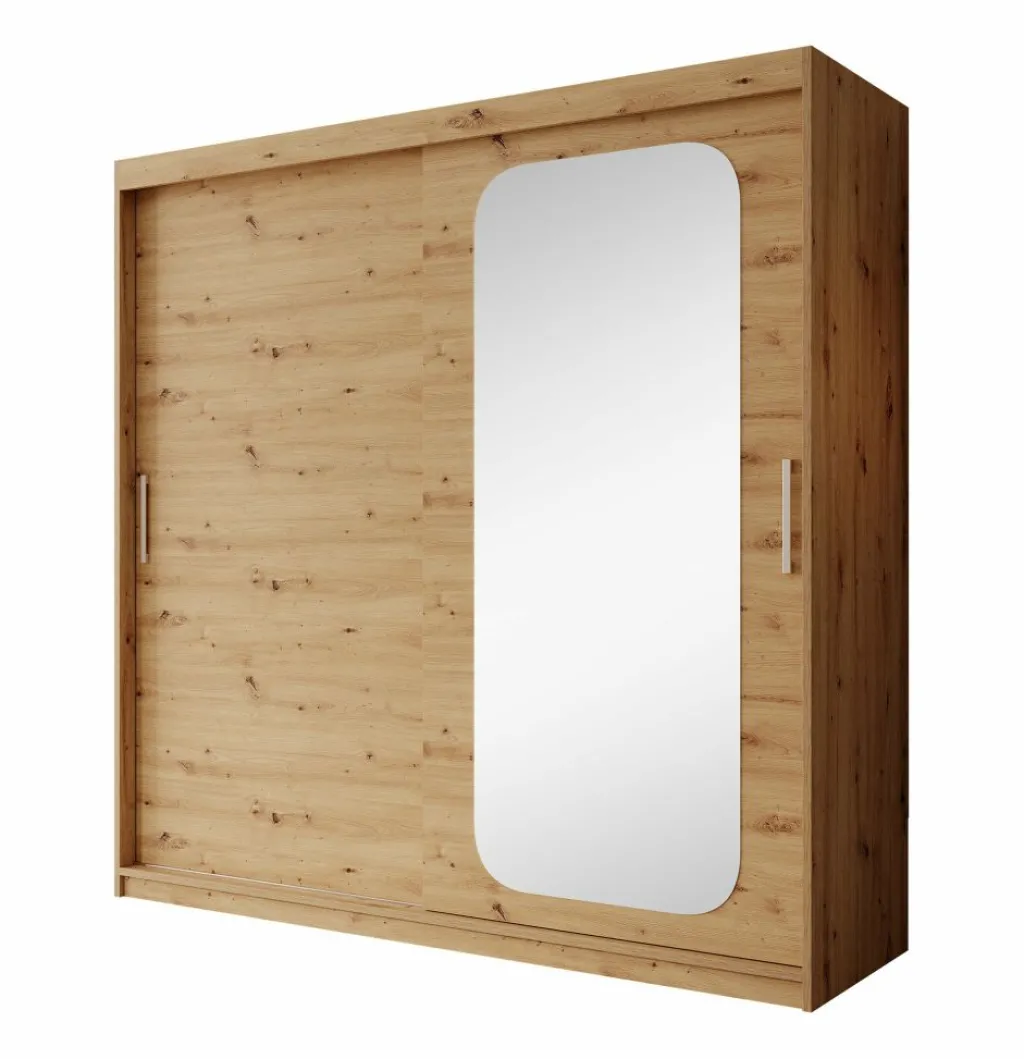 Kledingkast Pete is een garderobekast in de kleur eiken met ruime opbergmogelijkheden. Dit model is voorzien van 2 schuifdeuren. Deze schuifdeuren hebben zilverkleurige handgrepen. De kledingkast heeft op de rechterdeur een handige, speelse spiegel. De binnenkant van de kast bestaat uit 10 opbergvakken en 2 kledingroedes.