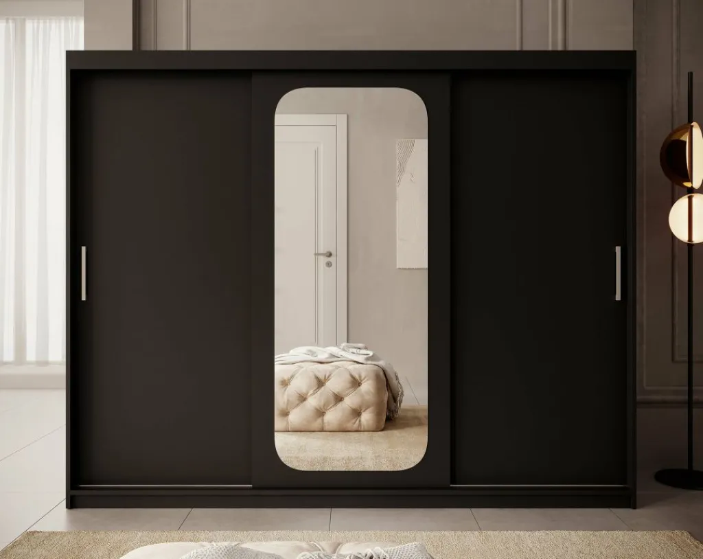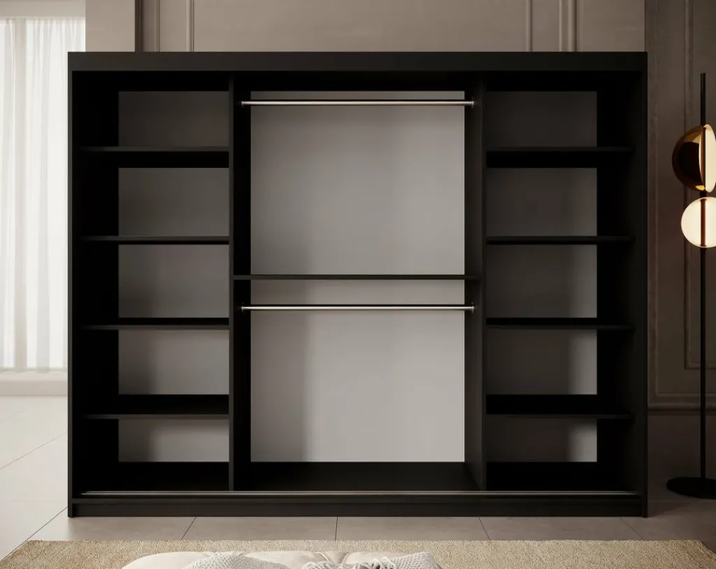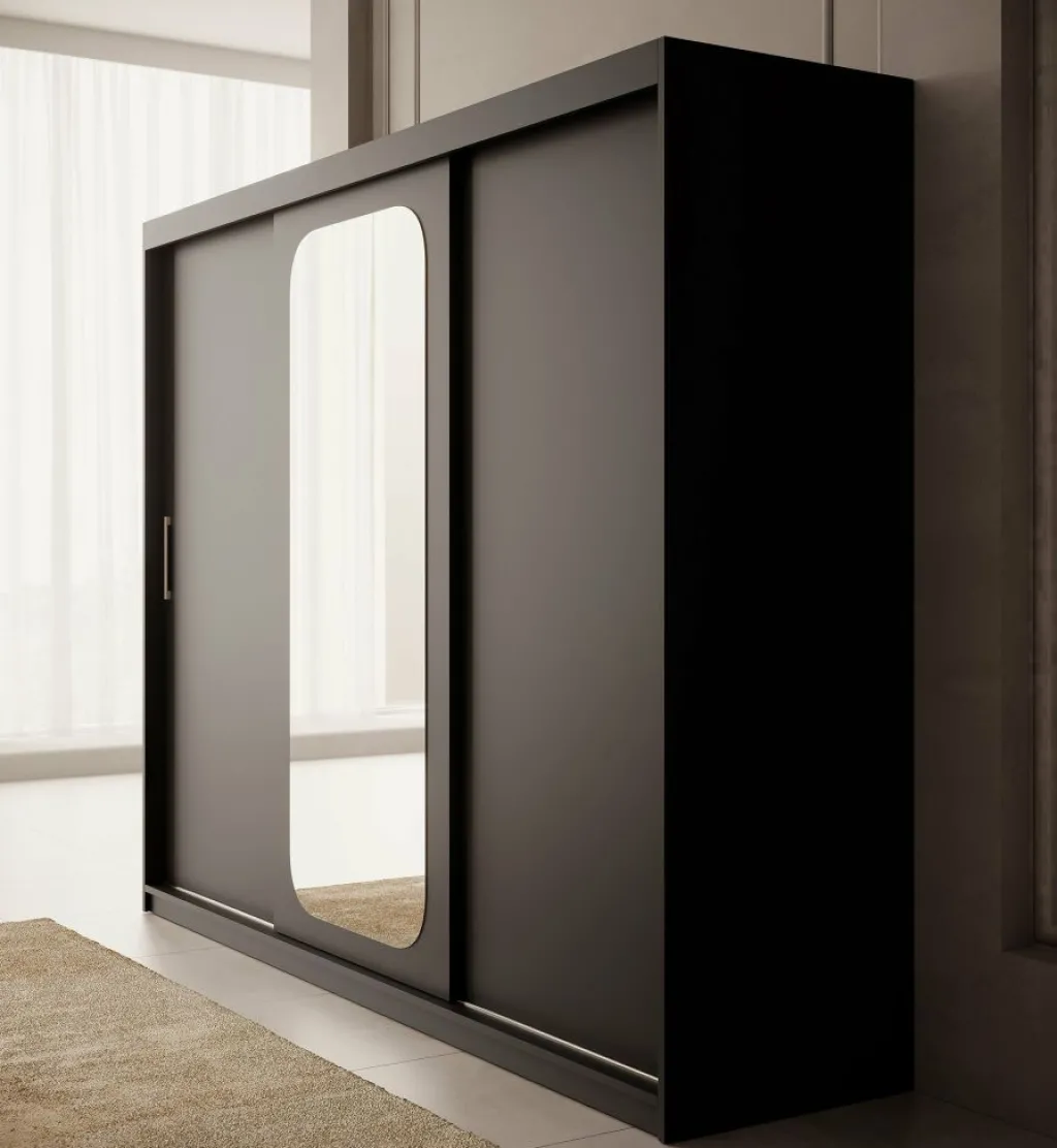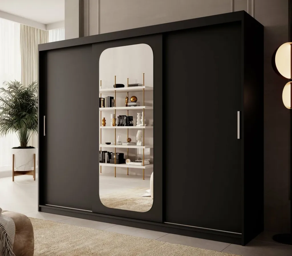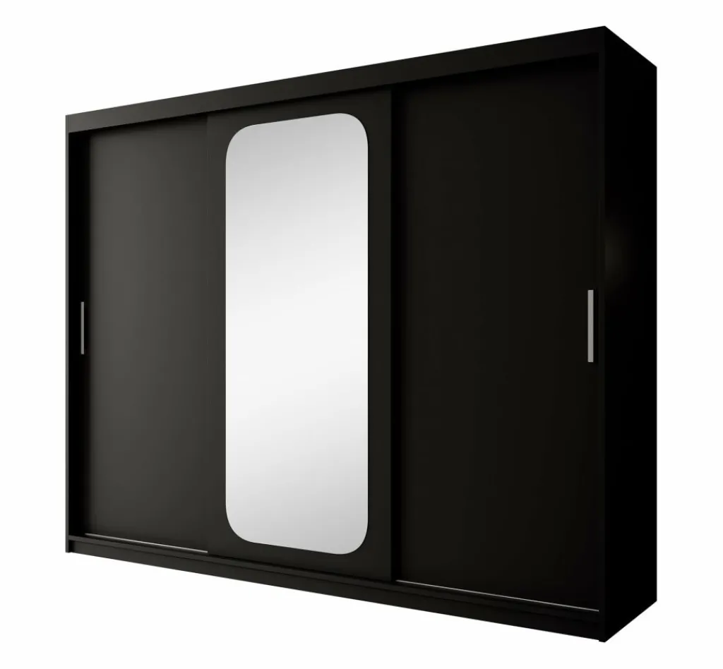 Kledingkast Pete is een garderobekast in de kleur zwart met ruime opbergmogelijkheden. Dit model is voorzien van 3 schuifdeuren. Deze schuifdeuren hebben zilverkleurige handgrepen. De kledingkast heeft op de middelste deur een handige, speelse spiegel. De binnenkant van de kast bestaat uit 10 opbergvakken en 2 kledingroedes.