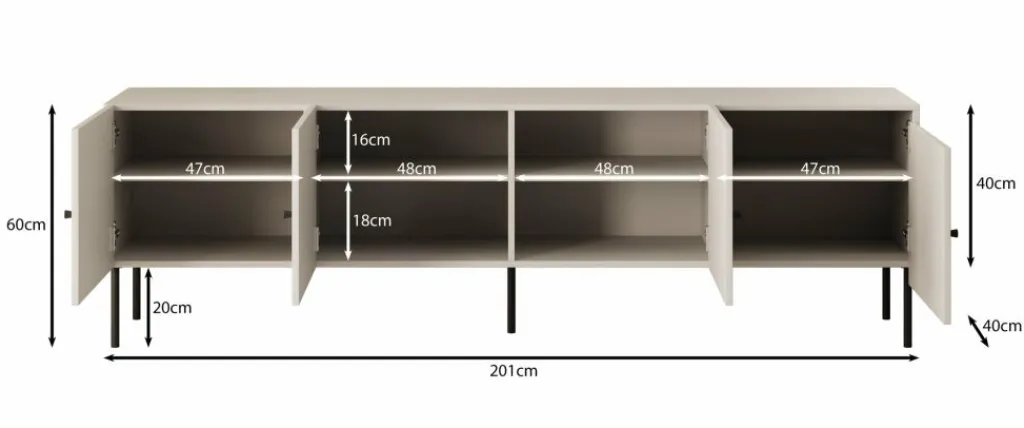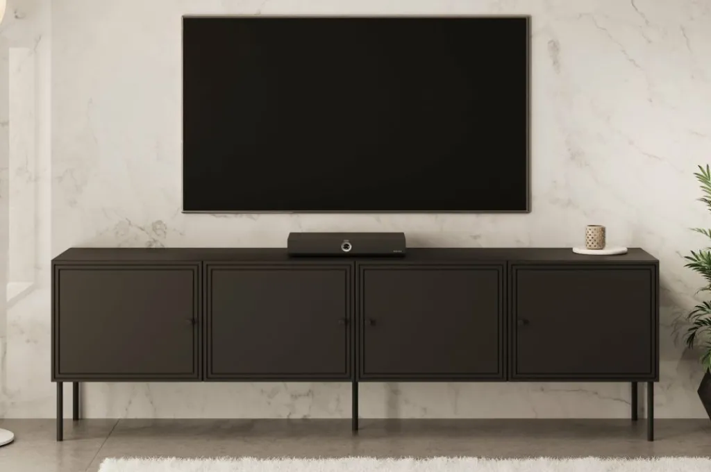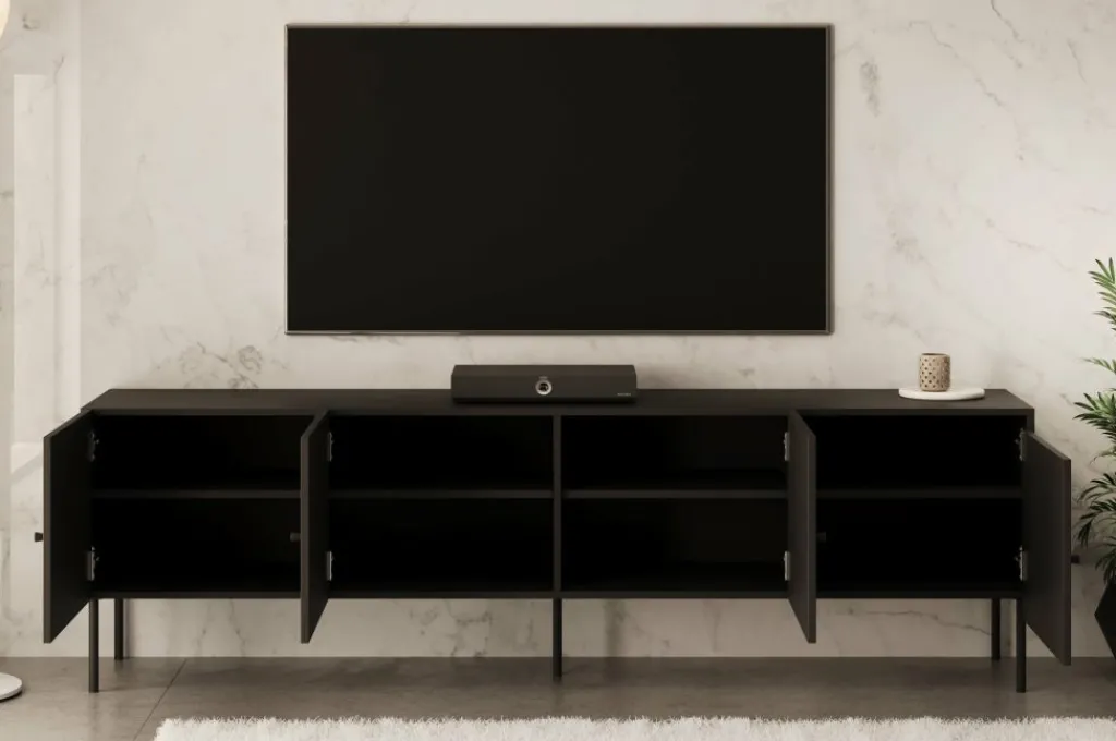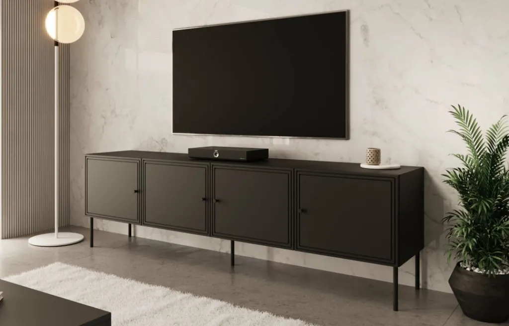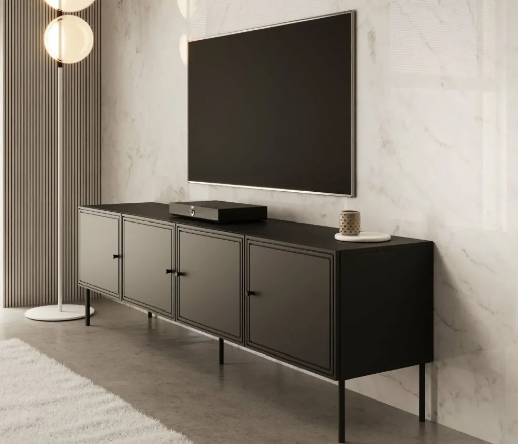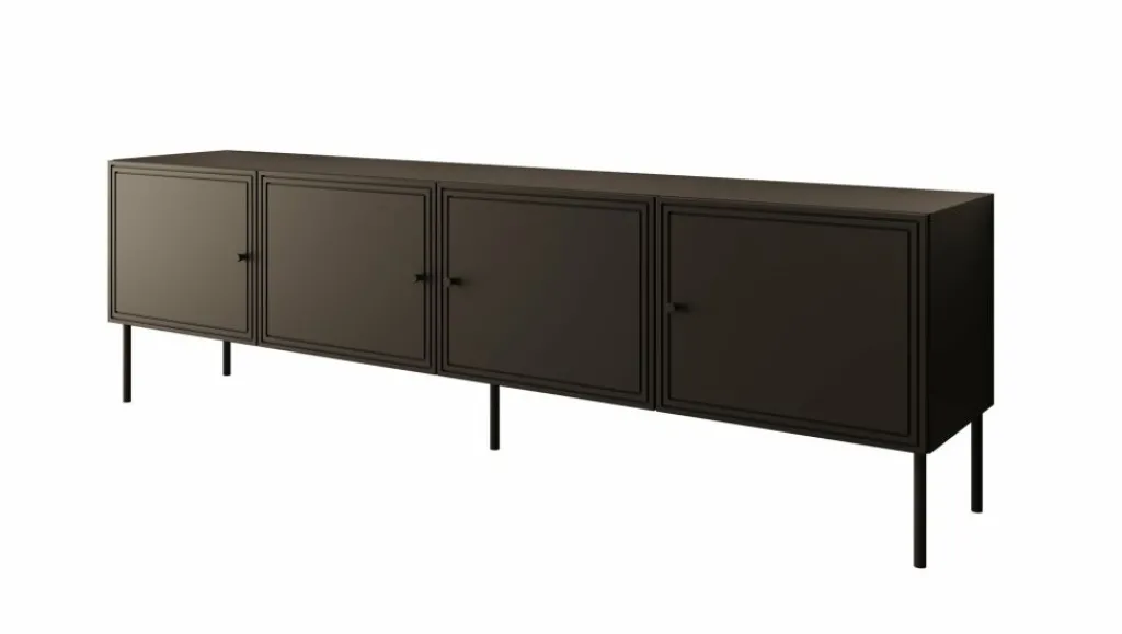 TV-Meubel Pierson is een opbergkast voor onder de tv in een moderne stijl. De TV-kast is gemaakt in een zwarte kleur met eveneens zwarte poten. Deze poten zijn gemaakt van metaal. TV-Meubel Pierson beschikt over 4 deuren die te openen zijn met zwarte knoppen. Achter de deuren zitten in totaal 8 opbergvakken.