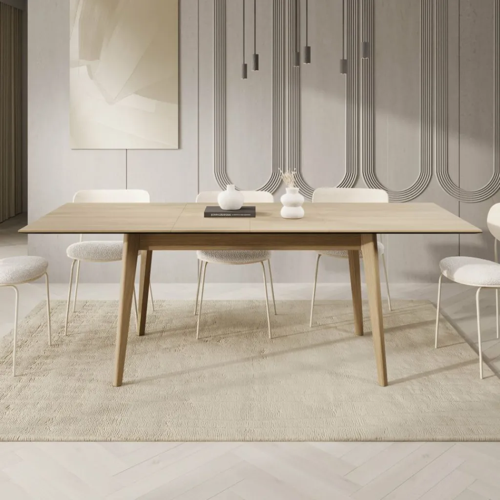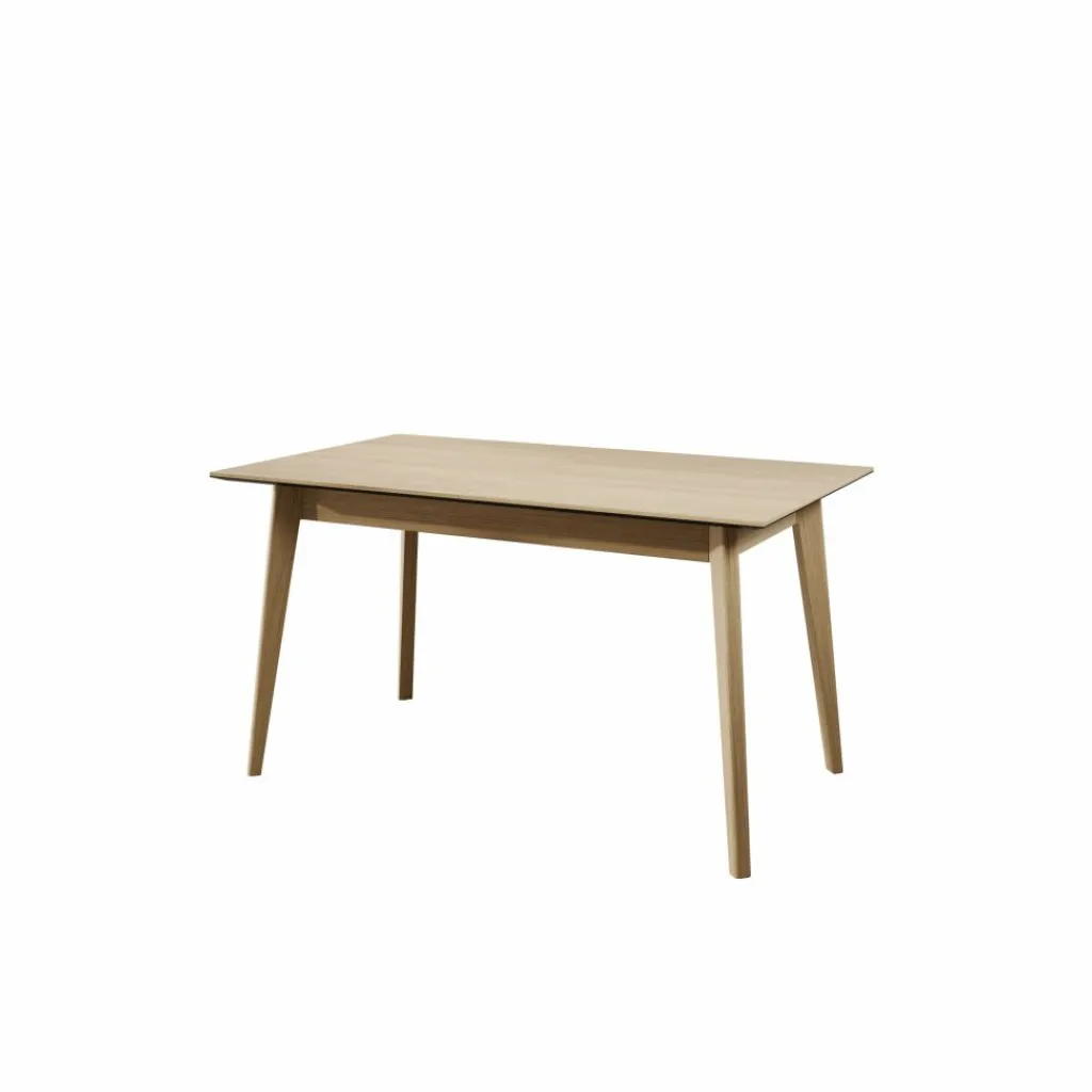 De eetkamertafel Portino is uitgevoerd in licht eikenlook en heeft een afmeting van 145 × 77 × 85 cm. Dankzij het uitschuifbare systeem kan de tafel worden verlengd tot 220 cm, waardoor je eenvoudig extra zitplaatsen creëert wanneer dat nodig is. Dit maakt de tafel geschikt voor zowel dagelijks gebruik als etentjes met meerdere personen.