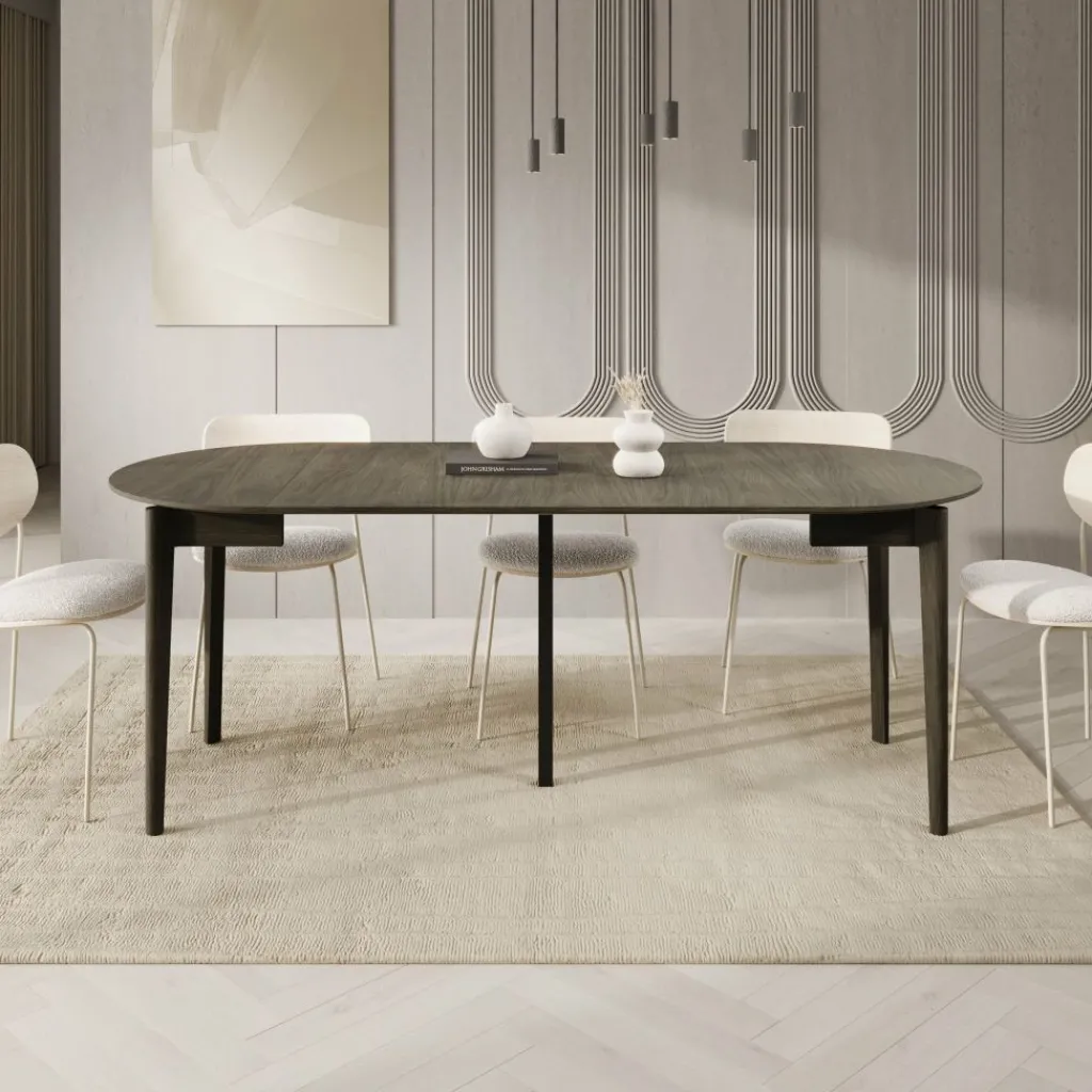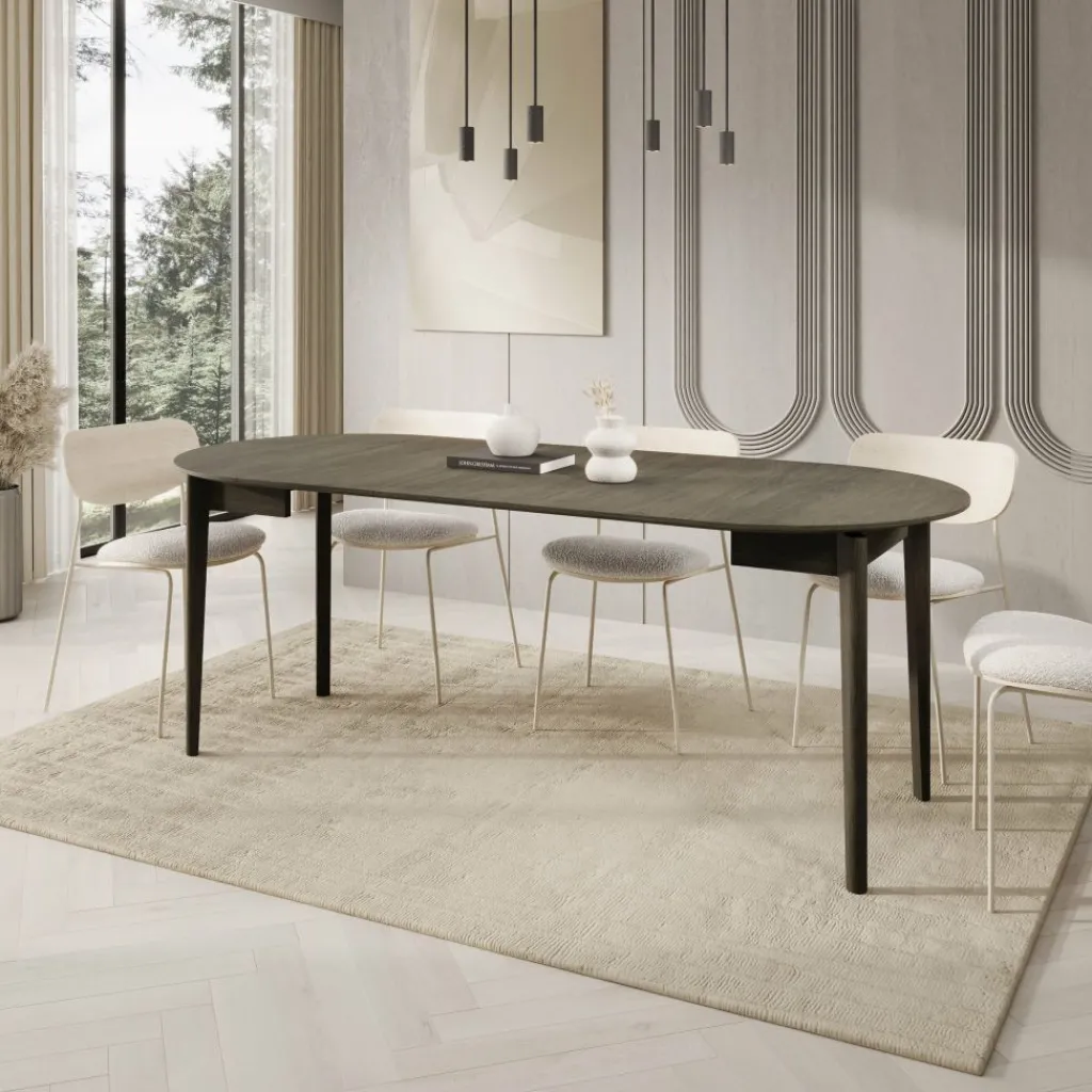 De donker eikenlook afwerking geeft de Portino een strakke en verzorgde uitstraling die goed aansluit bij moderne eetkamers. Door de compacte beginmaat en de ruime verlengmogelijkheid is deze tafel praktisch en flexibel in gebruik.