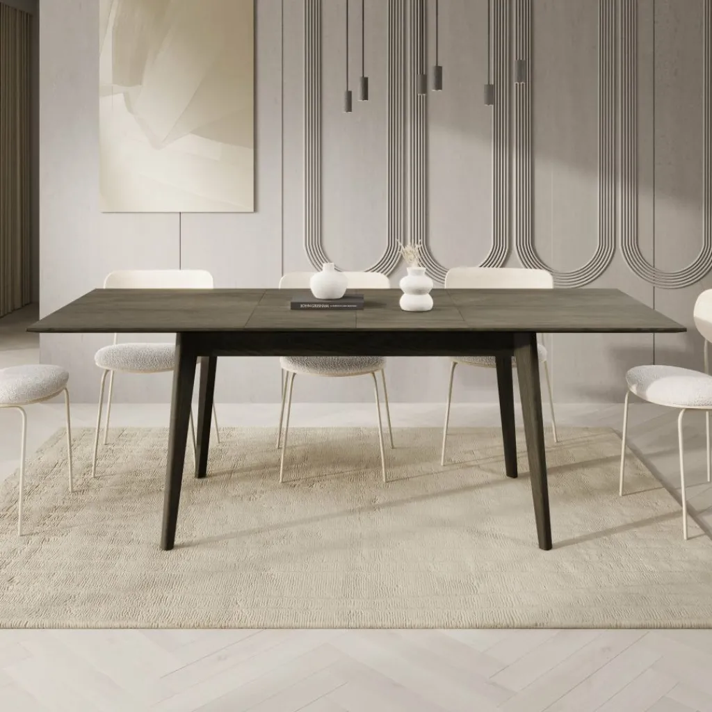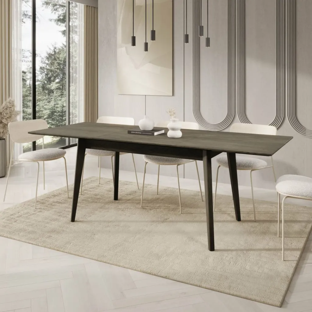 De donker eikenlook afwerking geeft de Portino een duidelijke en strakke uitstraling die goed past in moderne en eigentijdse eetkamers. De rechte vormgeving en solide poten zorgen voor voldoende ruimte en een stevige basis in zowel gesloten als uitgeschoven stand.