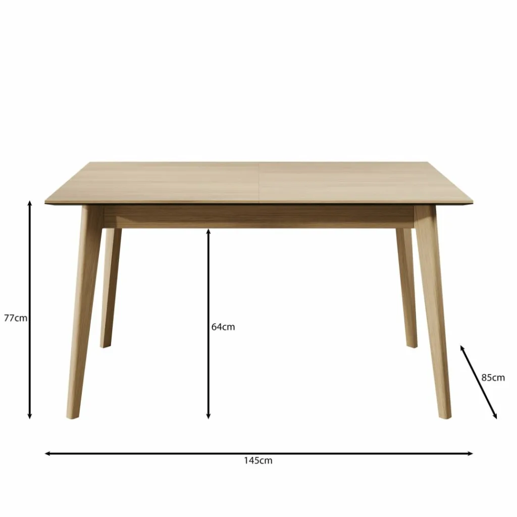 De eetkamertafel Portino is uitgevoerd in donker eikenlook en heeft een afmeting van 145 × 77 × 85 cm. Dankzij het uitschuifbare systeem kan de tafel worden verlengd tot 220 cm, waardoor je eenvoudig extra zitplaatsen creëert wanneer dat nodig is. Dit maakt de tafel geschikt voor zowel dagelijks gebruik als etentjes met meerdere personen.
