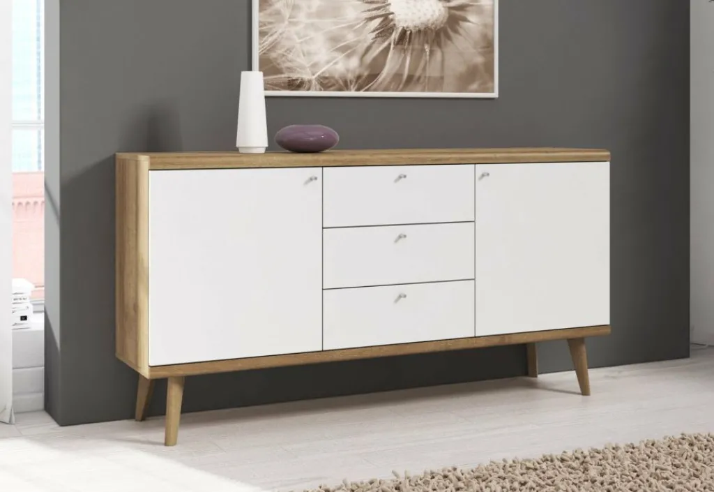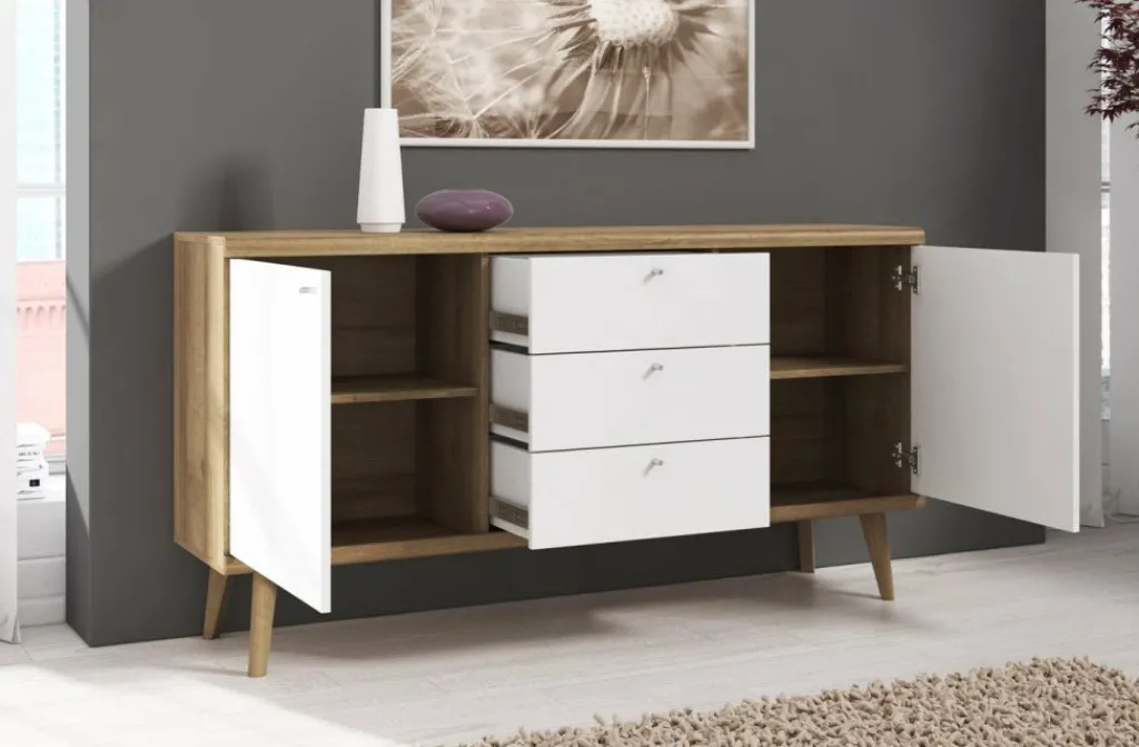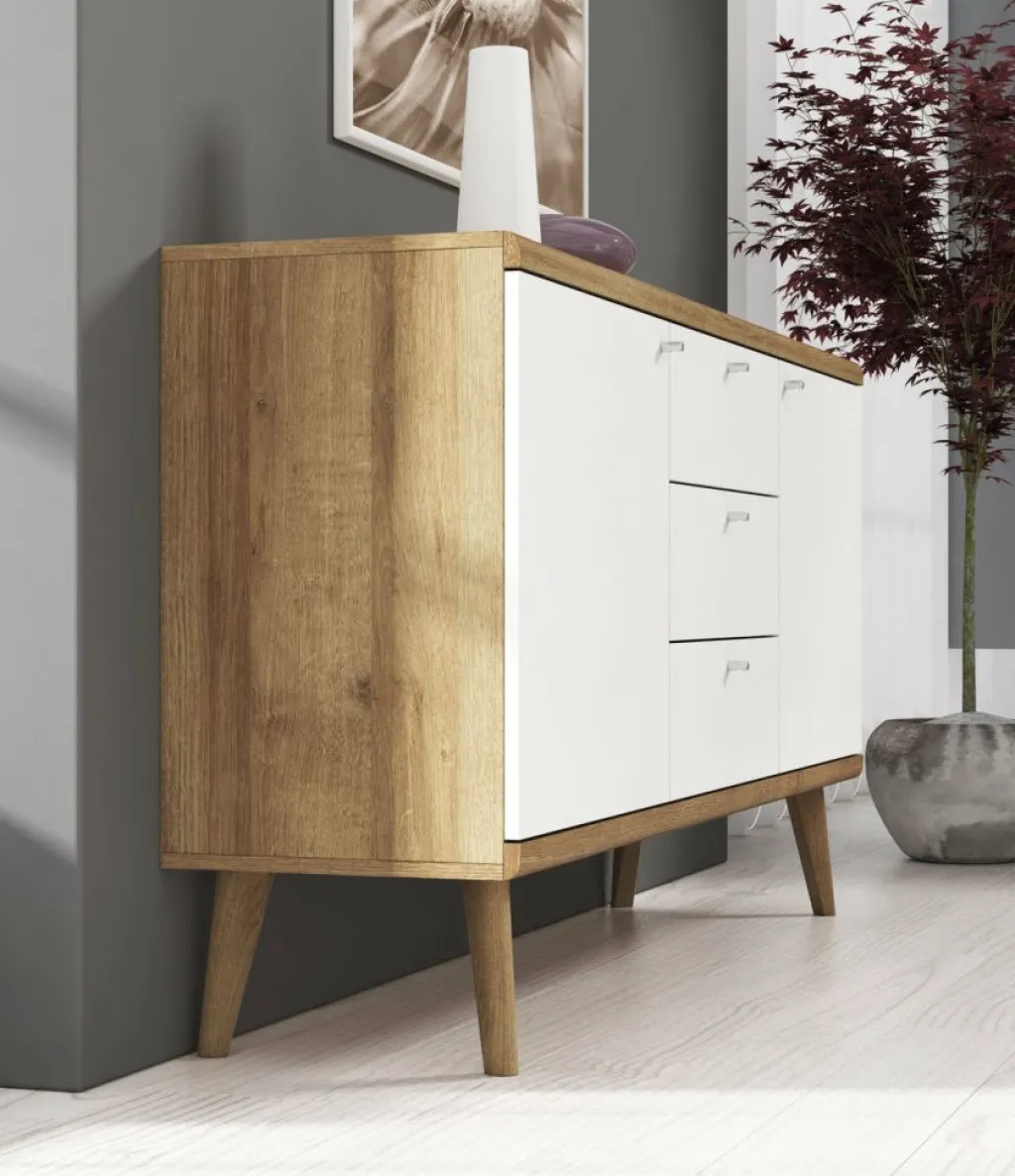 Dressoir Primavera is een praktisch dressoir met voldoende opbergruimte en een moderne look. De gehele kast is uitgevoerd in een neutrale licht eiken kleur met mat witte deuren en lades. Dit meubel is voorzien van twee deuren met daarachter voldoende opbergruimte middels een legplank. In het midden bevinden zich drie handige lades. De kast staat op schuine pootjes. Deze poten kunnen iets lichter of juist donkerder van kleur zijn in vergelijking met de rest van het meubel aangezien deze gemaakt zijn van hout. Dressoir Primavera is onderdeel van een uitgebreid woonprogramma waarmee je een compleet nieuwe sfeer in huis kan creëren. Door het neutrale kleurgebruik is dit meubel geschikt voor iedere stijl interieur.